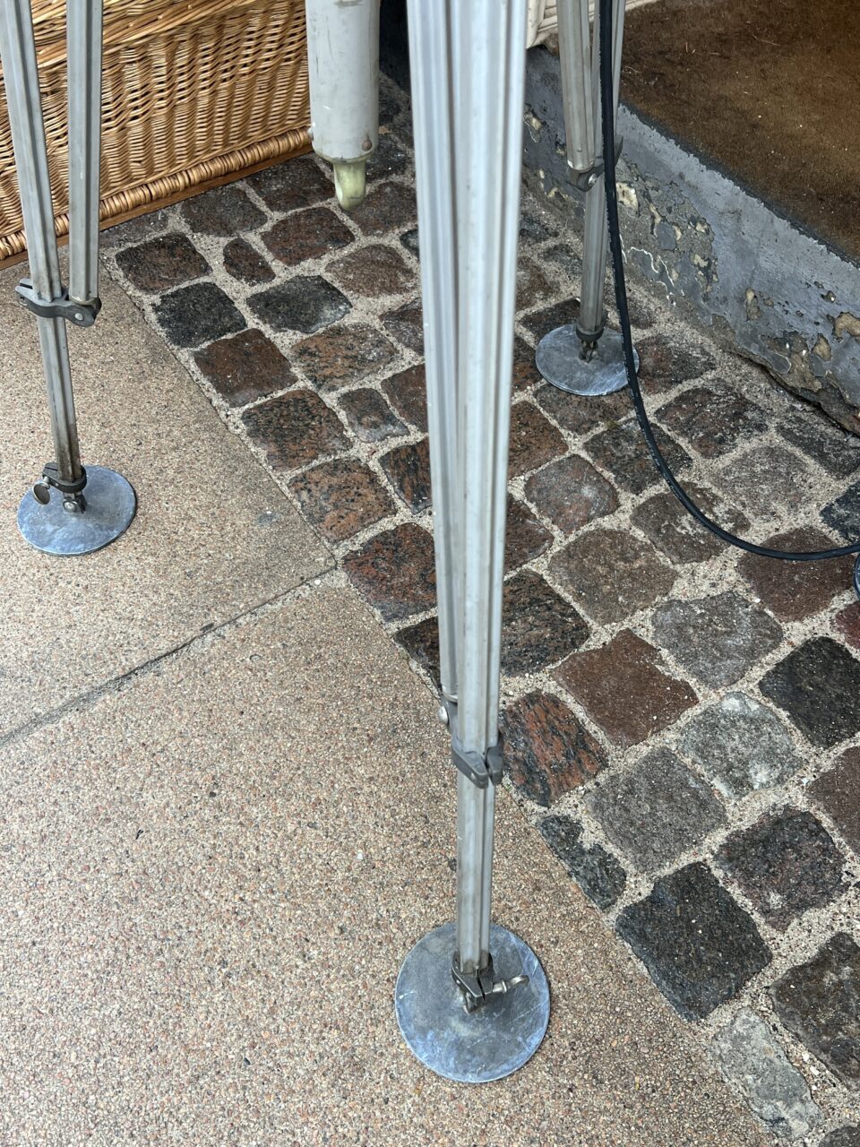 Projektøren er fremstillet i børstet aluminium og monteret på et kraftigt justerbart trefodsstativ i stål, hvilket giver den et både robust og elegant udtryk.