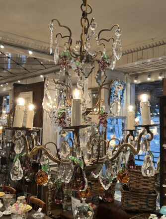 Fransk burformet prismekrone fra omkring år 1900, med smukke faceslebet prismer i forskellige størrelser.