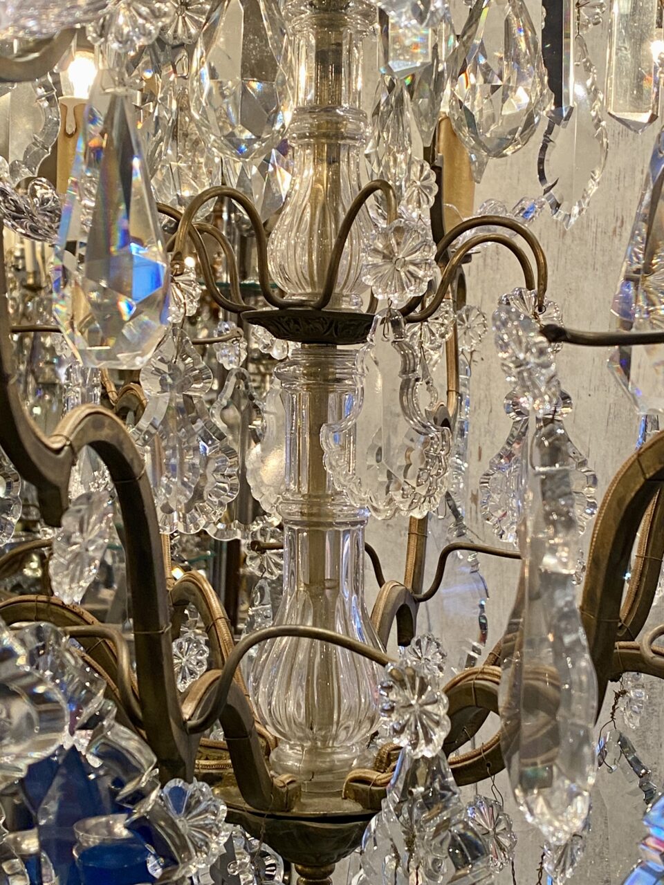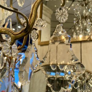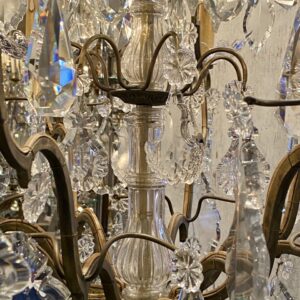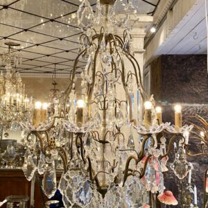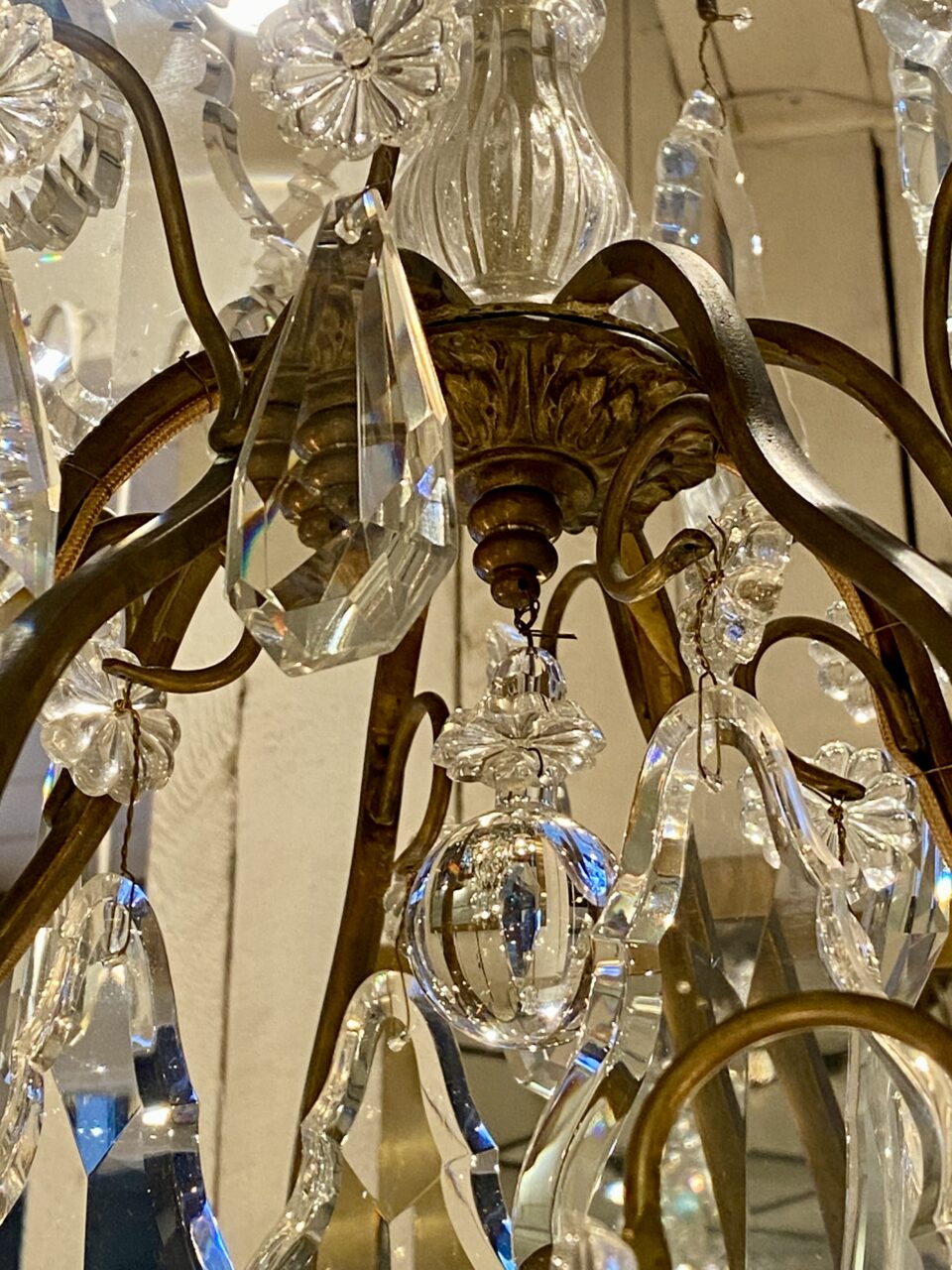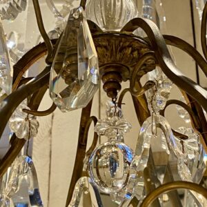 Stor gammel fransk burformet prismekrone i patineret messing fra omkring år 1900.