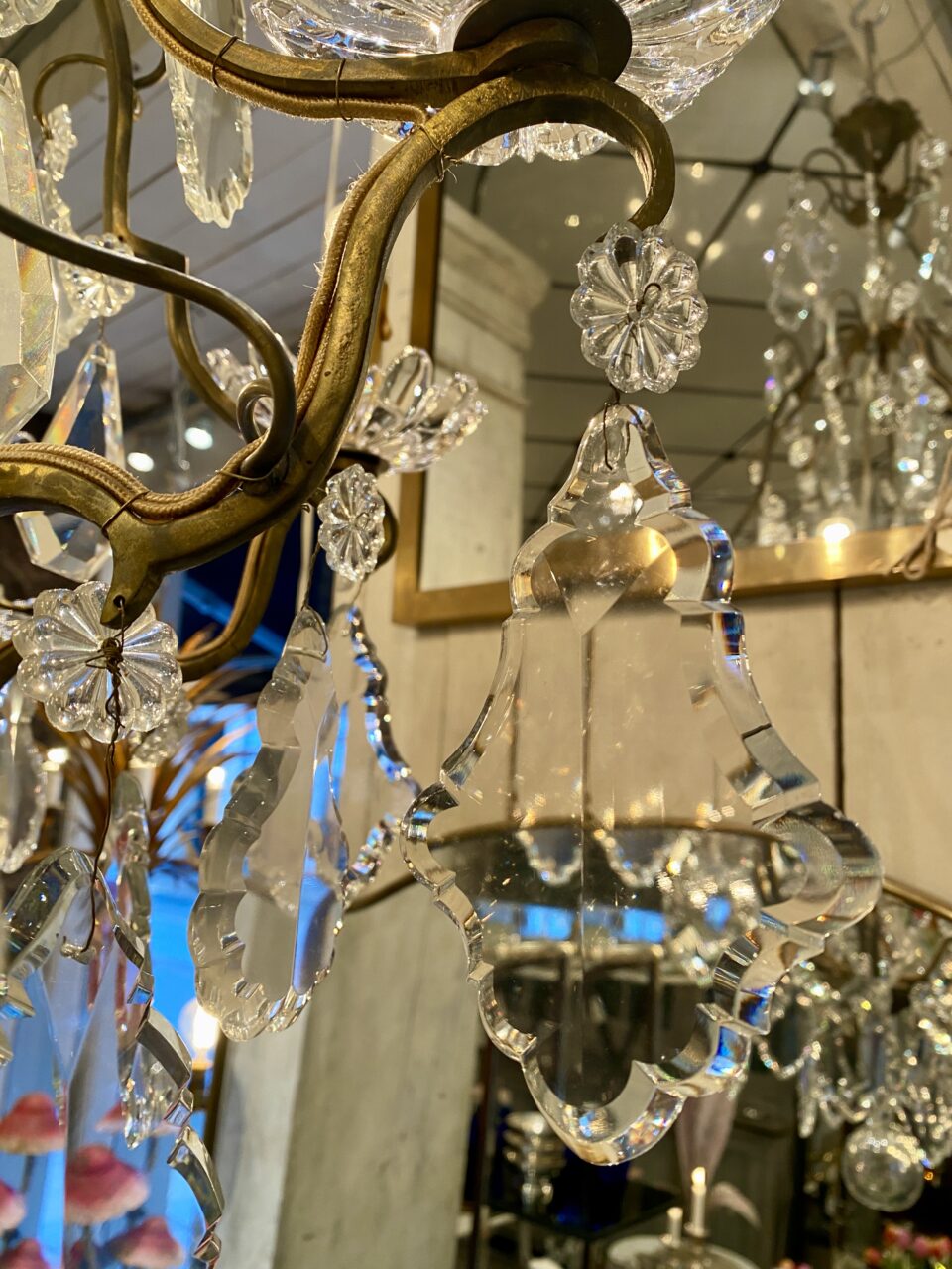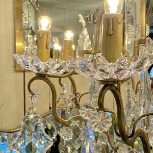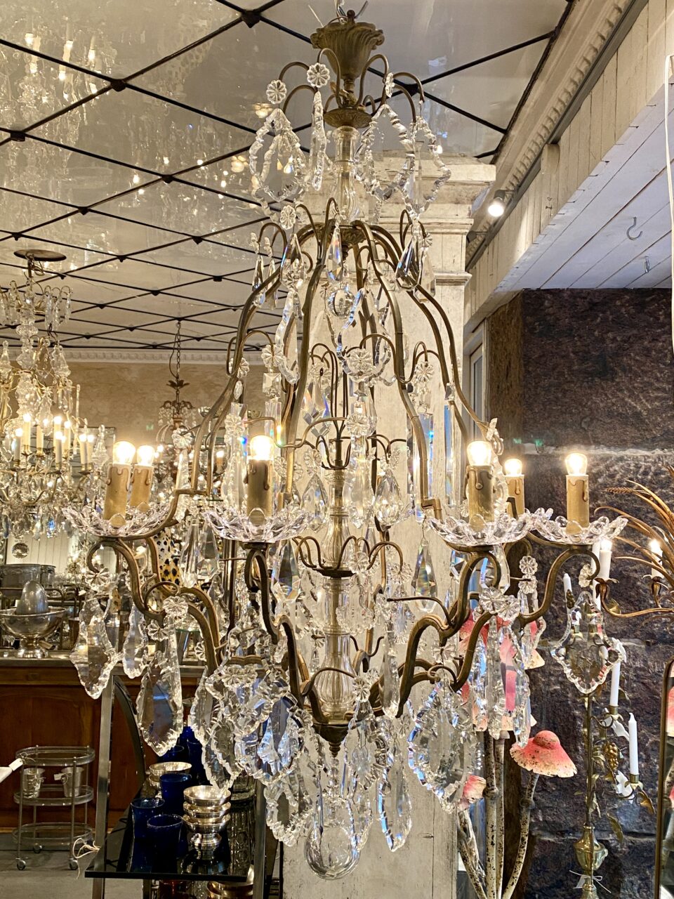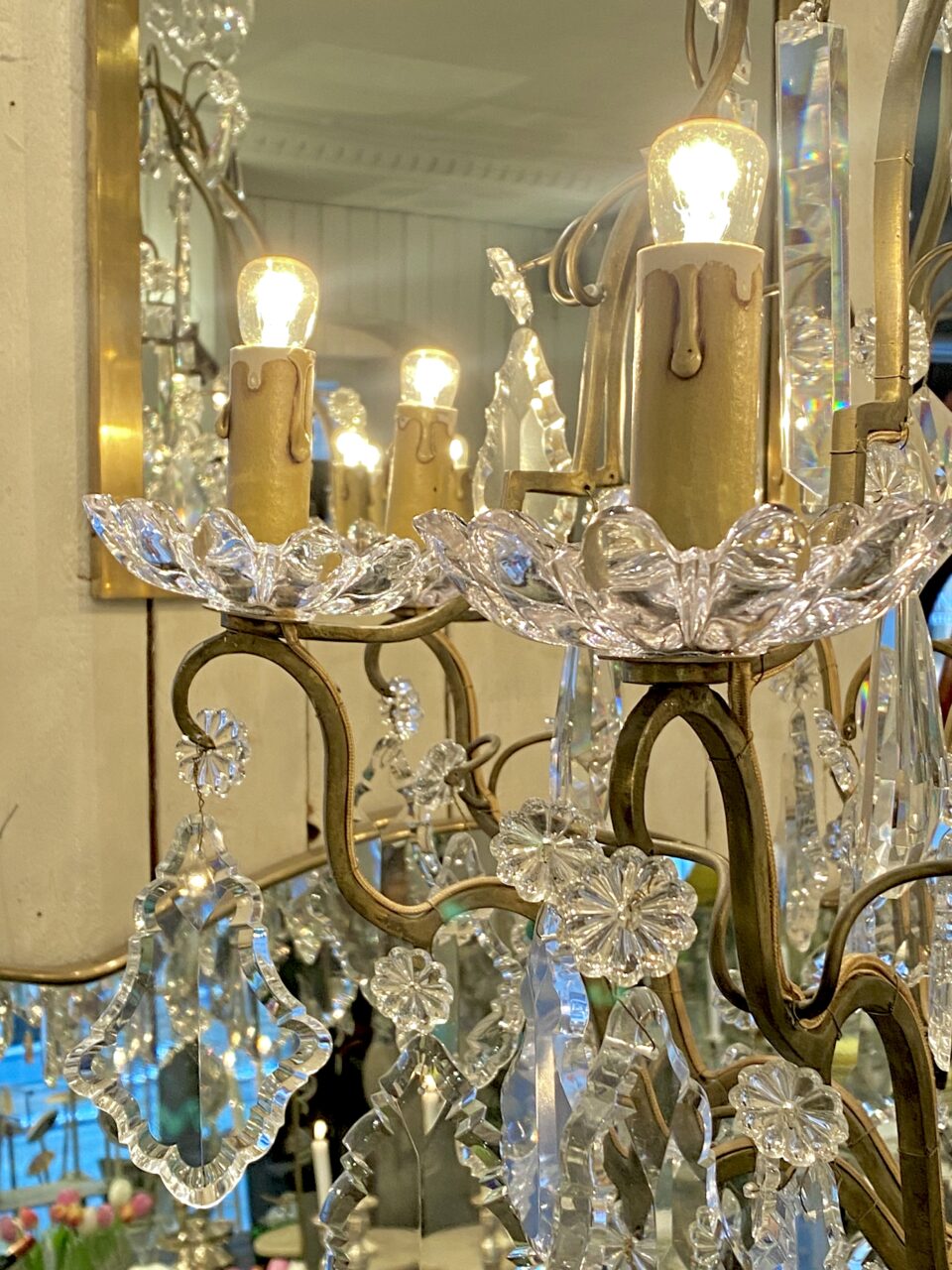 Stor gammel fransk burformet prismekrone i patineret messing fra omkring år 1900.