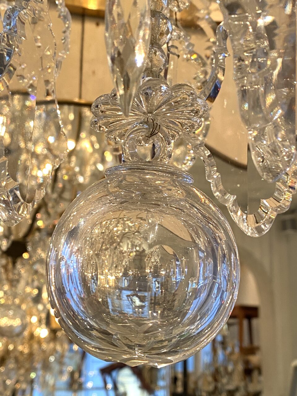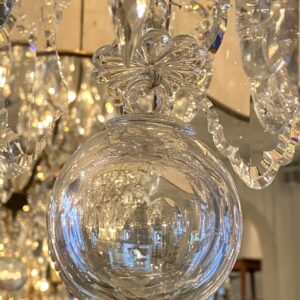 Prismekronen er smukt dekoreret med mange store bladformet prismer med fine facetslibninger, små blomster rosetter og 8 lyspiber der gør at lyset reflekteres på en eventyrlig måde i de store klare prismer.
