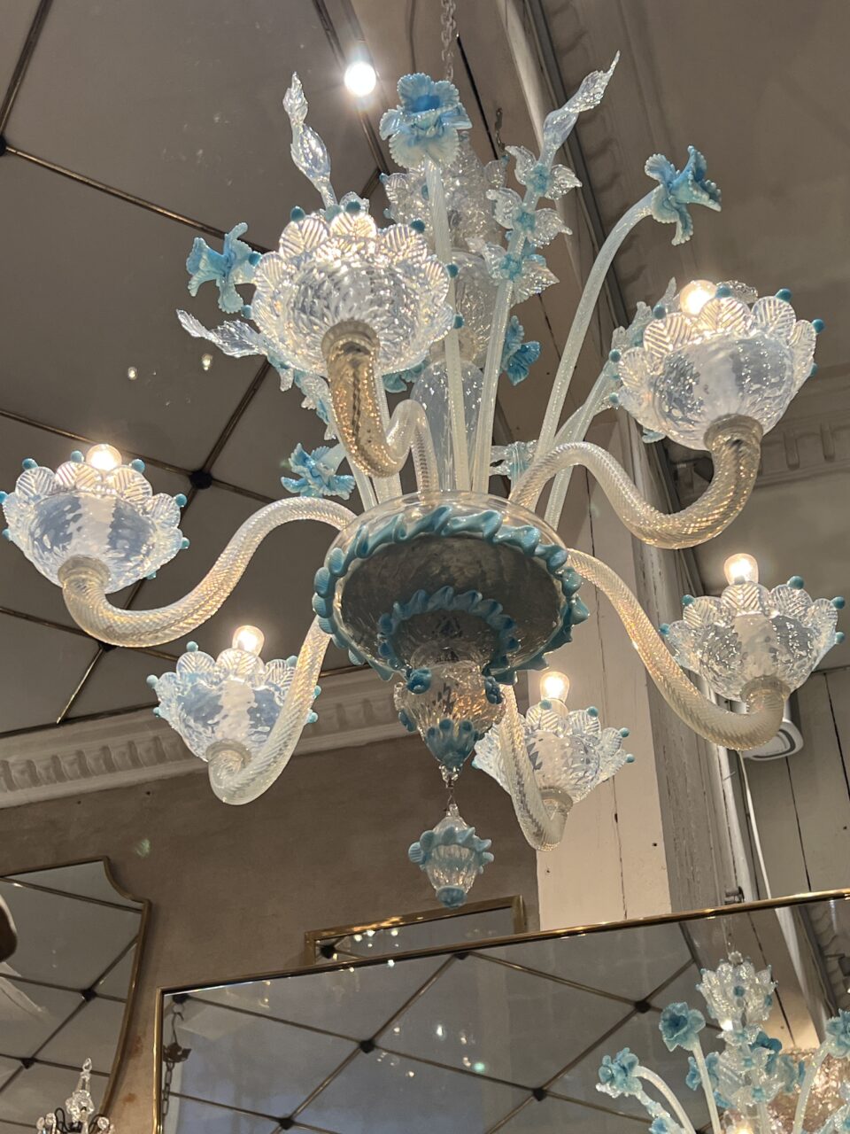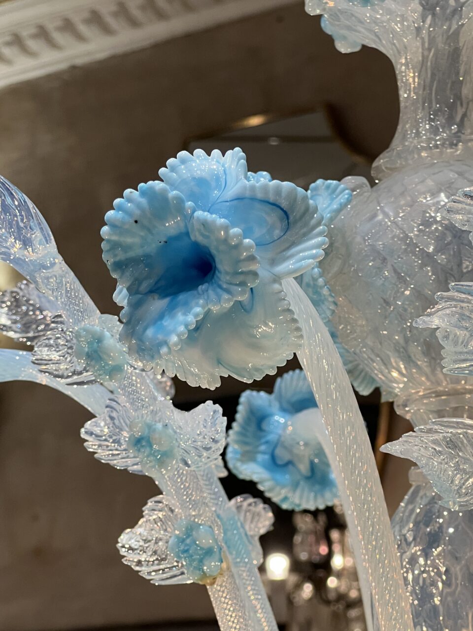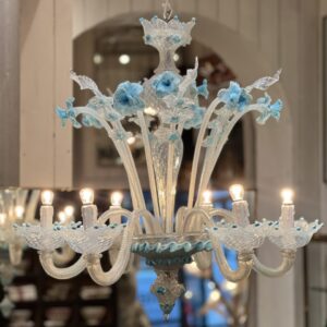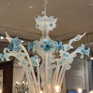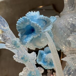 Dekorationerne består af håndformede blomster, blade og små knopper i transparent og opaliserende glas, typisk for Murano-håndværk, hvor hver detalje er individuelt påsat og formet. Den bløde kombination af hvid og isblå giver lysekronen et elegant, næsten frostklart udtryk – som inspireret af blomster i glas eller frossen flor.