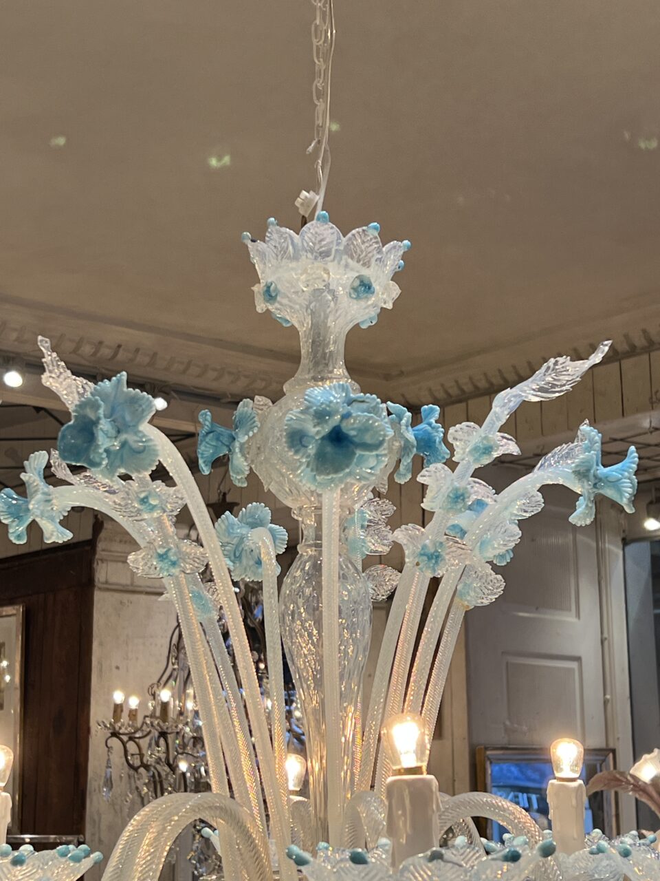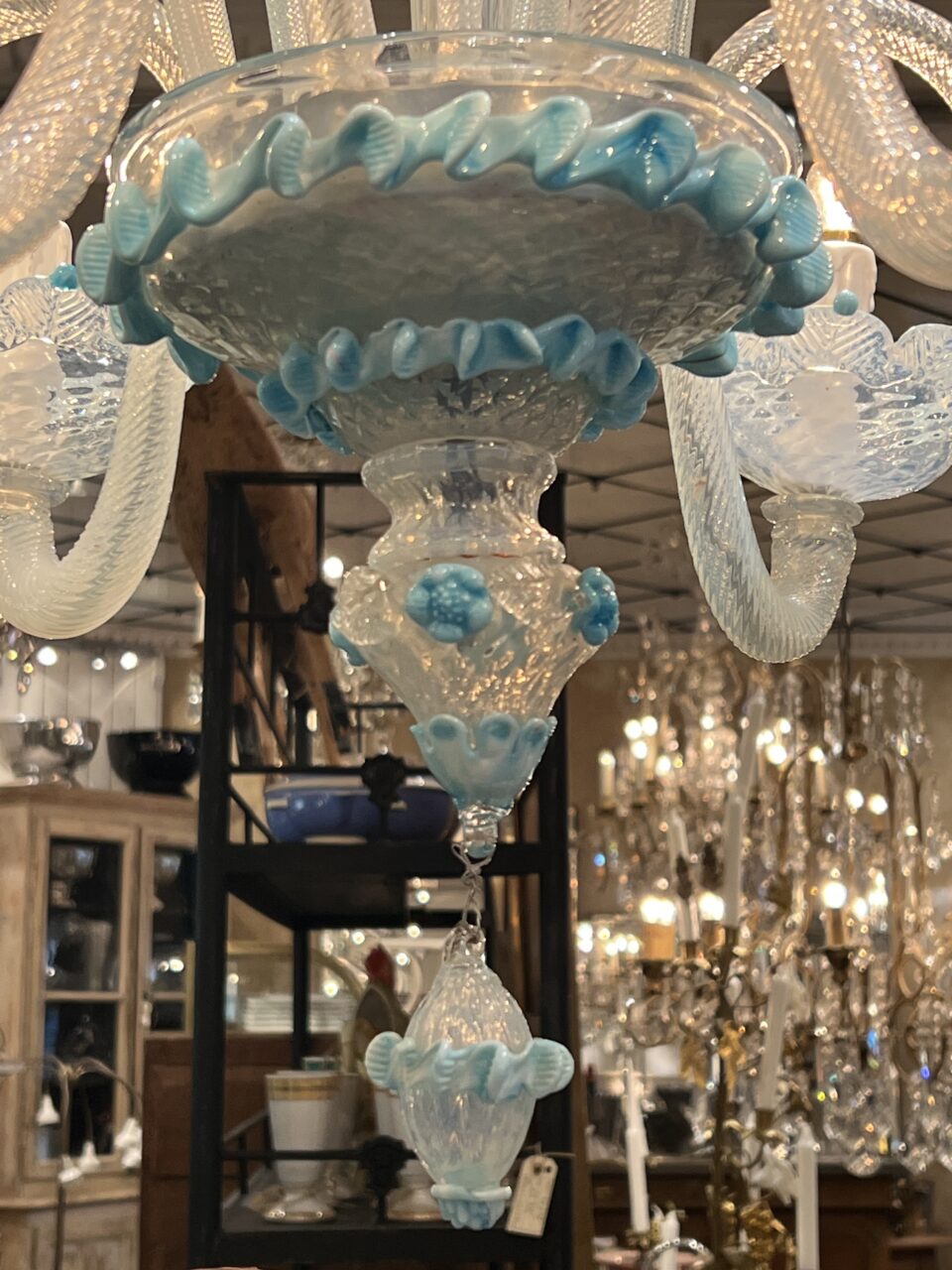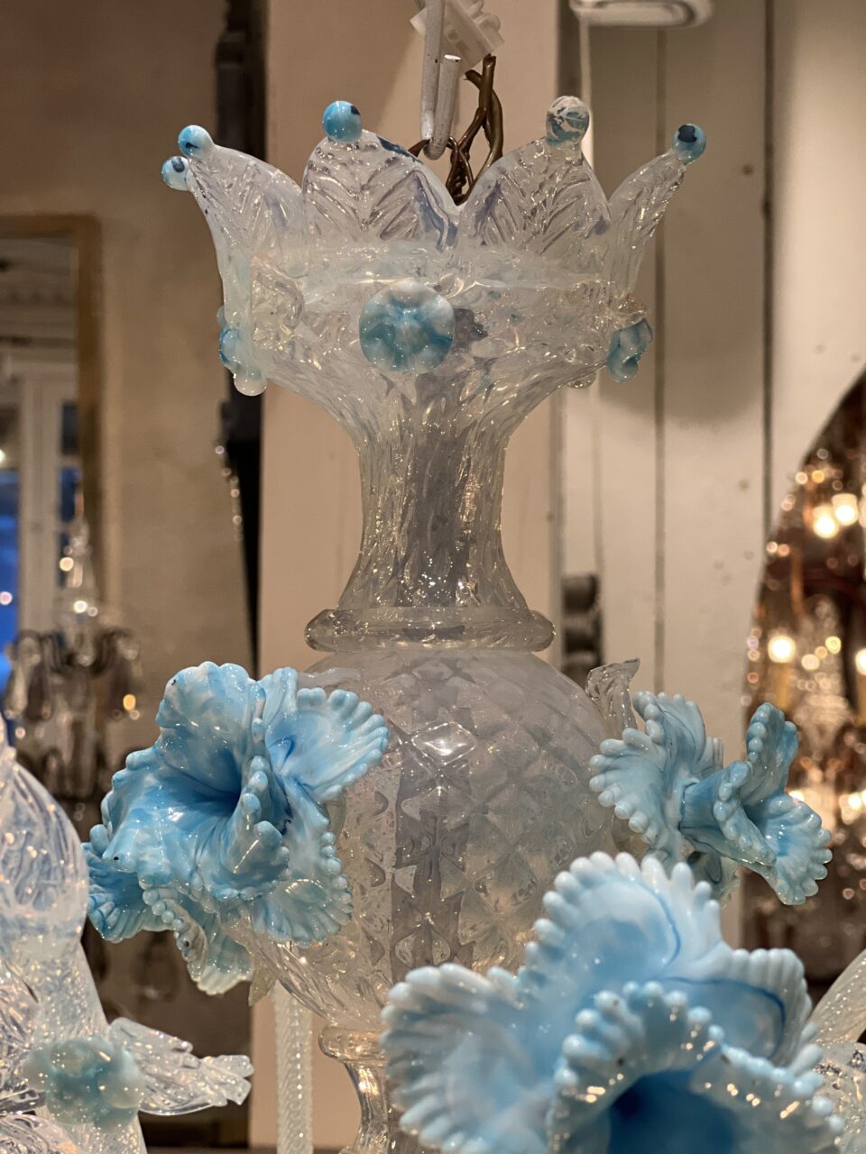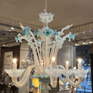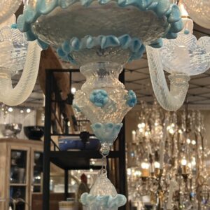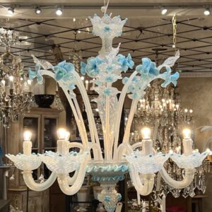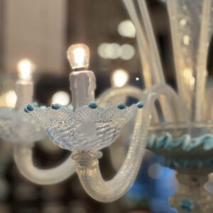 Lysekronen er udført i mælkehvidt, iriserende opalineglas med fine pastelfarvede detaljer i lyseblå/turkis. Den har en klassisk venetiansk komposition med en central balusterformet stamme, hvorfra elegante, buede arme slynger sig symmetrisk ud. Armene er riflede og transparente med perlemorsskær, hvilket giver et levende farvespil i lyset.