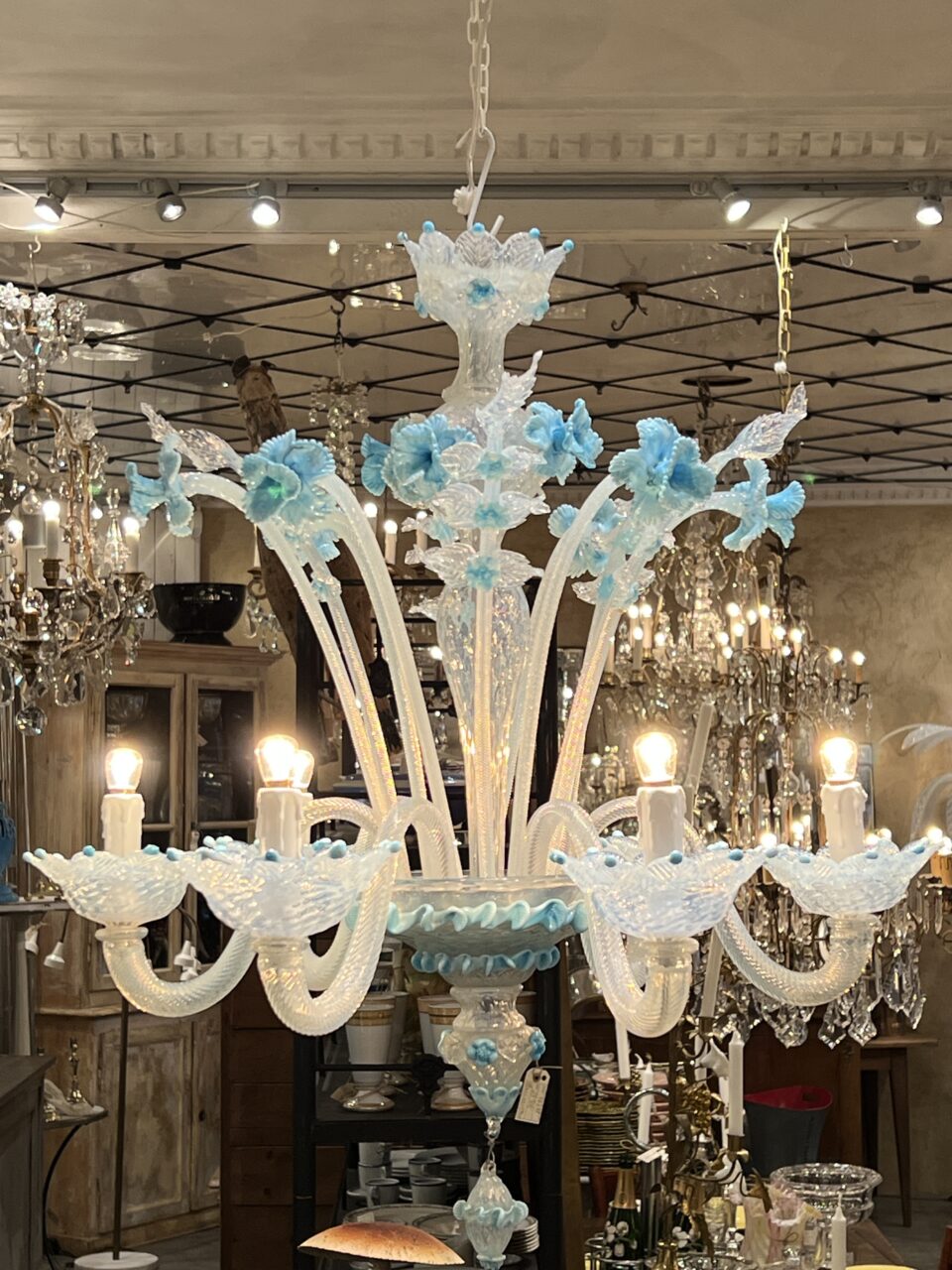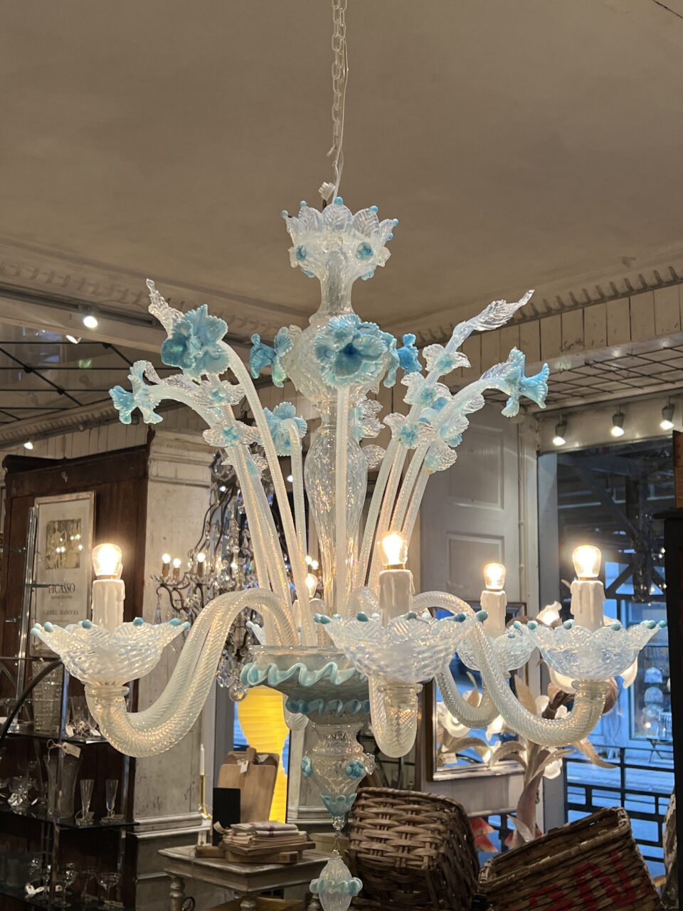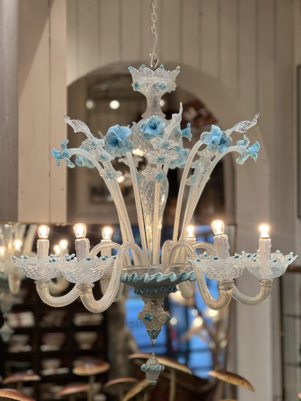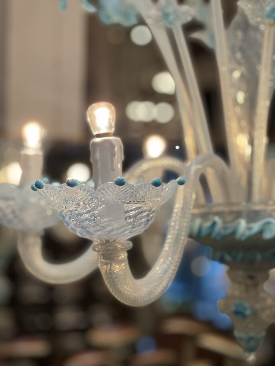 Lysekronen er udført i mælkehvidt, iriserende opalineglas med fine pastelfarvede detaljer i lyseblå/turkis. Den har en klassisk venetiansk komposition med en central balusterformet stamme, hvorfra elegante, buede arme slynger sig symmetrisk ud. Armene er riflede og transparente med perlemorsskær, hvilket giver et levende farvespil i lyset.