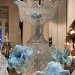 Hver lysarm bærer en blomsterformet skål i opalineglas, dekoreret med små blå knopdetaljer langs kanten. Over skålene sidder “dryppelys”-manchetter i hvidt glas, som giver et traditionelt, romantisk udtryk. Øverst krones midtersøjlen af en dramatisk vaseformet top med blomster- og bladornamenter i klart og lyseblåt glas.