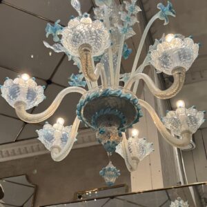 Samlet fremstår lysekronen som et eksklusivt og kunstnerisk stykke italiensk glaskunst, der forener traditionelt venetiansk design med raffineret farvevalg og rigt ornamenteret håndværk.