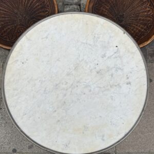 Charming old French café bistro marble table from around the 1930s. It has a beautiful round marble top and raw brass edge and fantastic patina. The solid cast iron base has been painted a delightful deep burgundy.