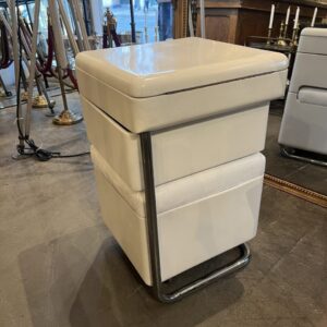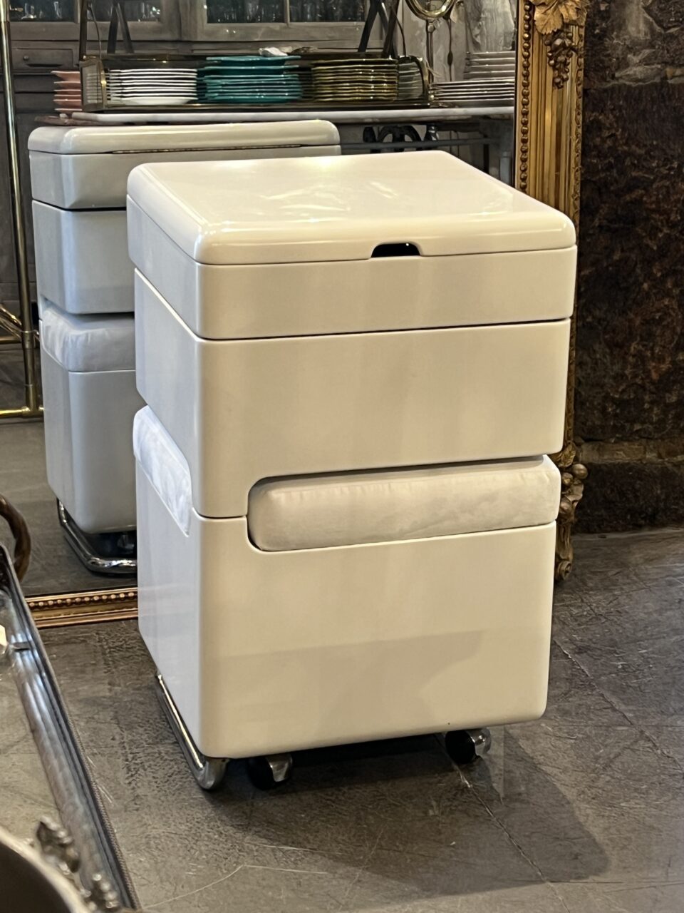 At the bottom, a matching cushioned pouf/chair with that can be opened to reveal storage space.