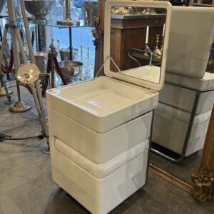 The vanity consists of an integrated mirror and a small pop up mirror with magnifying glass, that can be opened and closed, as well as storage space for make up and accessories.