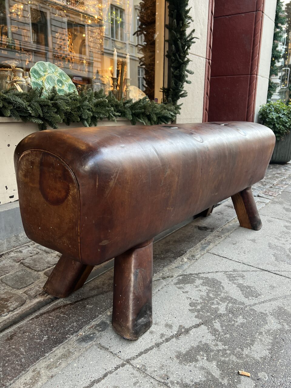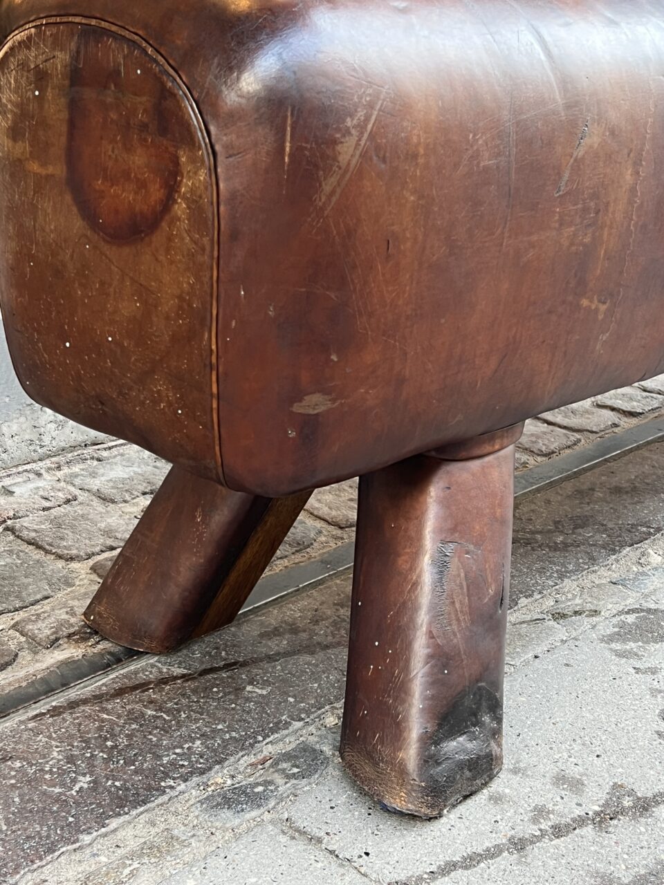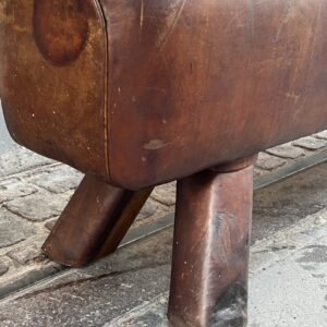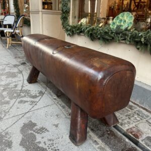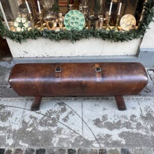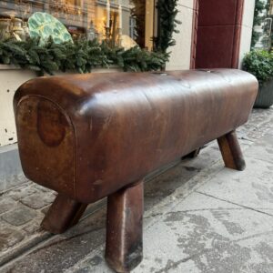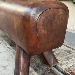 Beautiful old oblong French leather bench, from around the 1930s-40s, where it was once vaulting equipment in a gymnastic hall. This piece has wonderful patina, in its upholstered in cognac-coloured leather and solid wooden legs.