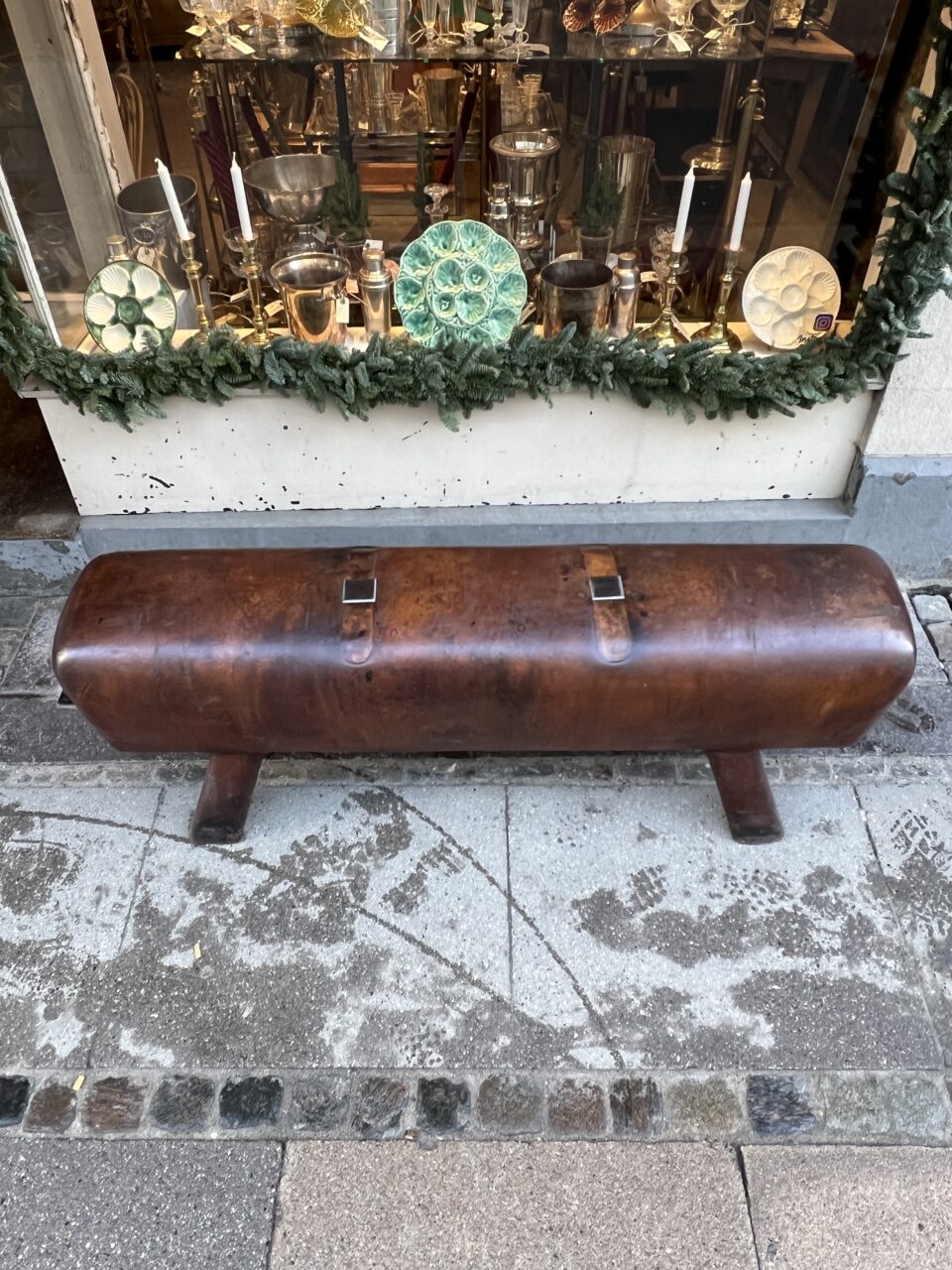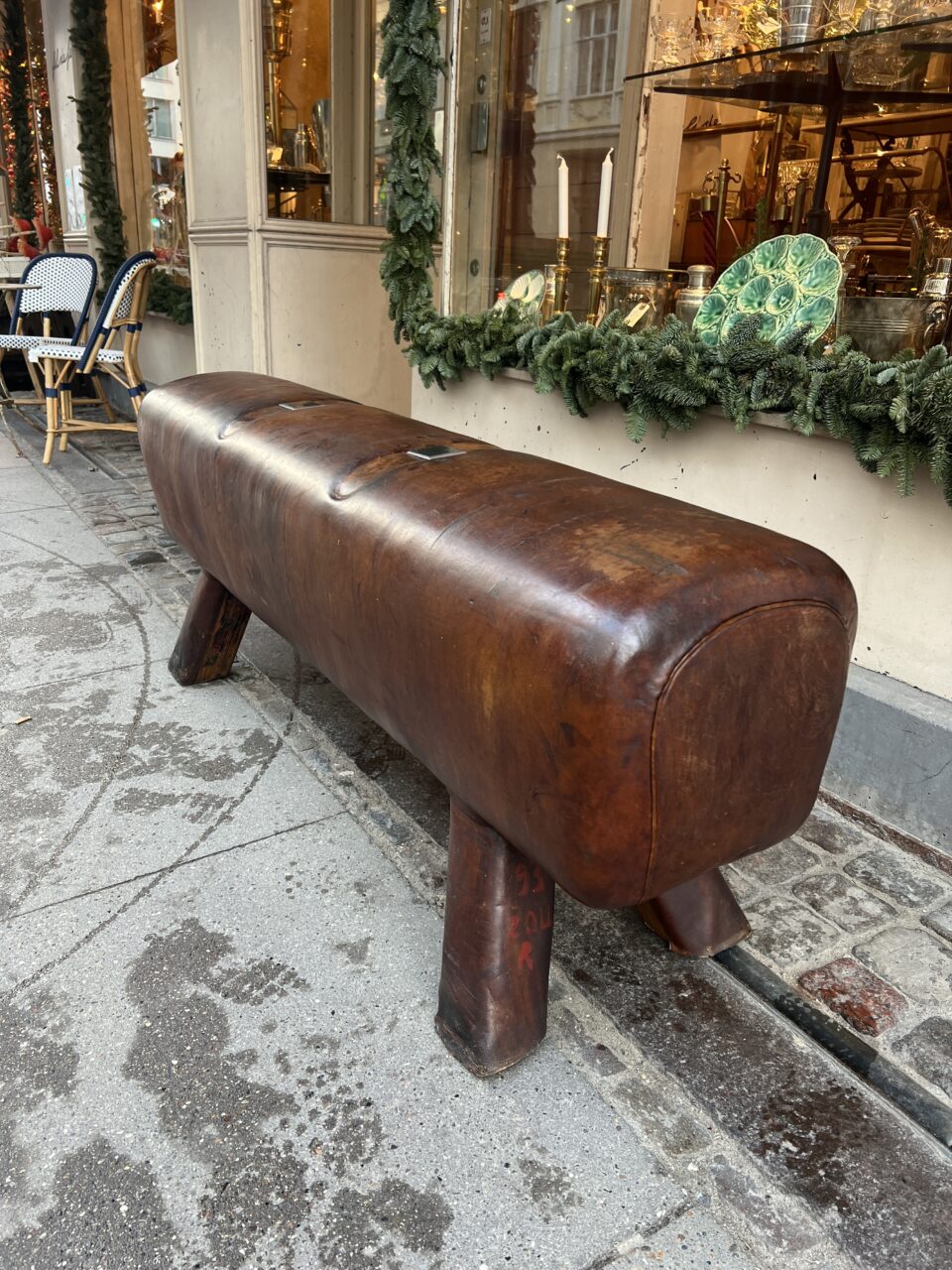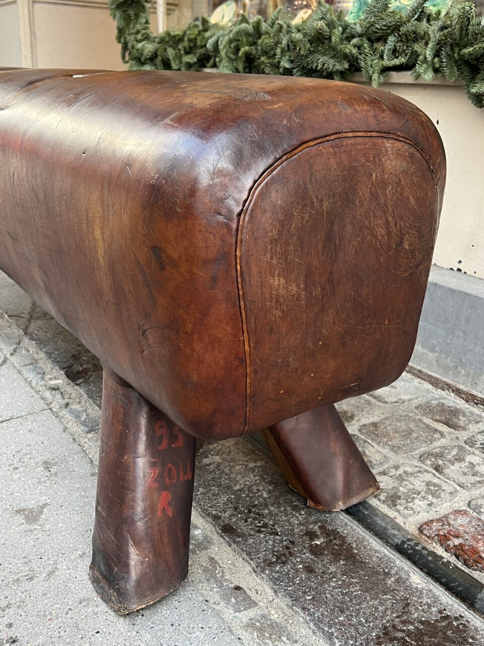 Beautiful old oblong French leather bench, from around the 1930s-40s, where it was once vaulting equipment in a gymnastic hall. This piece has wonderful patina, in its upholstered in cognac-coloured leather and solid wooden legs.