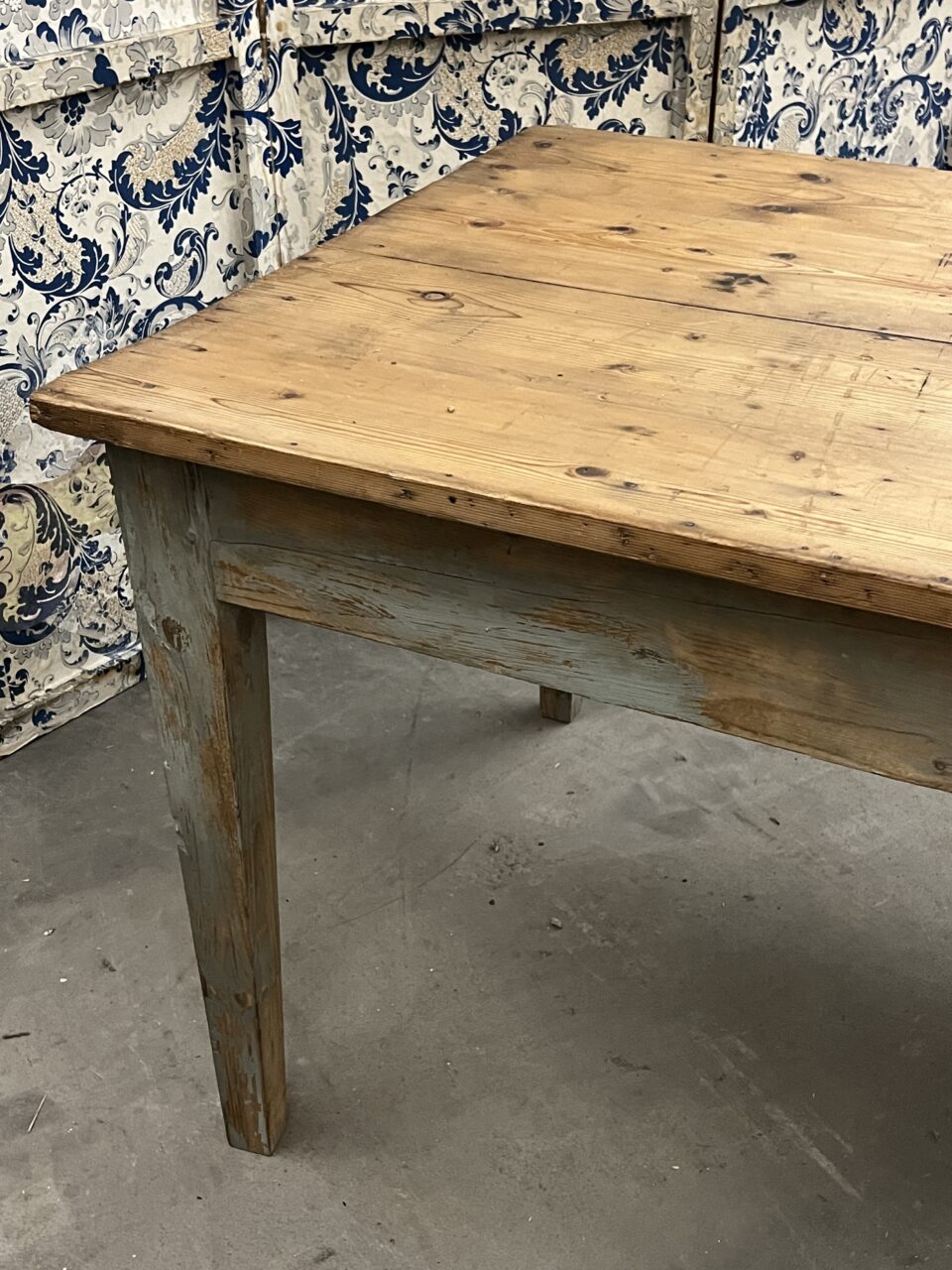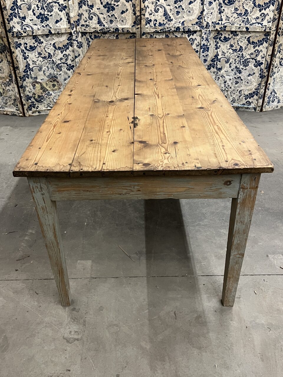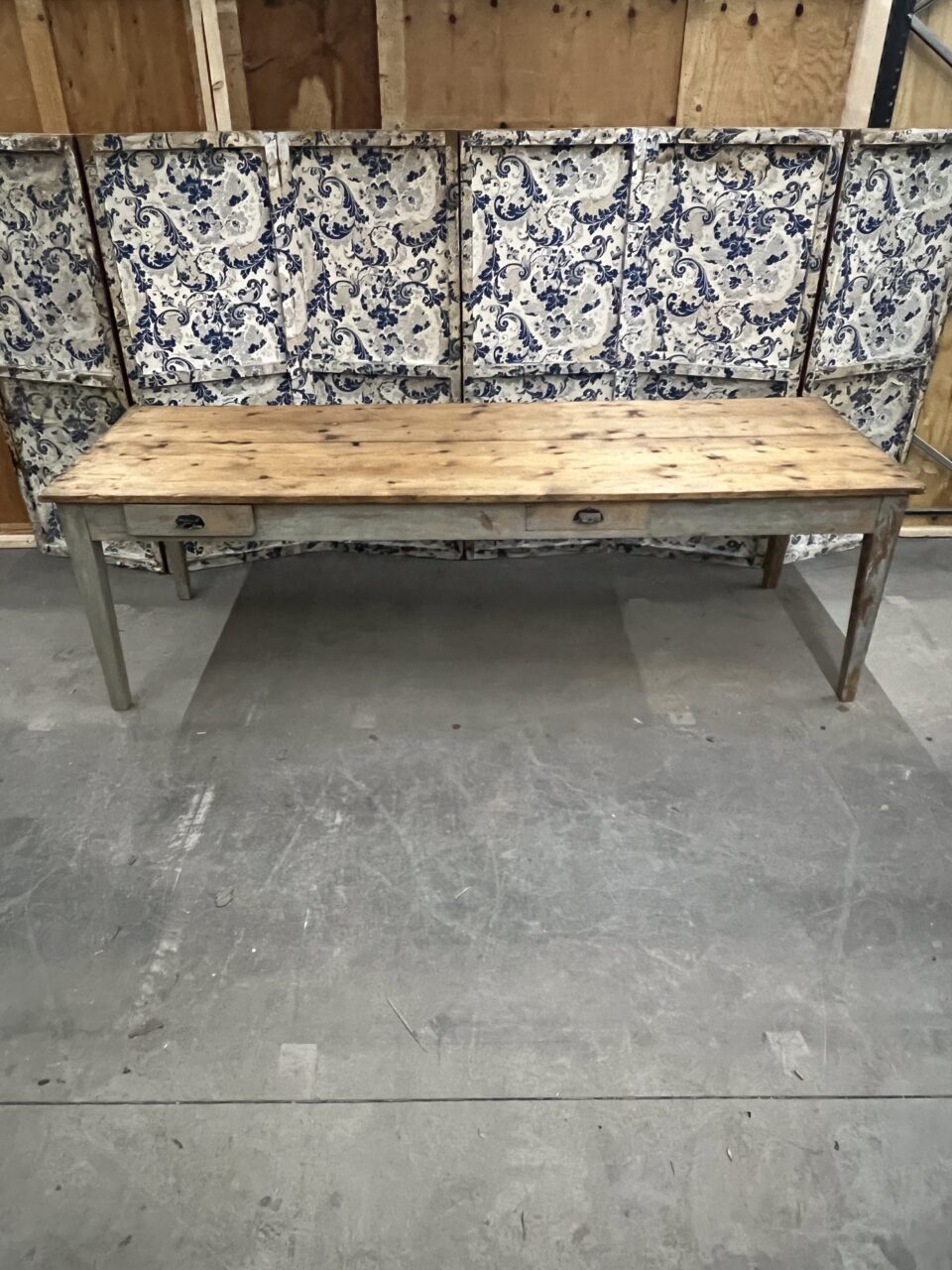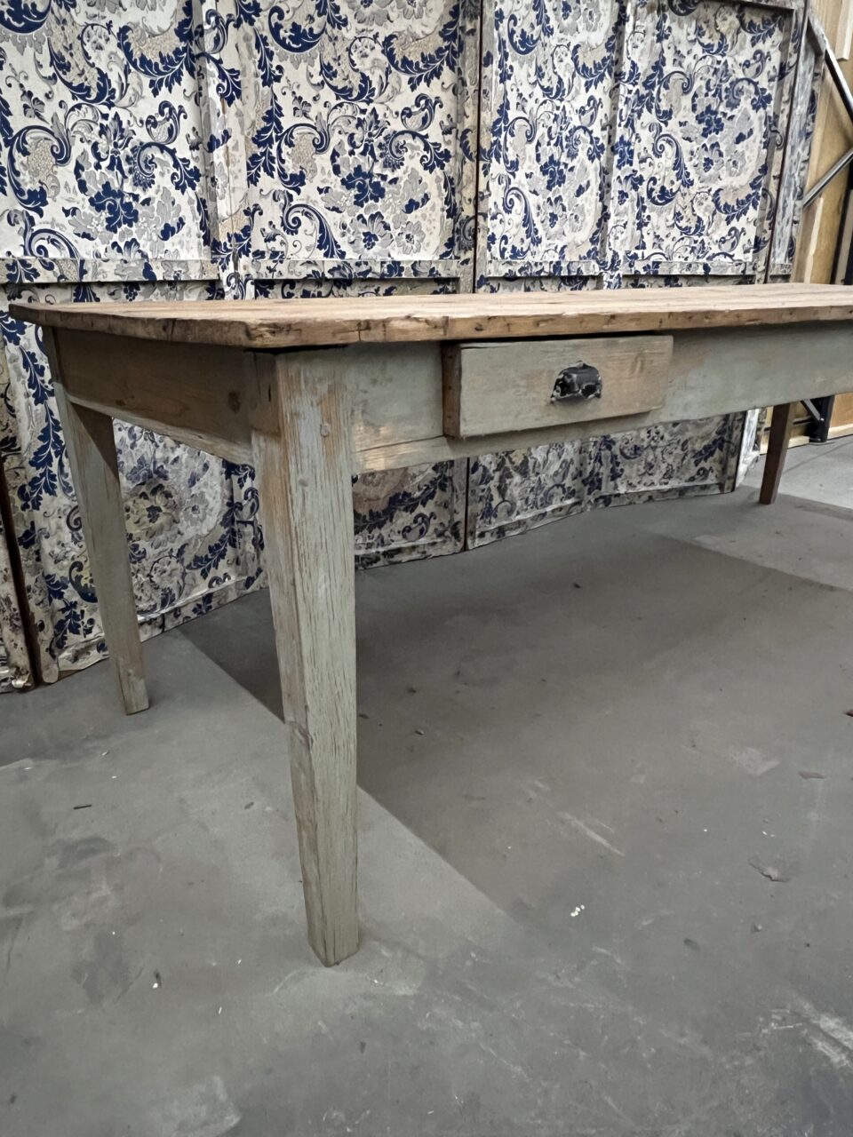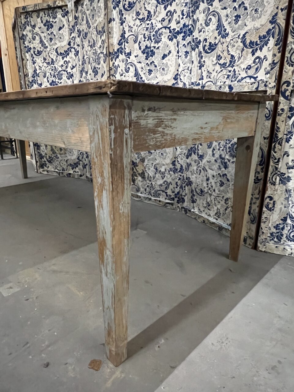 The table dates back to the late 1890s-1900s, and has a simple and solid quality design with dark wooden planks and a fantastic painted base of elegant tapered legs and 2 drawers in the frame. Marvelous patina.