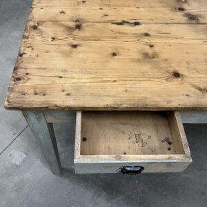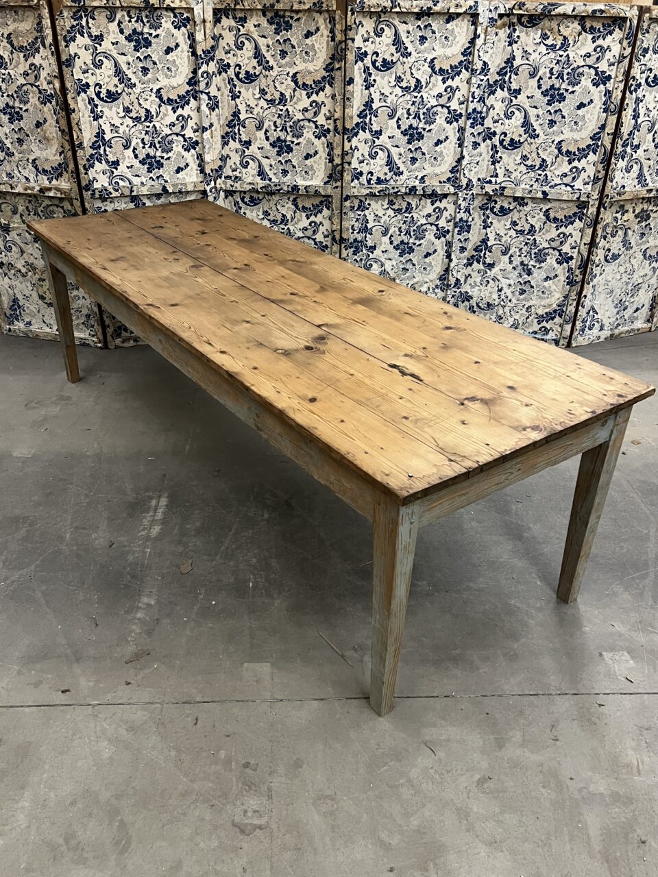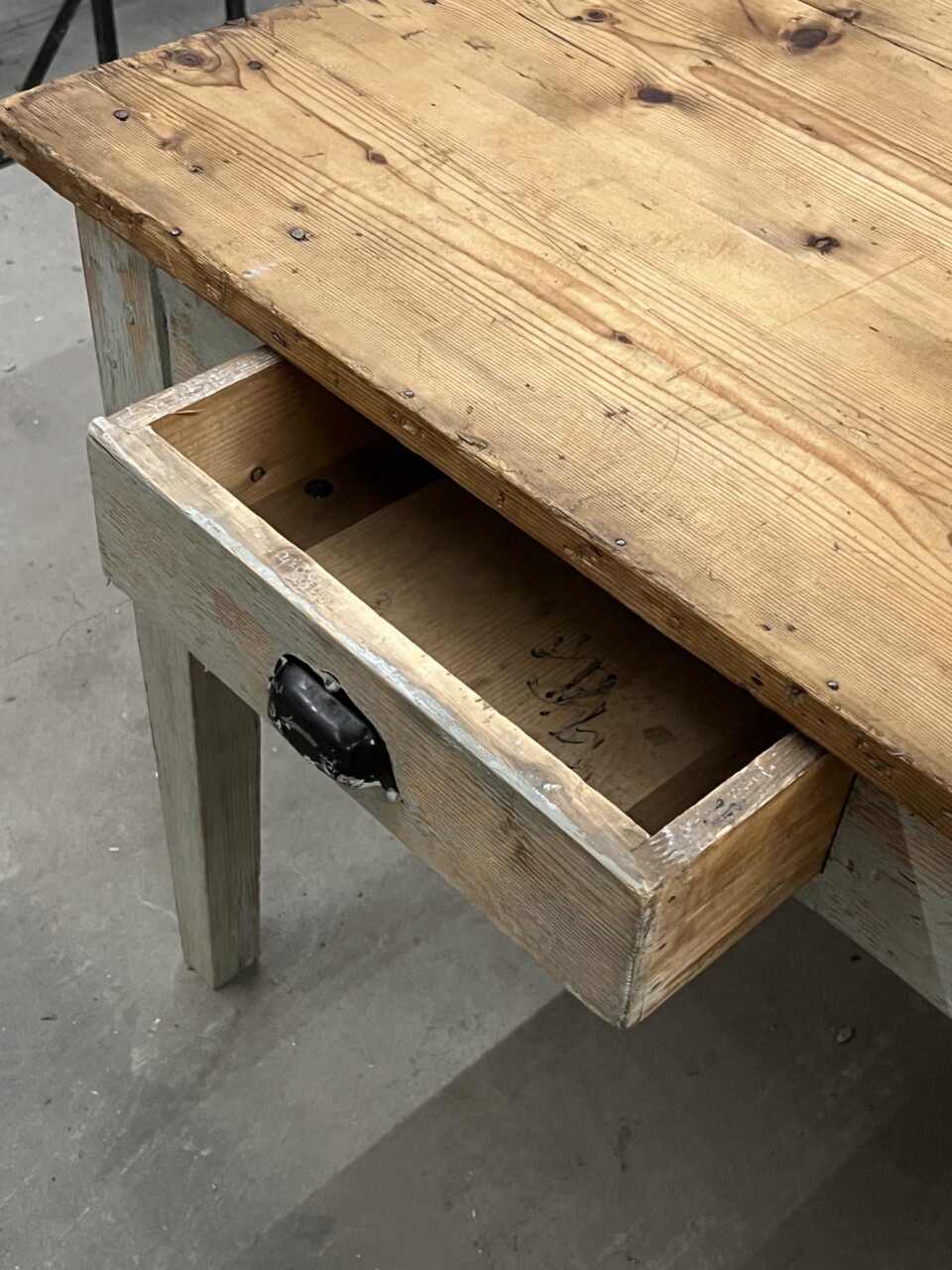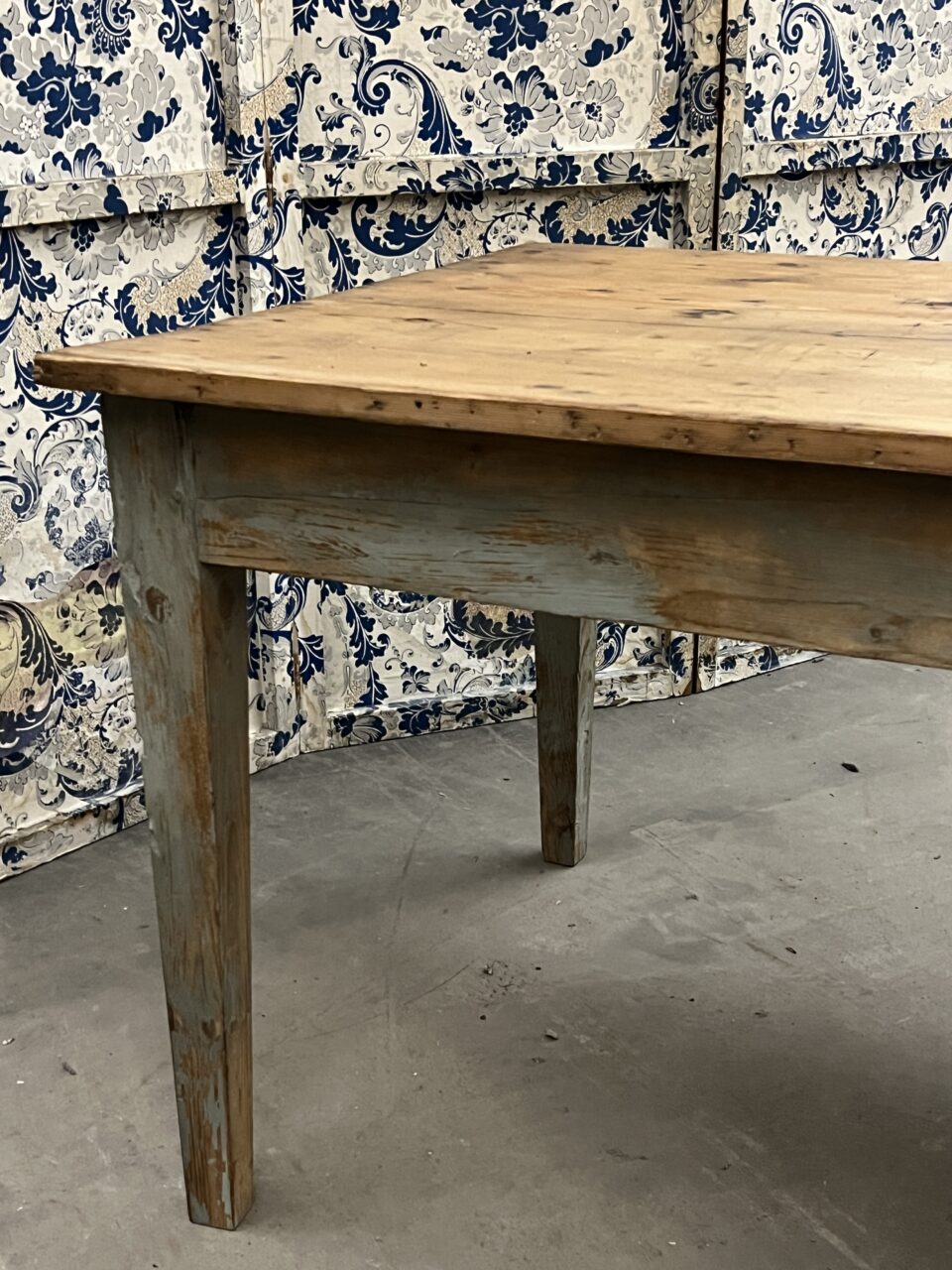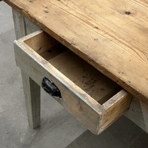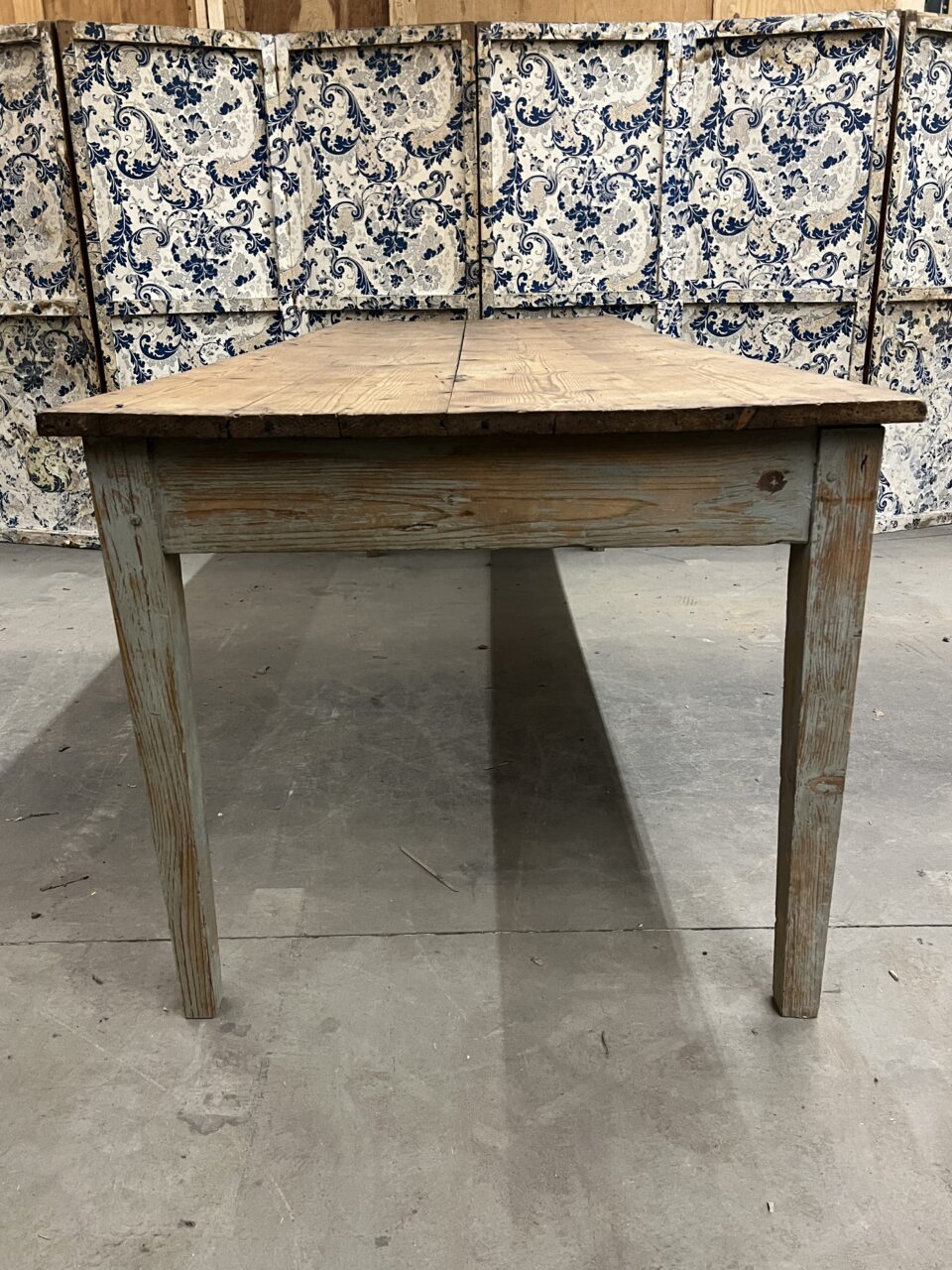 The table dates back to the late 1890s-1900s, and has a simple and solid quality design with dark wooden planks and a fantastic painted base of elegant tapered legs and 2 drawers in the frame. Marvelous patina.