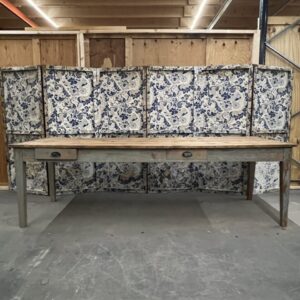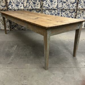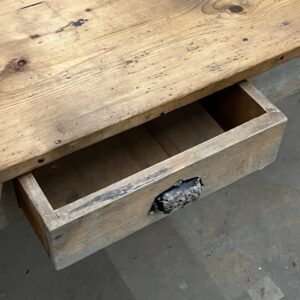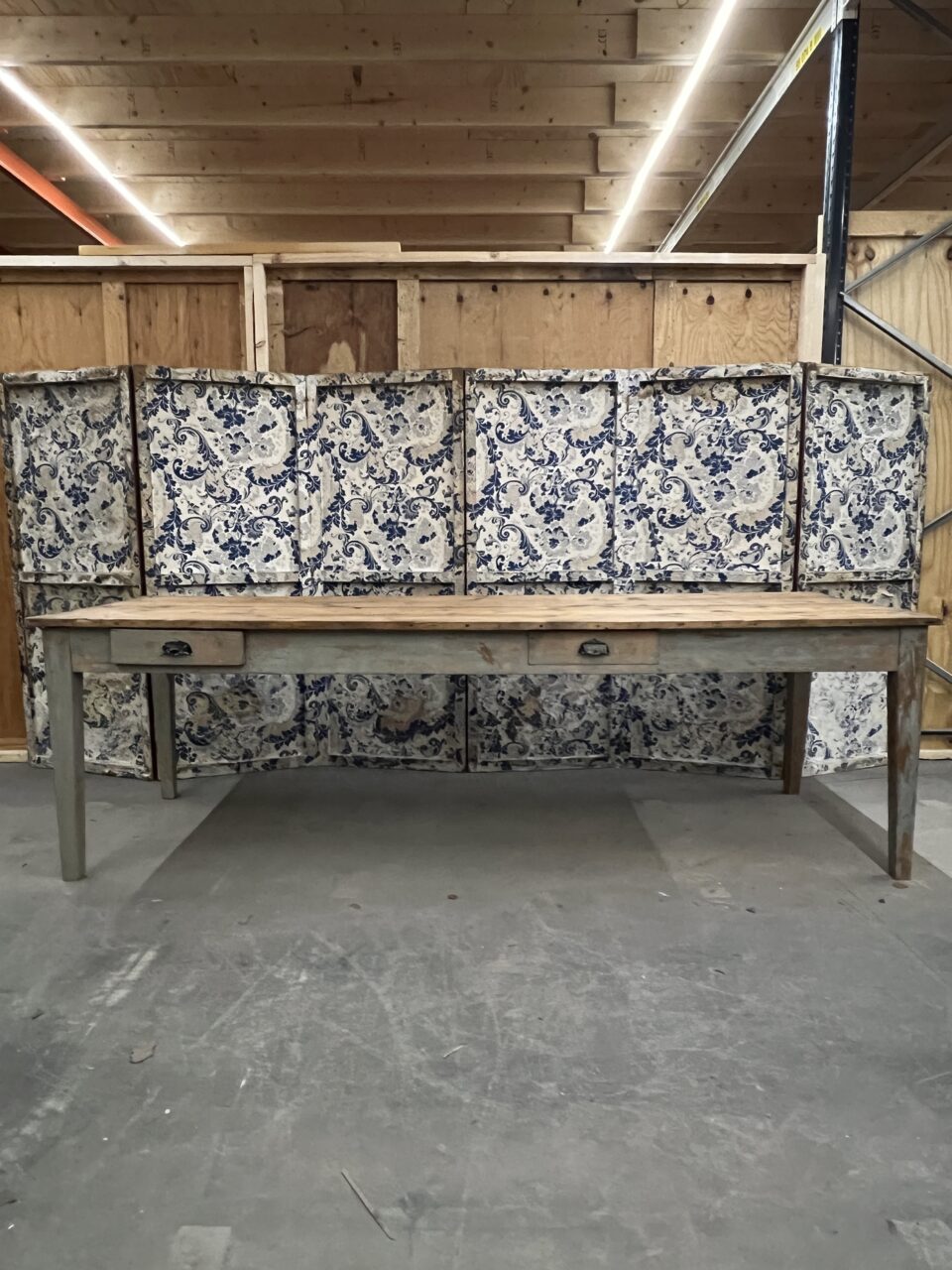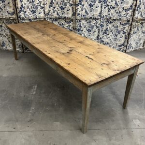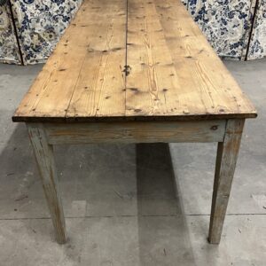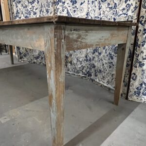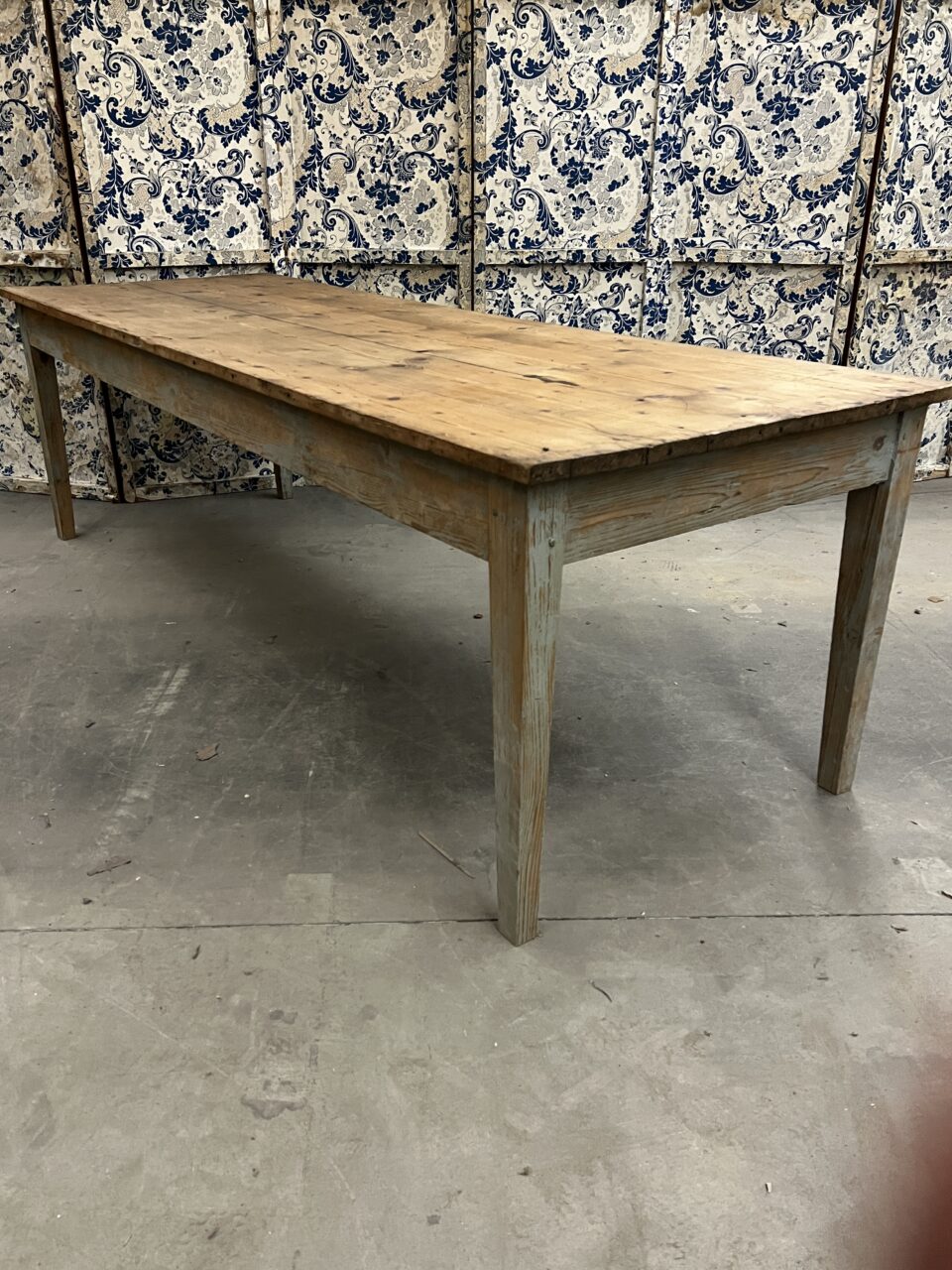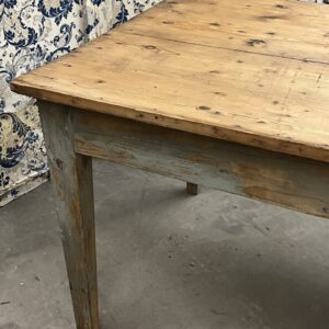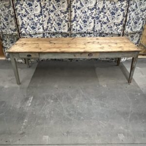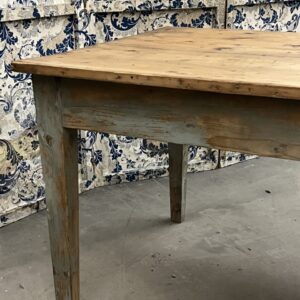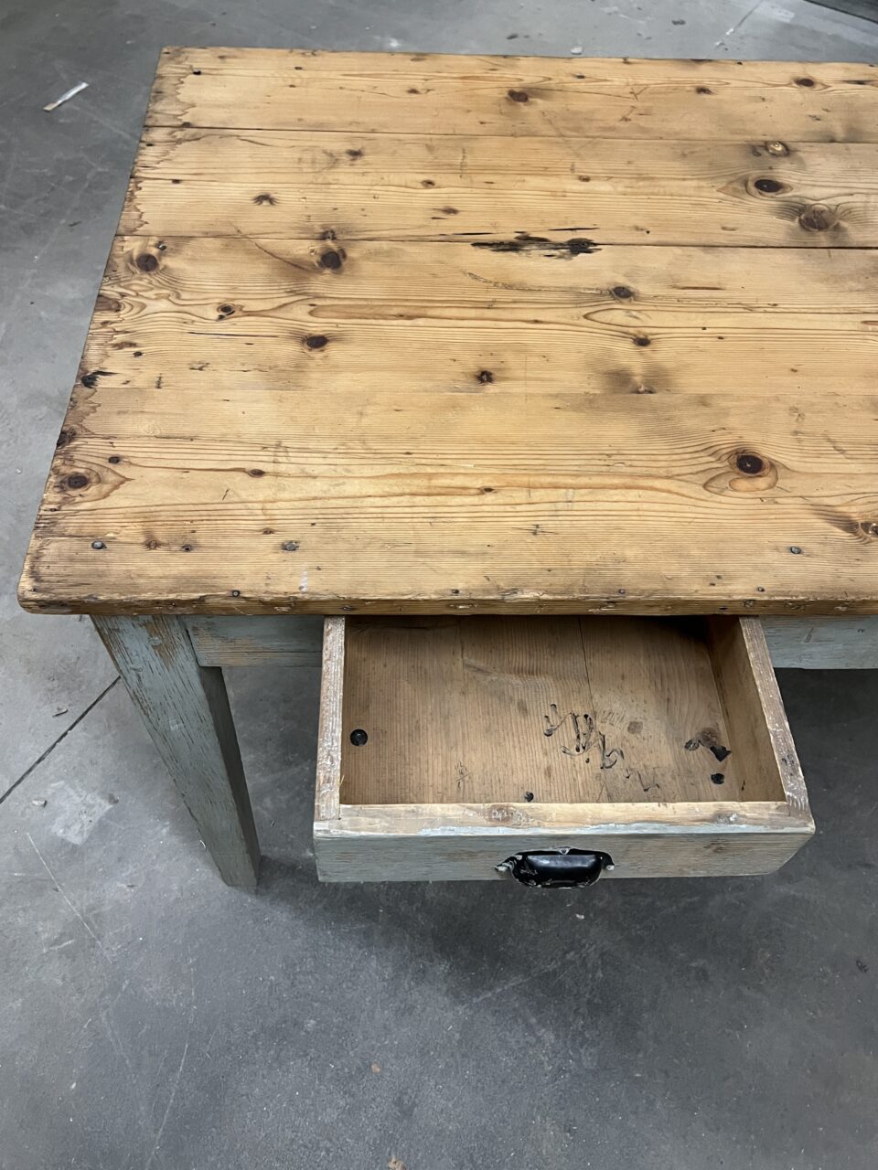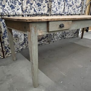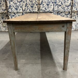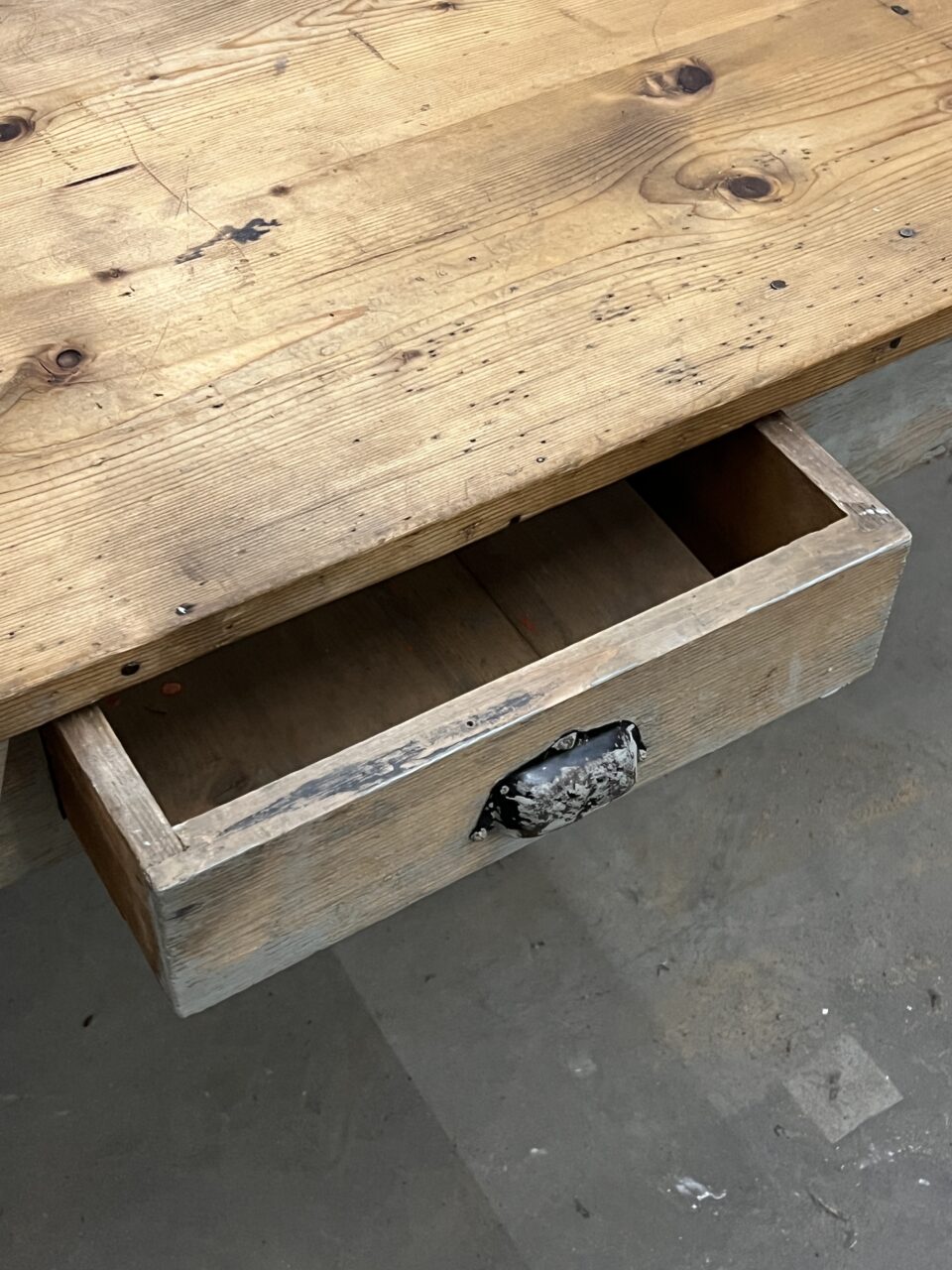 The table dates back to the late 1890s-1900s, and has a simple and solid quality design with dark wooden planks and a fantastic painted base of elegant tapered legs and 2 drawers in the frame. Marvelous patina.
