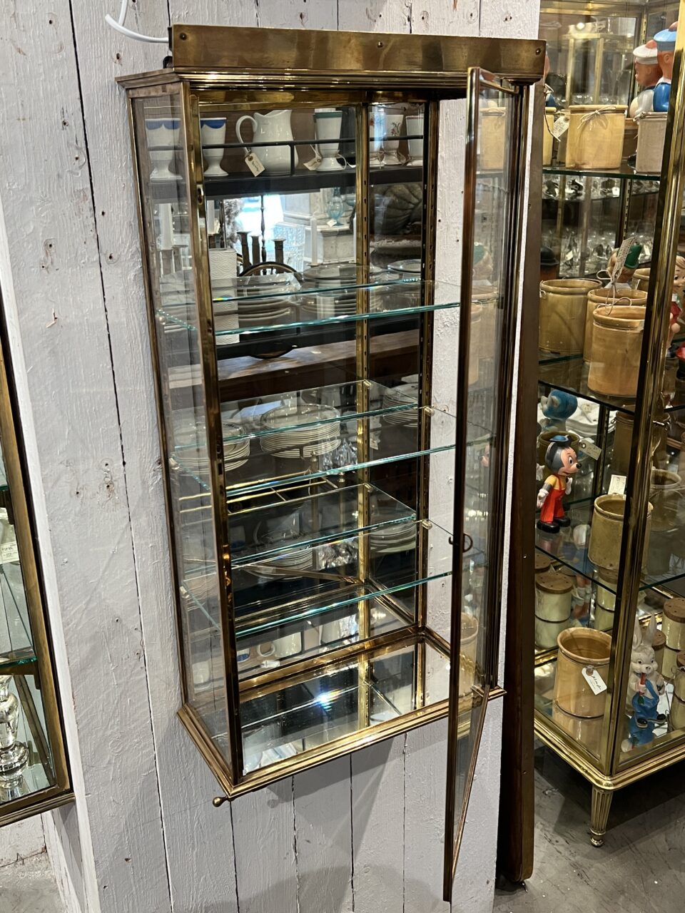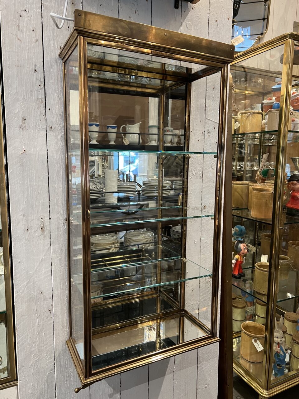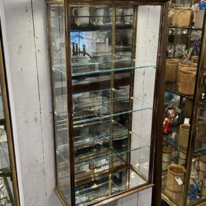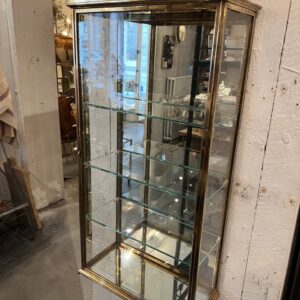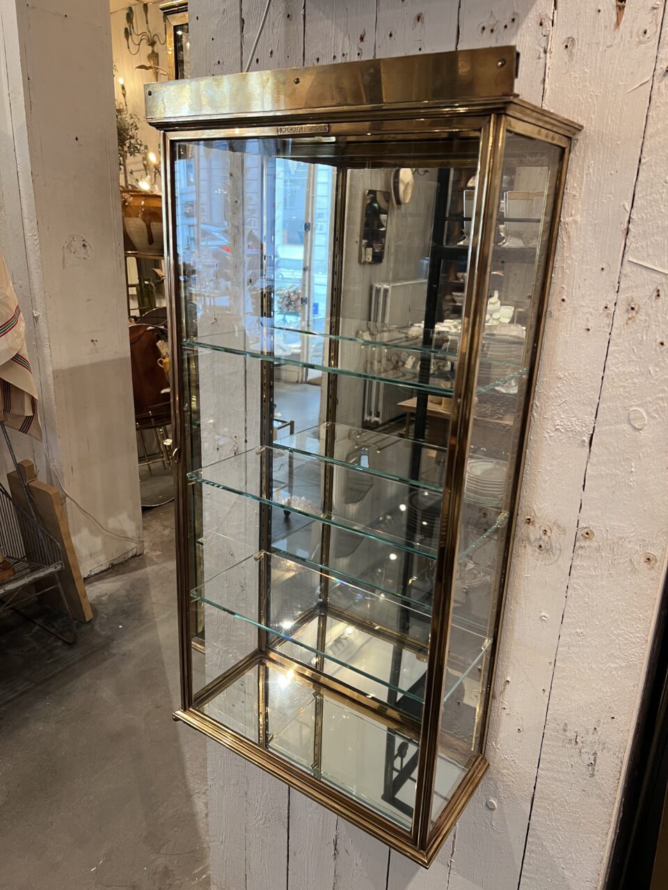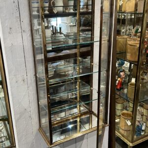The wall vitrine is in quality brass with 3 beautiful glass shelves and adjustable shelf brackets. The base and back panel are in mirrored glass.
