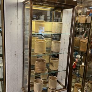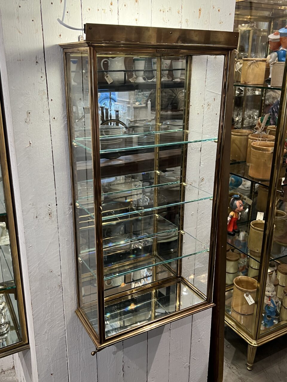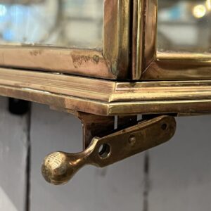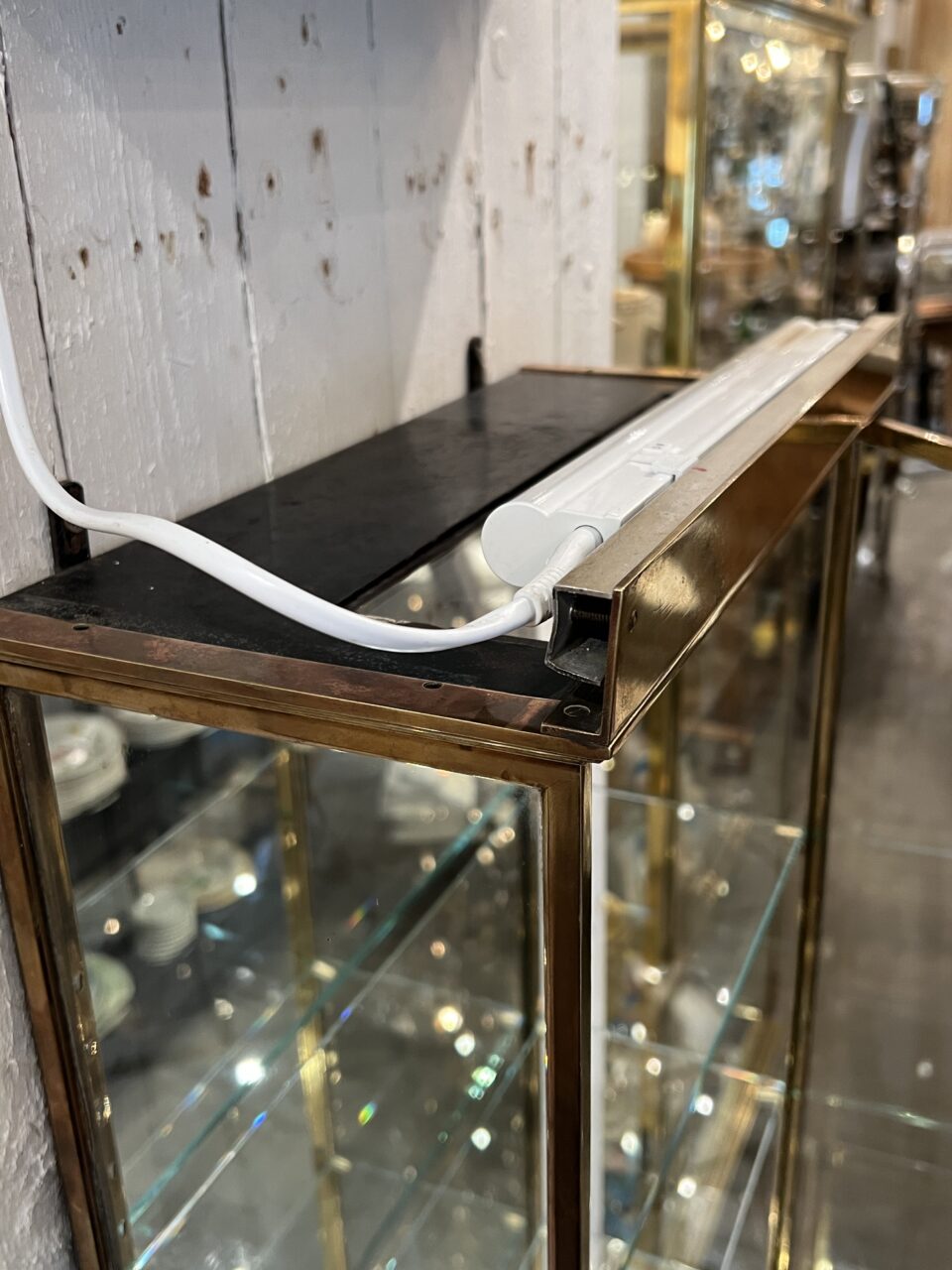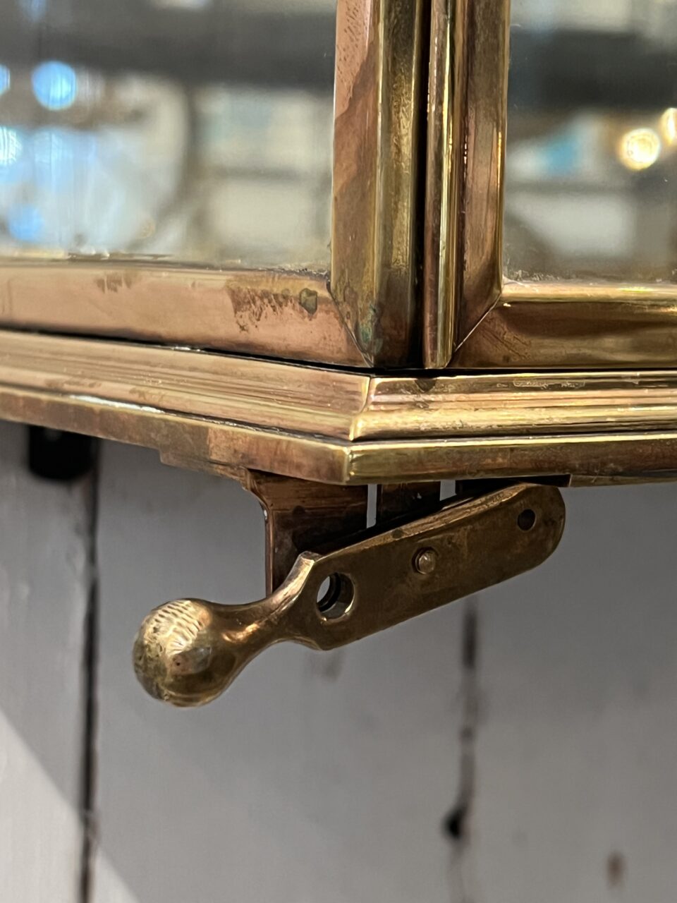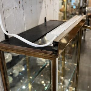 A very presentable glass display cabinet with a light rail mounted at the top, and charming detailed closing mechanism at the bottom.