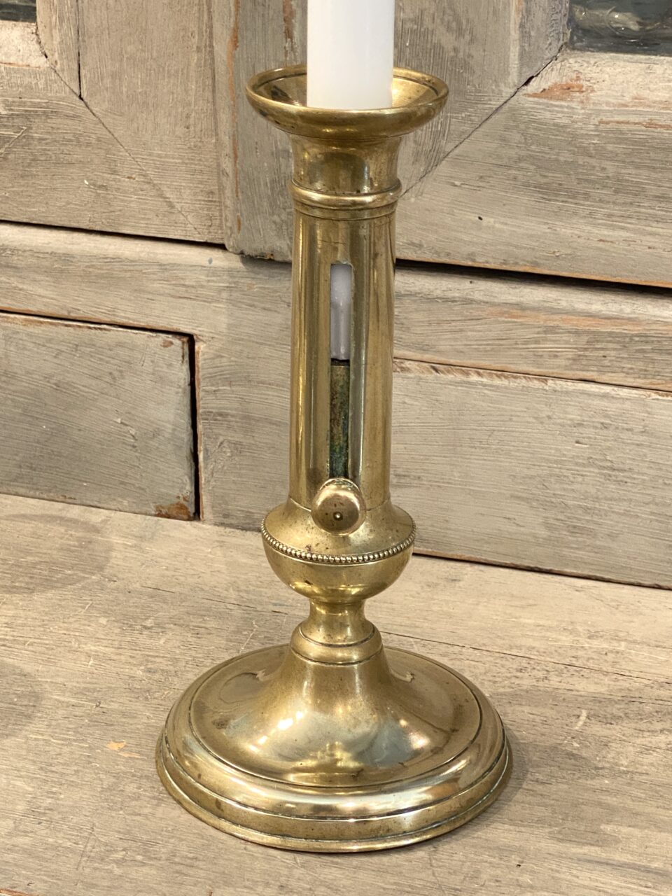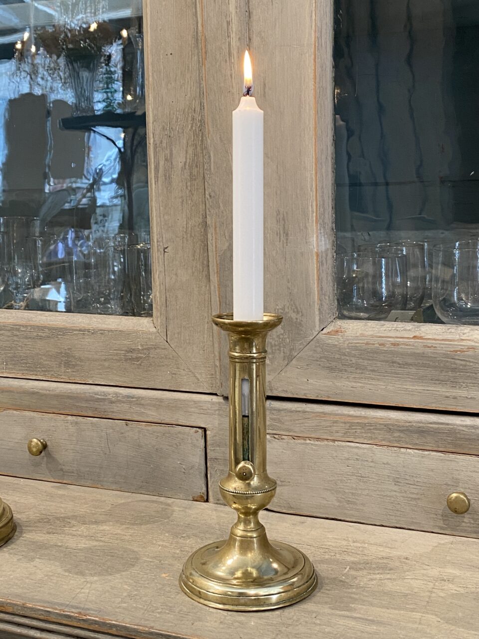 Old brass candlestick, from France – also known as a chamber candlestick. Lovely patina. Beautiful and simple expression. Also looks super grouped together with others.