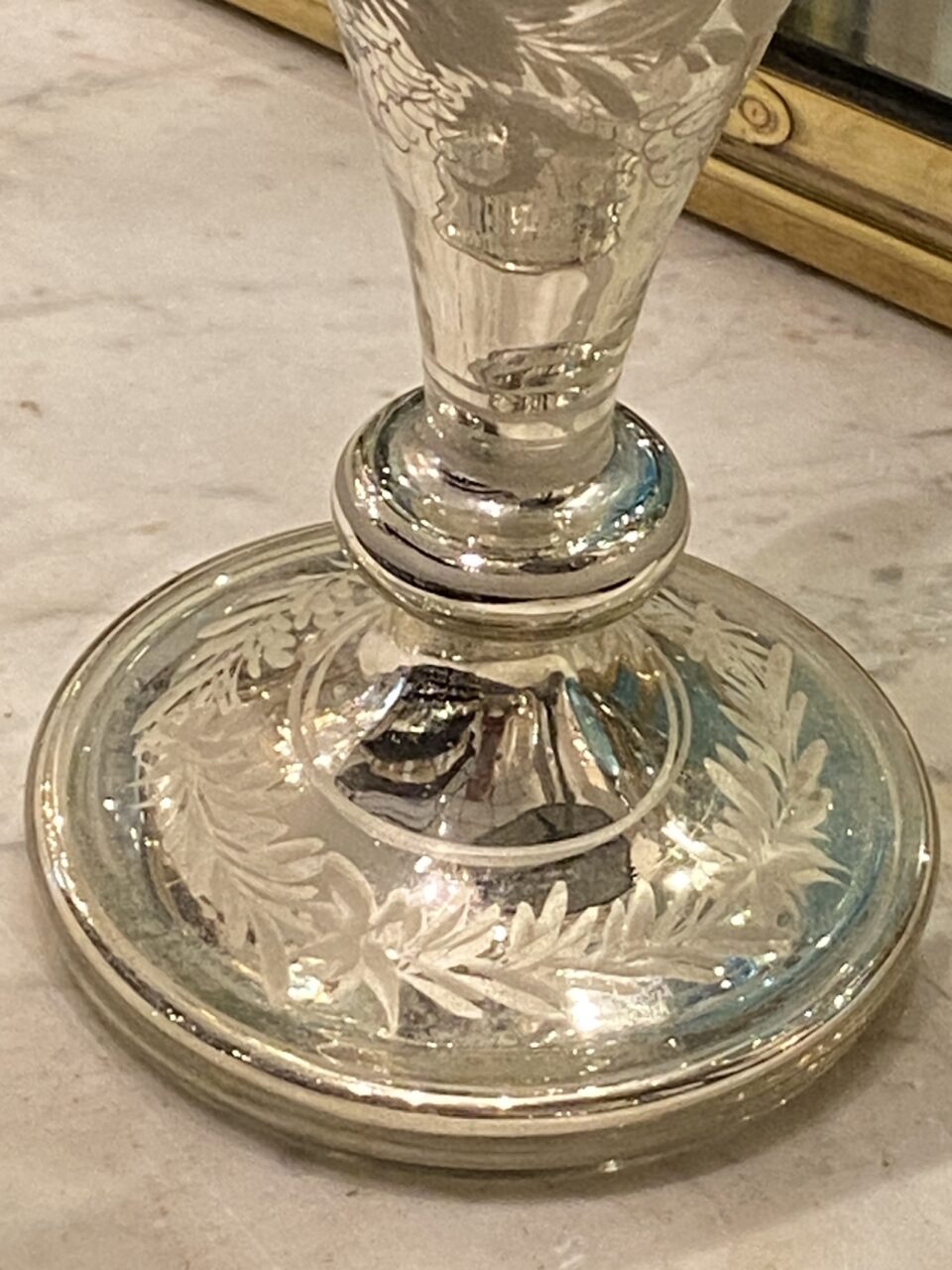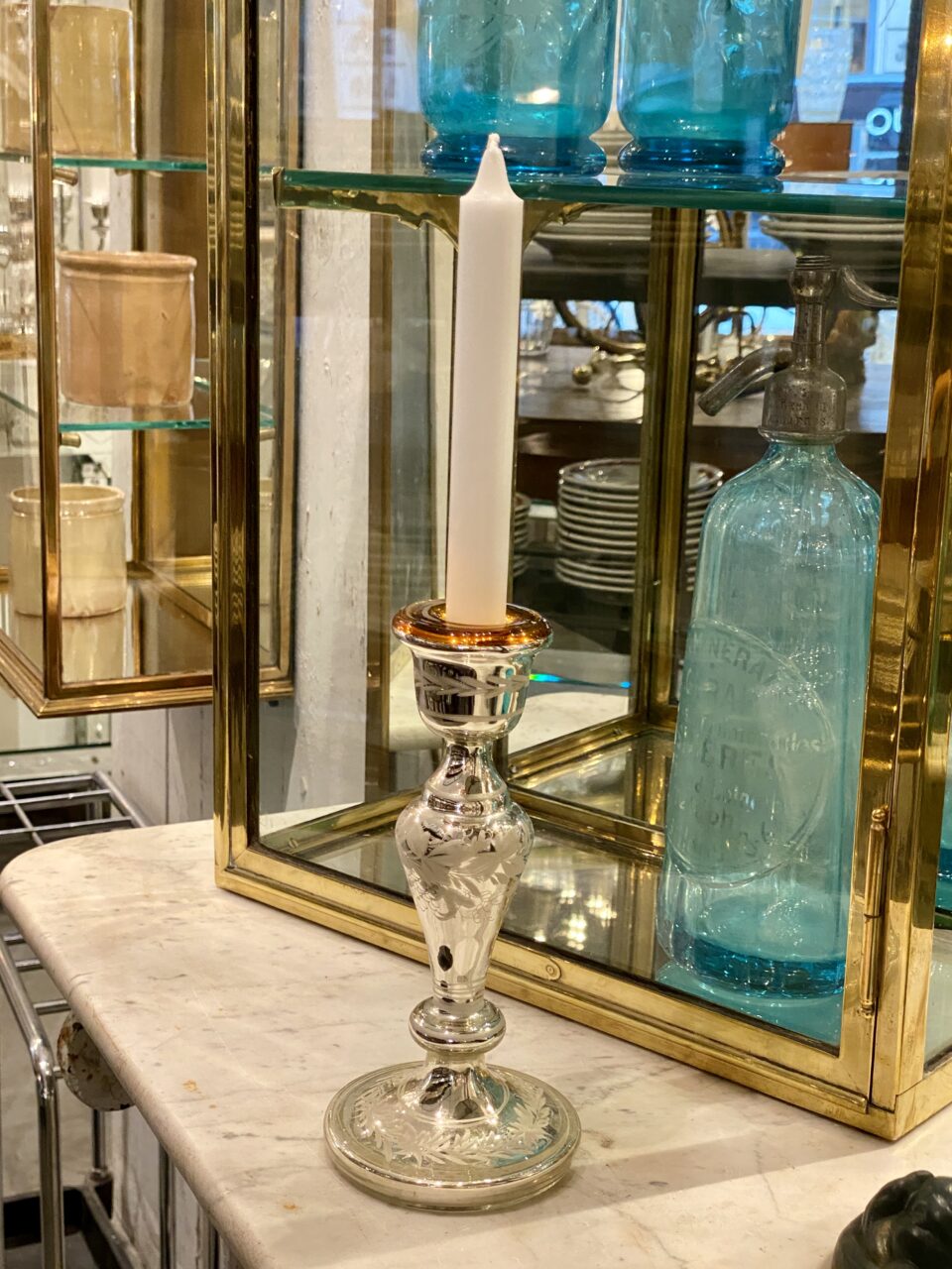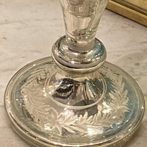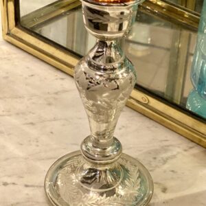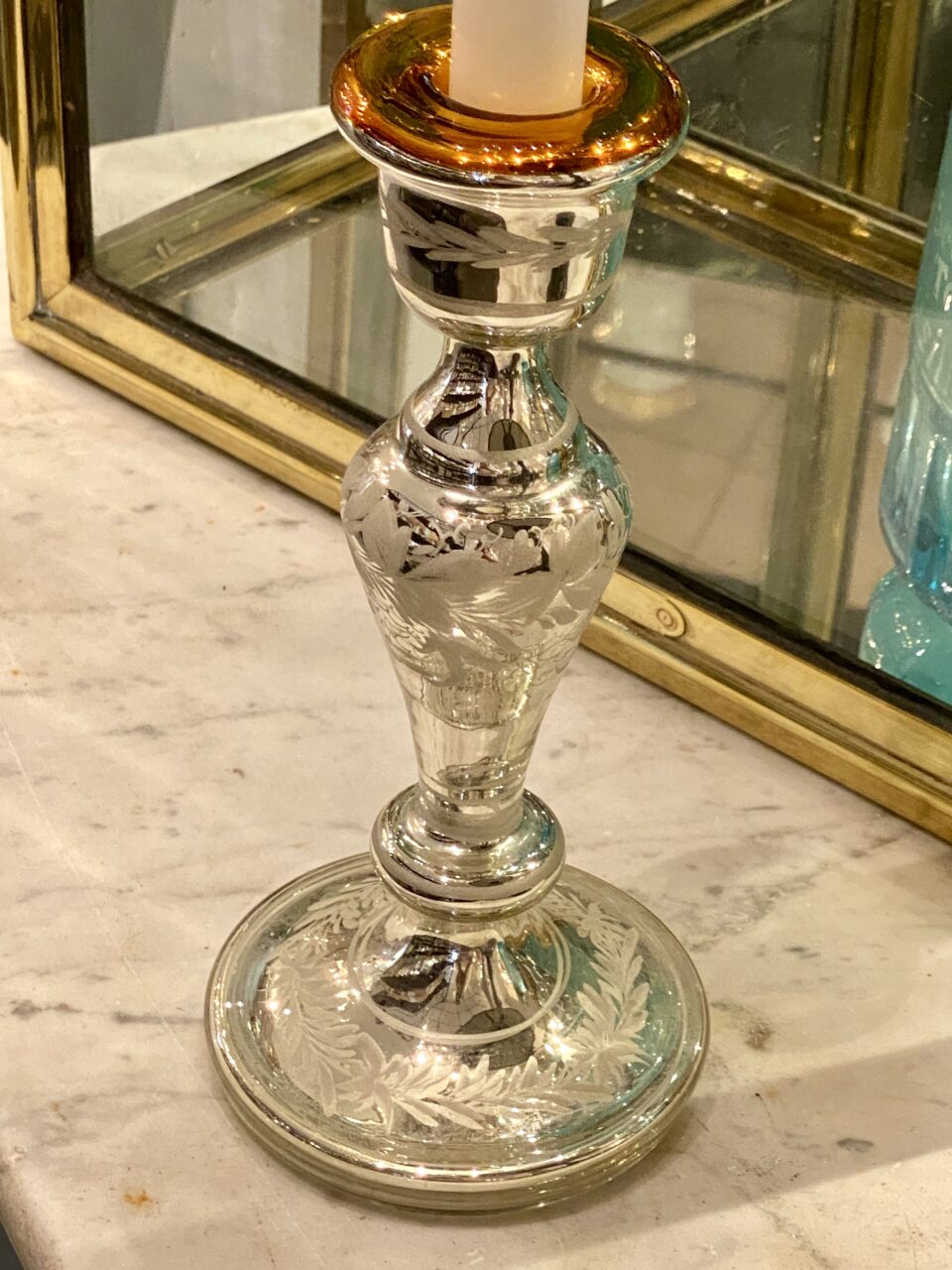 Antique French poor man’s silver candlestick, in mouth-blown glass with charming mercury coating inside. This very elegant candlestick has pretty vine garland ornamental pattern remnants and beautiful patina in the glass, and the top has a copper/golden hue.