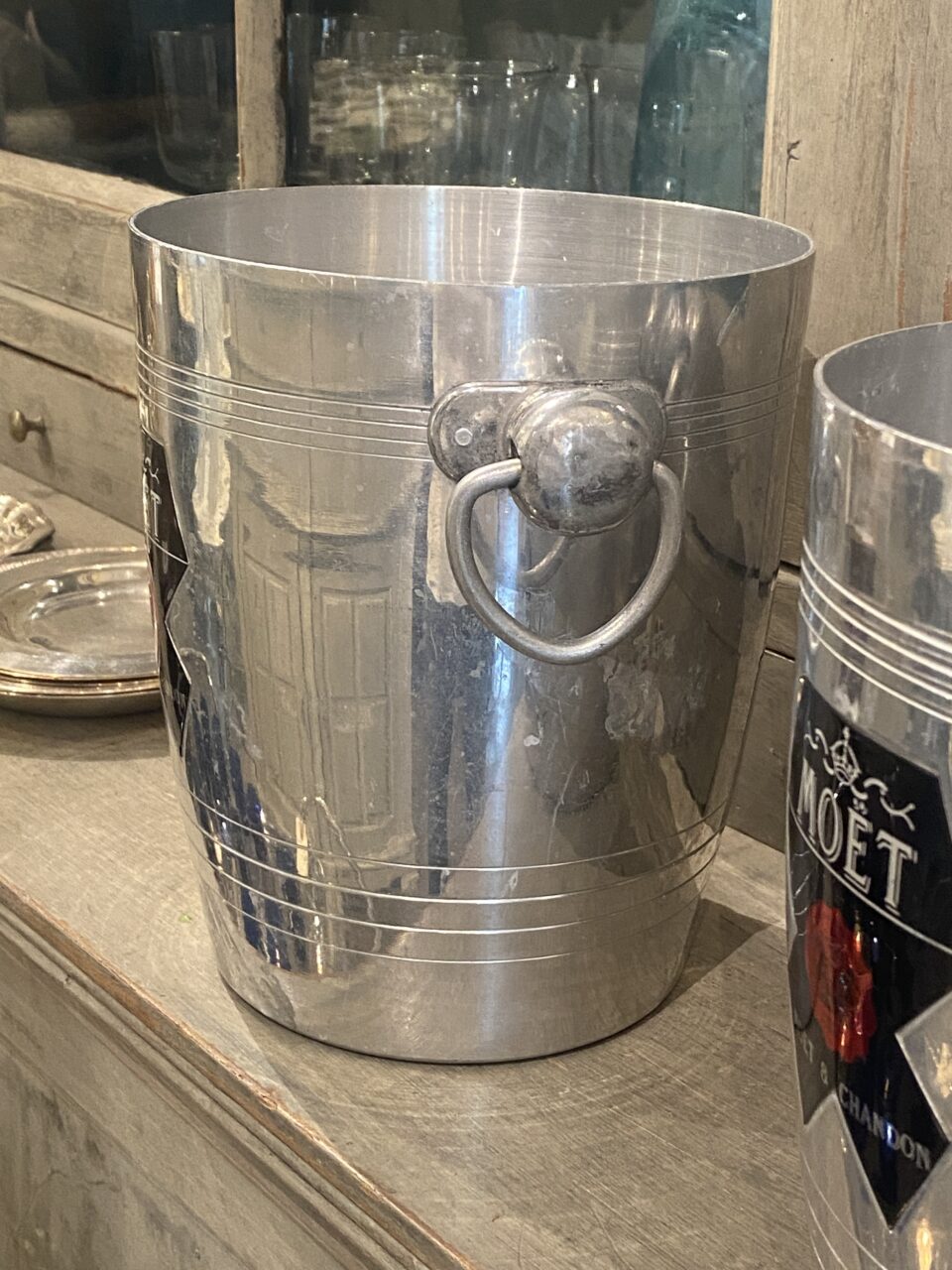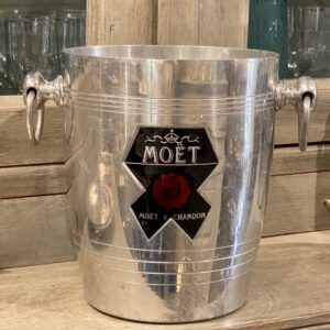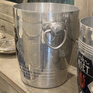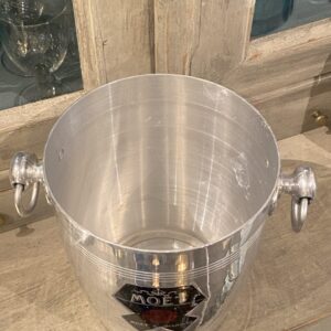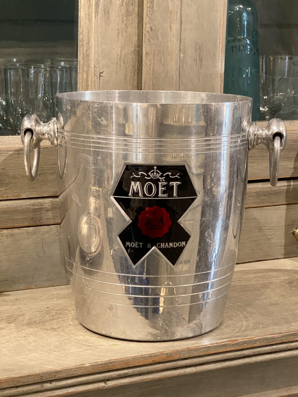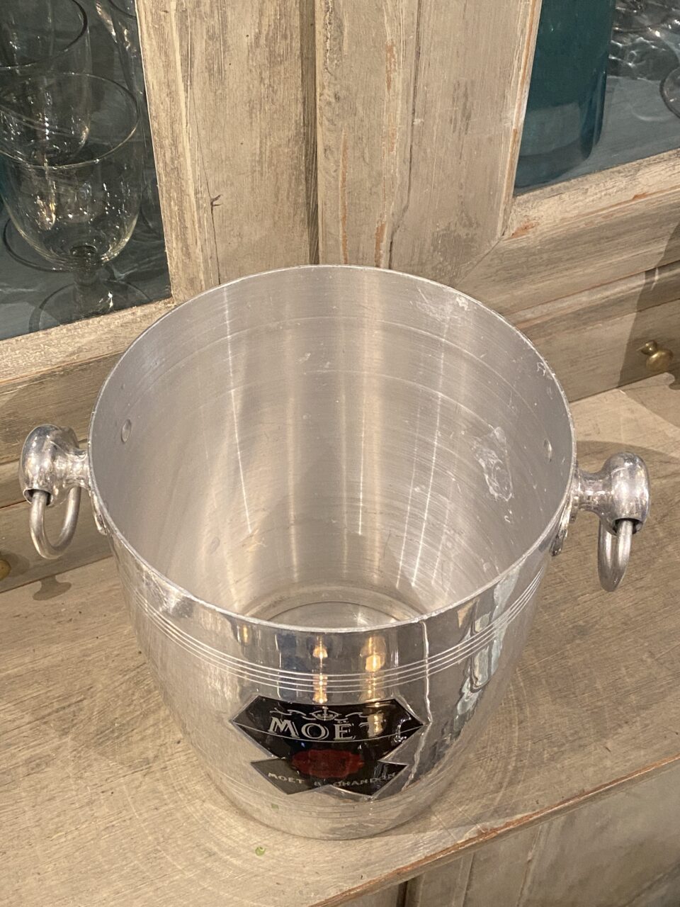 Handsome and nostalgic old French champagne cooler/bucket. Formed in aluminum with the champagne producer’s Moët & Chandon clearly marked on the side.