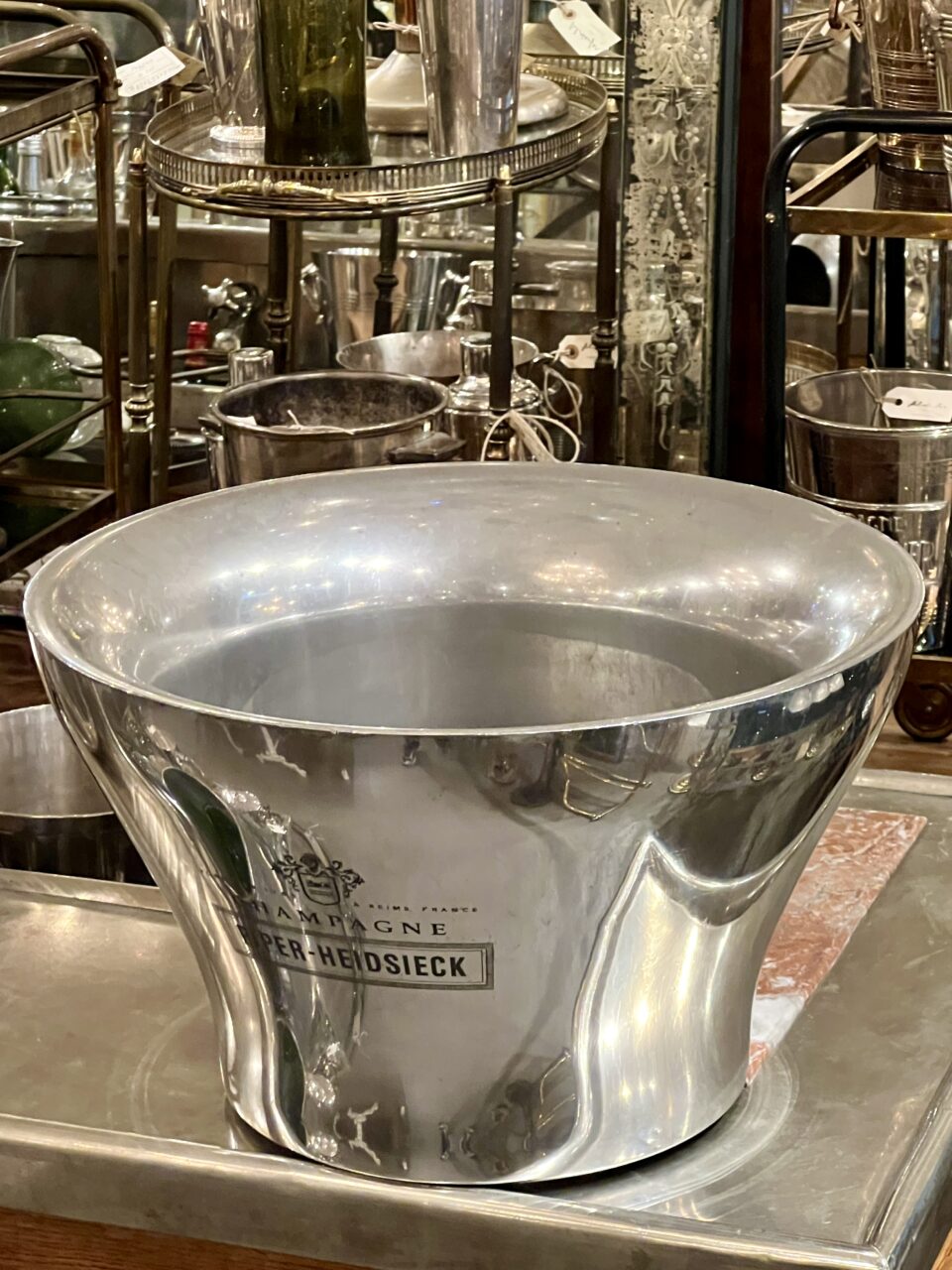 Large, handsome, and double-walled champagne cooler in quality polished pewter, with generous and refined lines, from the renowned Piper-Heidsieck champagne house.