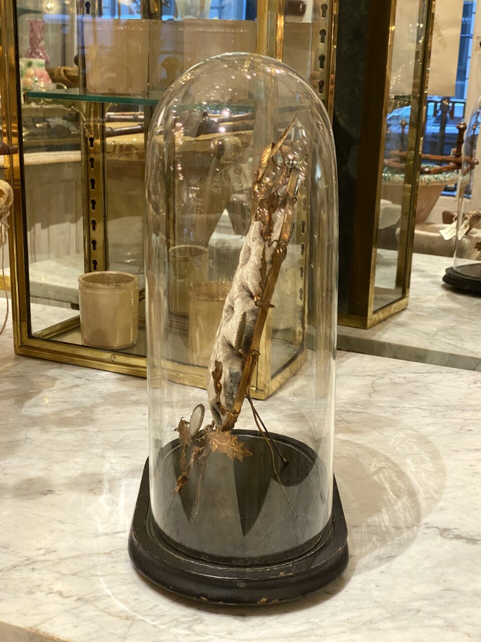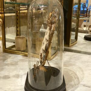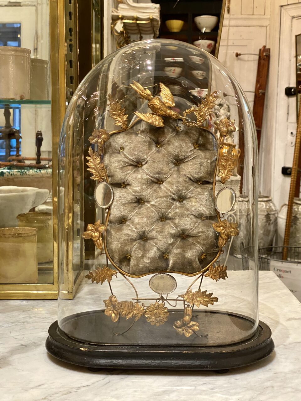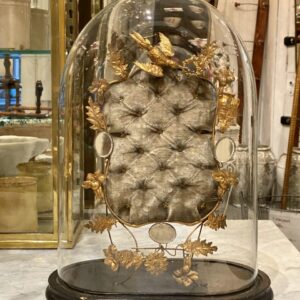 This dome has been used as a wedding display case (globe de mariée) to display momentos from the wedding such as jewellery, wax flowers from the bridal wreath, photographs, etc.