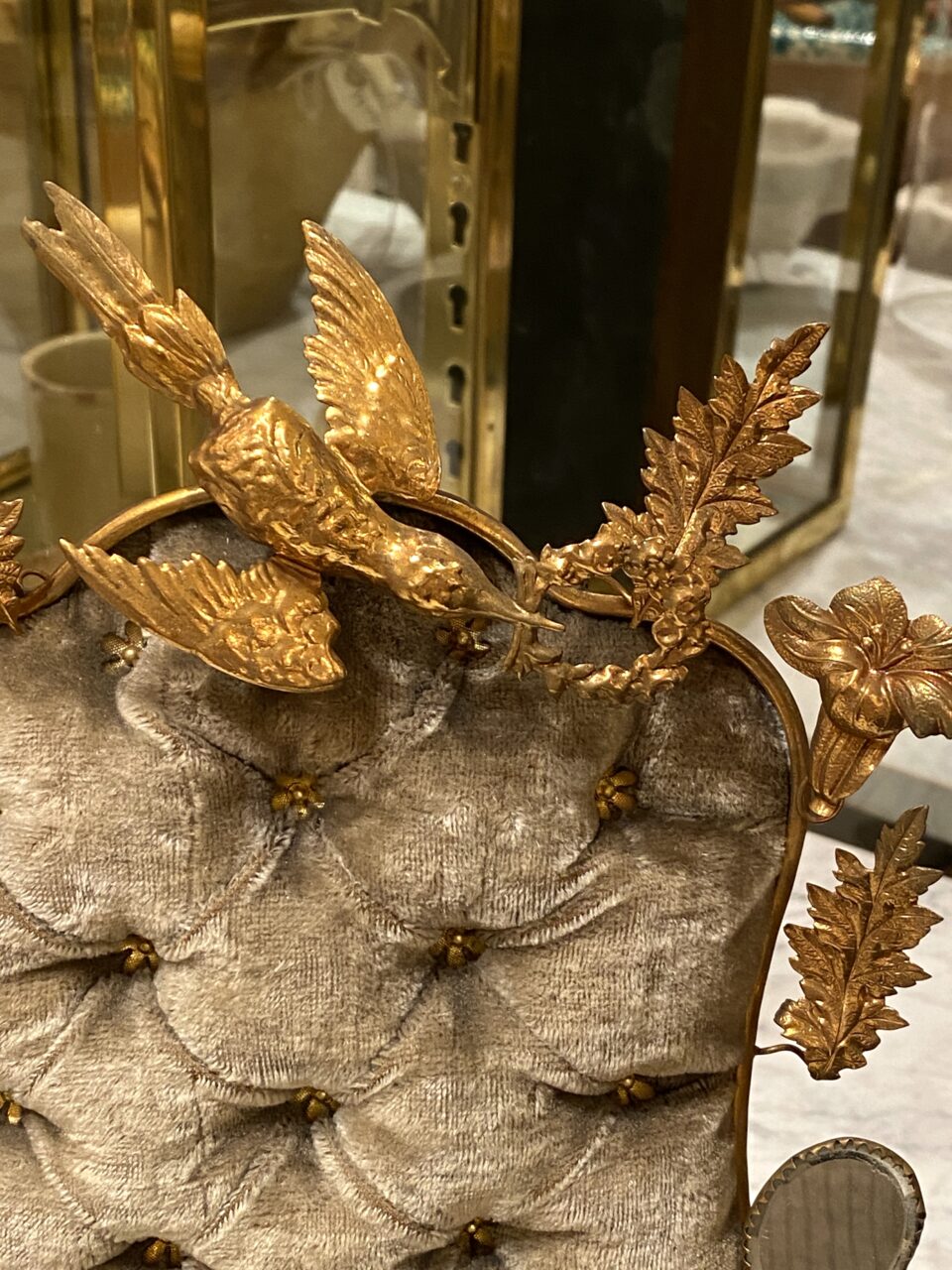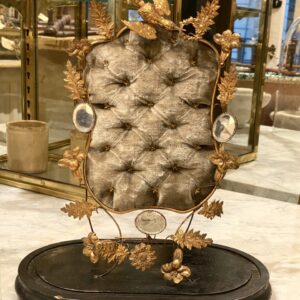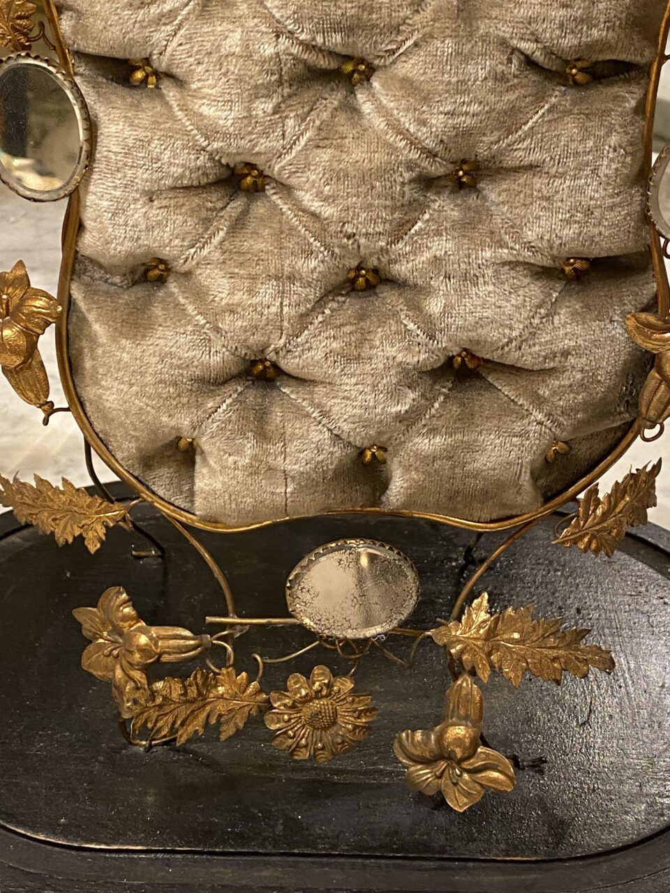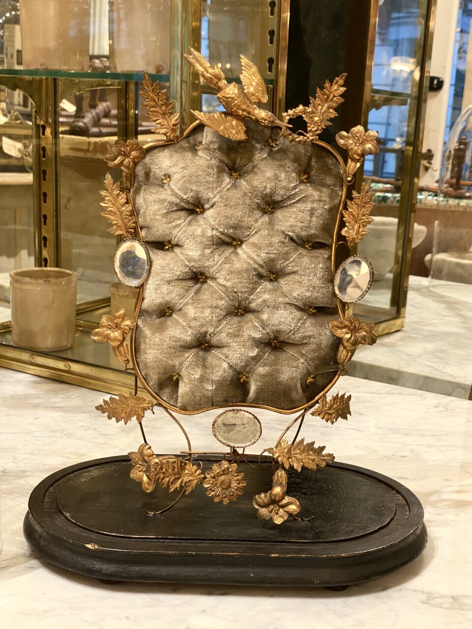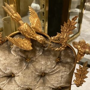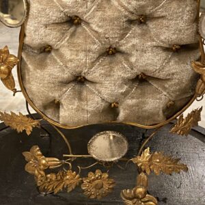 A completely original and very well maintained piece, with a velvet-covered cushion, gilded frame with numerous decorations of foliage, birds, flowers and small charming mirrors.
