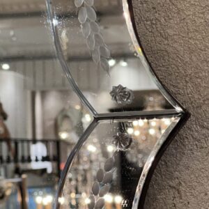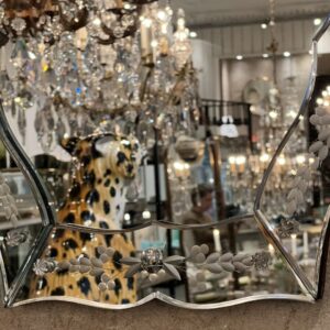 This piece has floral ornamentation along the edge of the mirror frame.