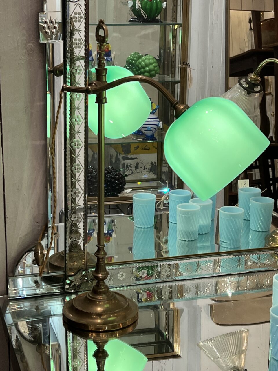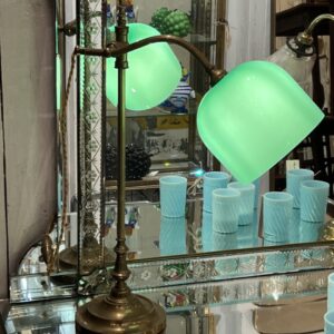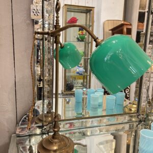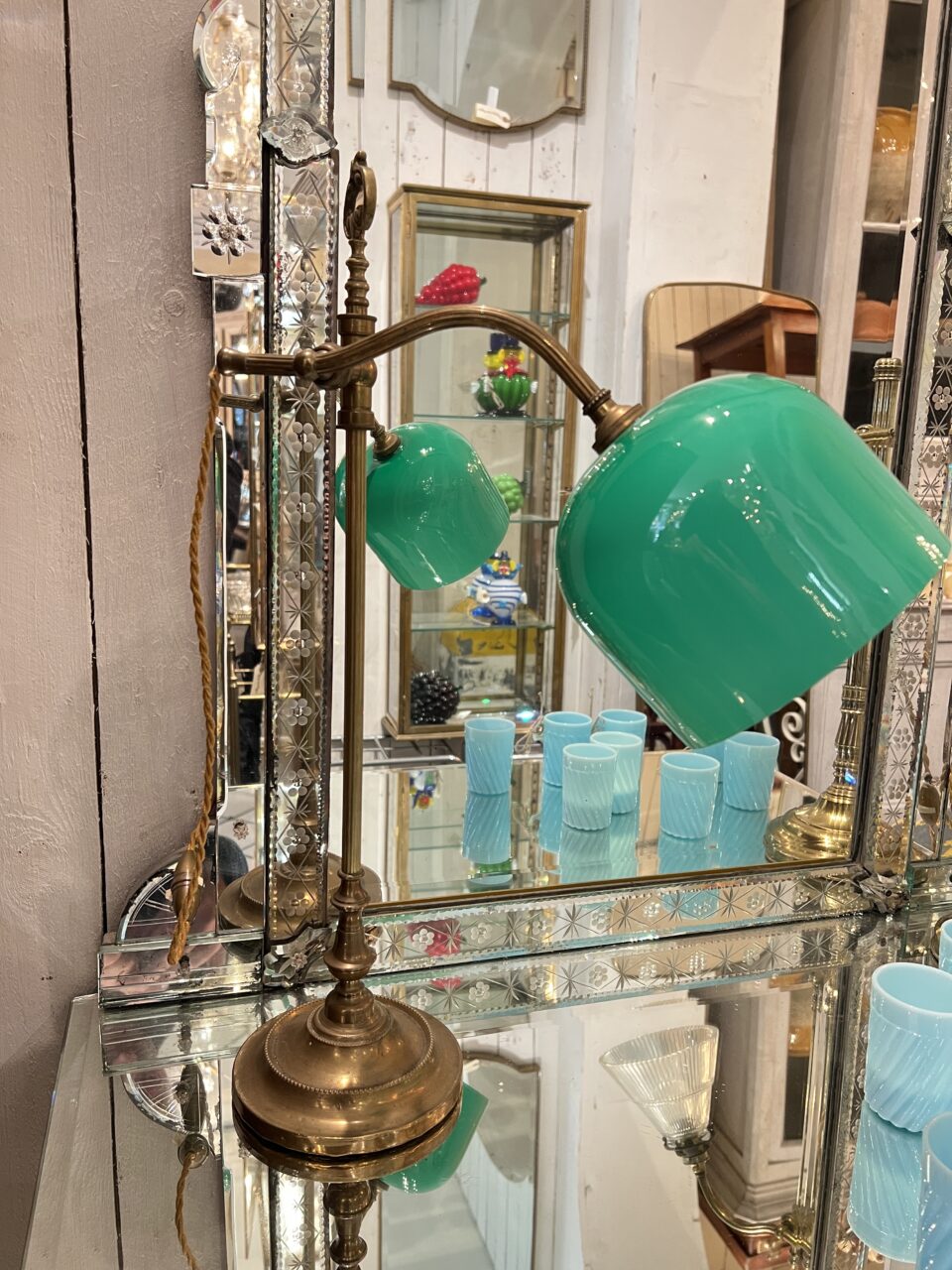 Handsome and appealing antique desk / study lamp from France. Formed in brass, with a beautiful simple lampshade in green glass.