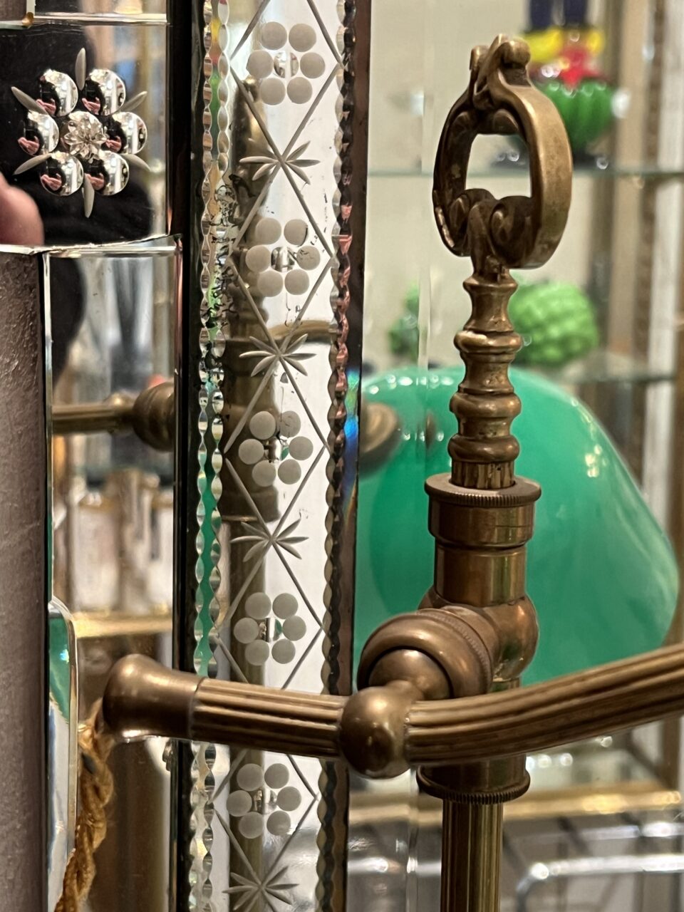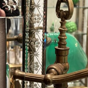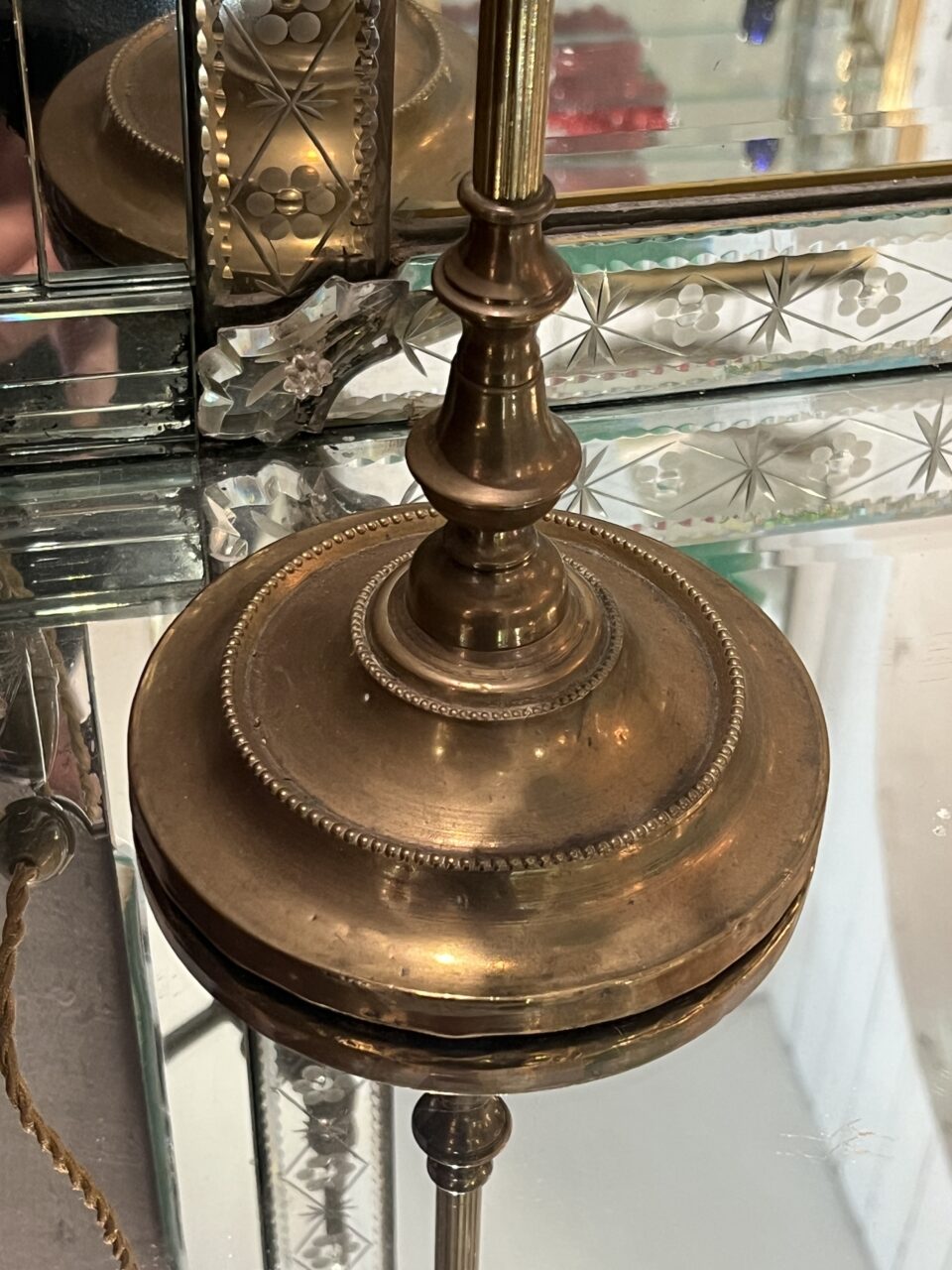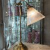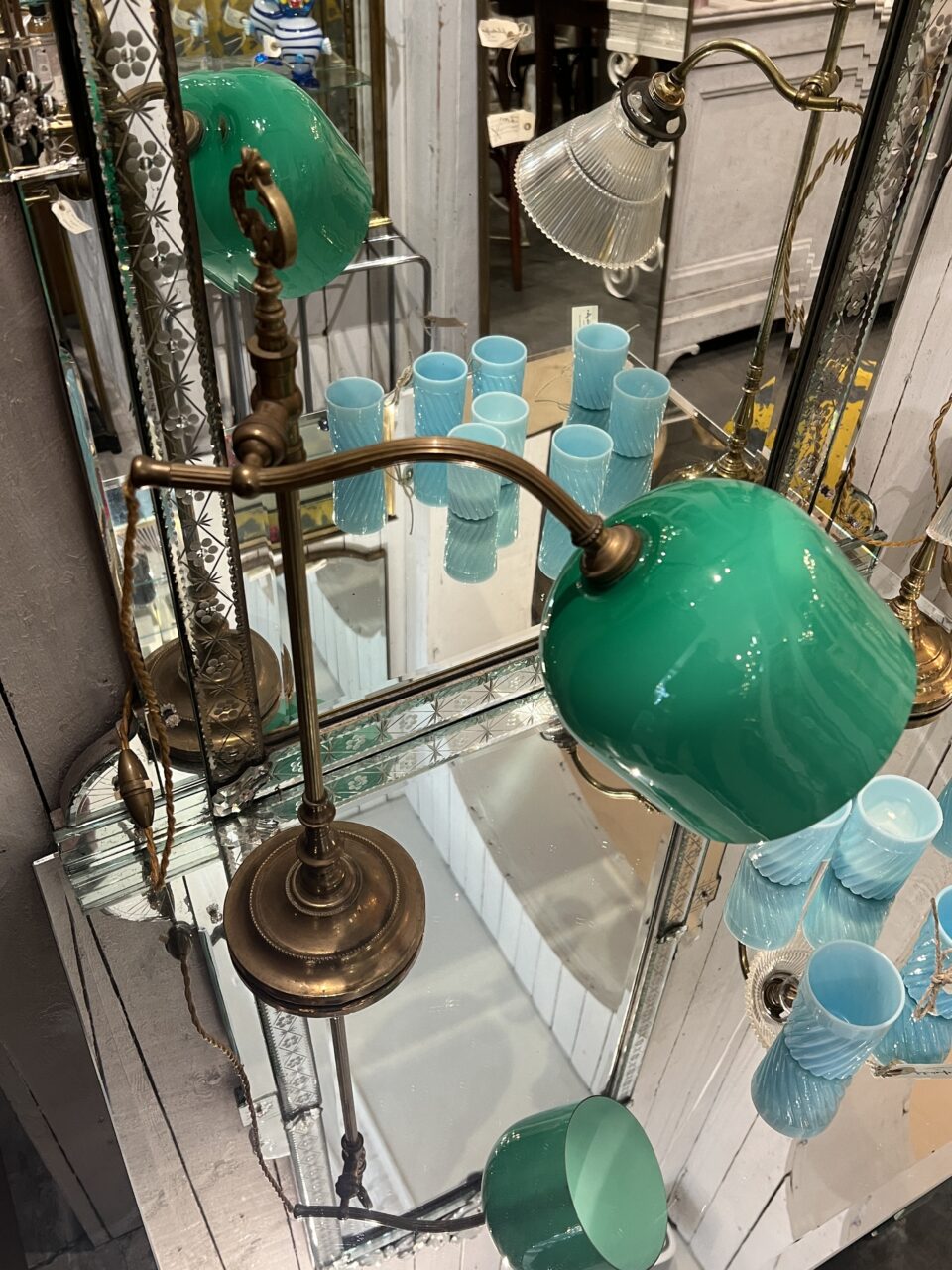 Handsome and appealing antique desk / study lamp from France. Formed in brass, with a beautiful simple lampshade in green glass.