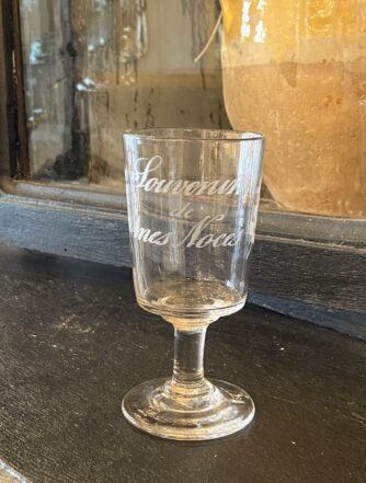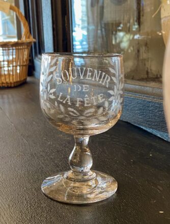 Classic mouth-blown everyday glass, in a beautiful cup form, and with charming globe on the stem. Circa 1880-1900s France, and used by the average Frenchman for both red and white wine.