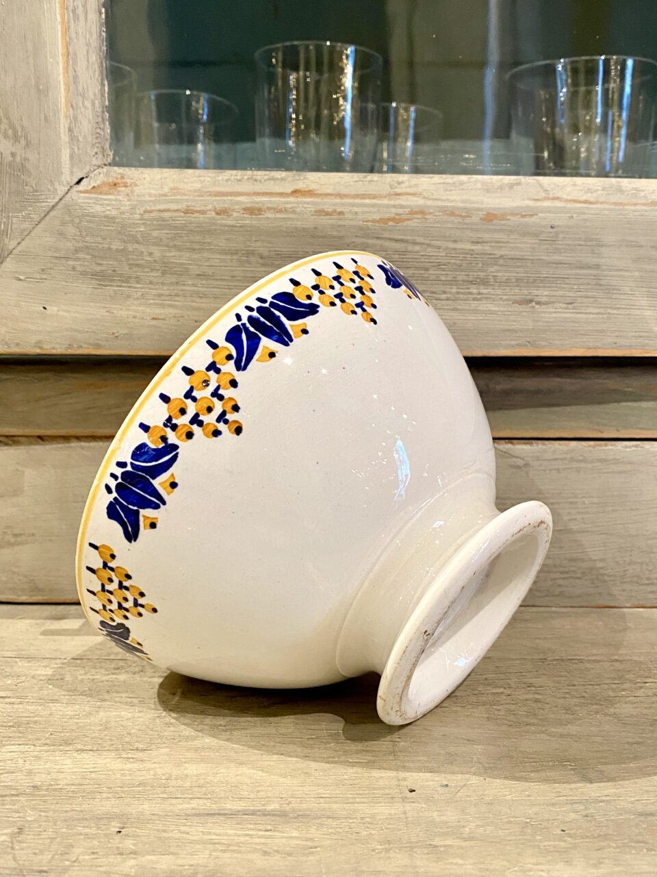 Lovely French café au lait drinking bowl (otherwise known as ‘bôl’). Glazed off white ceramic, with authentic patina, and with a pretty hand painted design in warm yellow and blue. A super addition to any kitchen, breakfast table or terrace. Whether for coffee, breakfast cereal or olives and nuts.