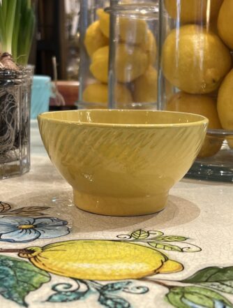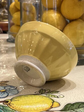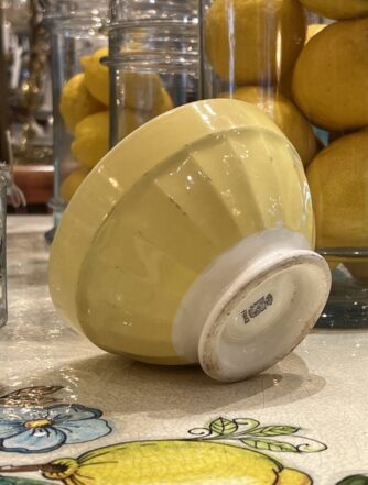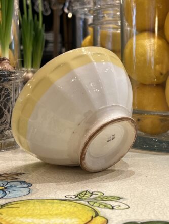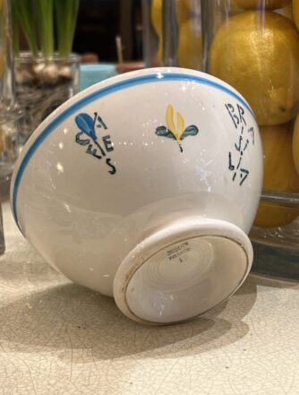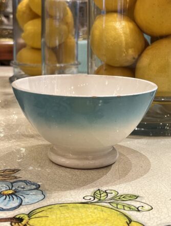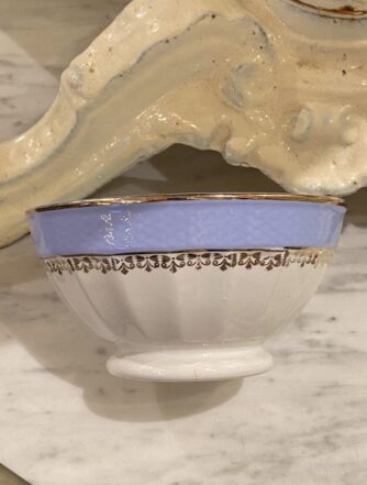 Charming French café au lait drinking bowl (otherwise known as ‘bôl’). Glazed white ceramic with lovely authentic patina, and a floral with flecks of gold decoration. A super addition to any kitchen, breakfast table or terrace. Whether for coffee, breakfast cereal or olives and nuts.