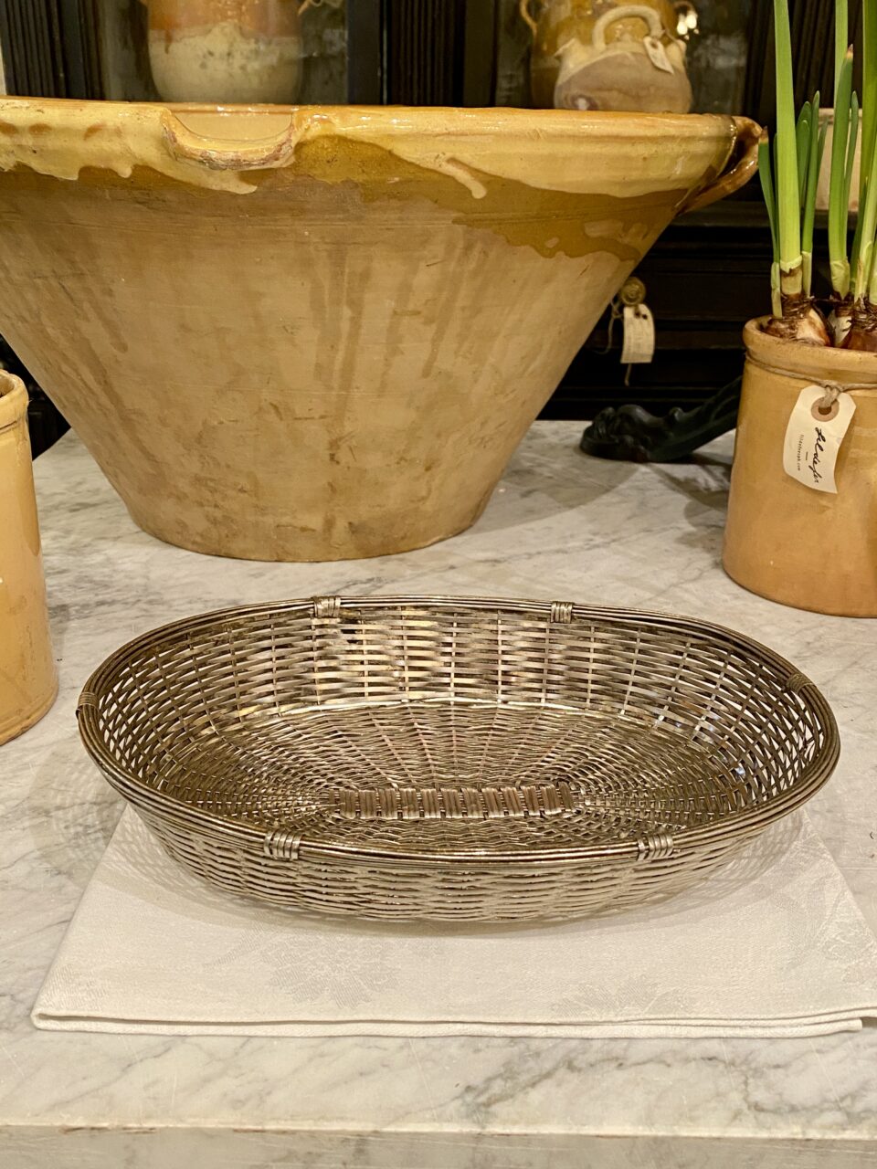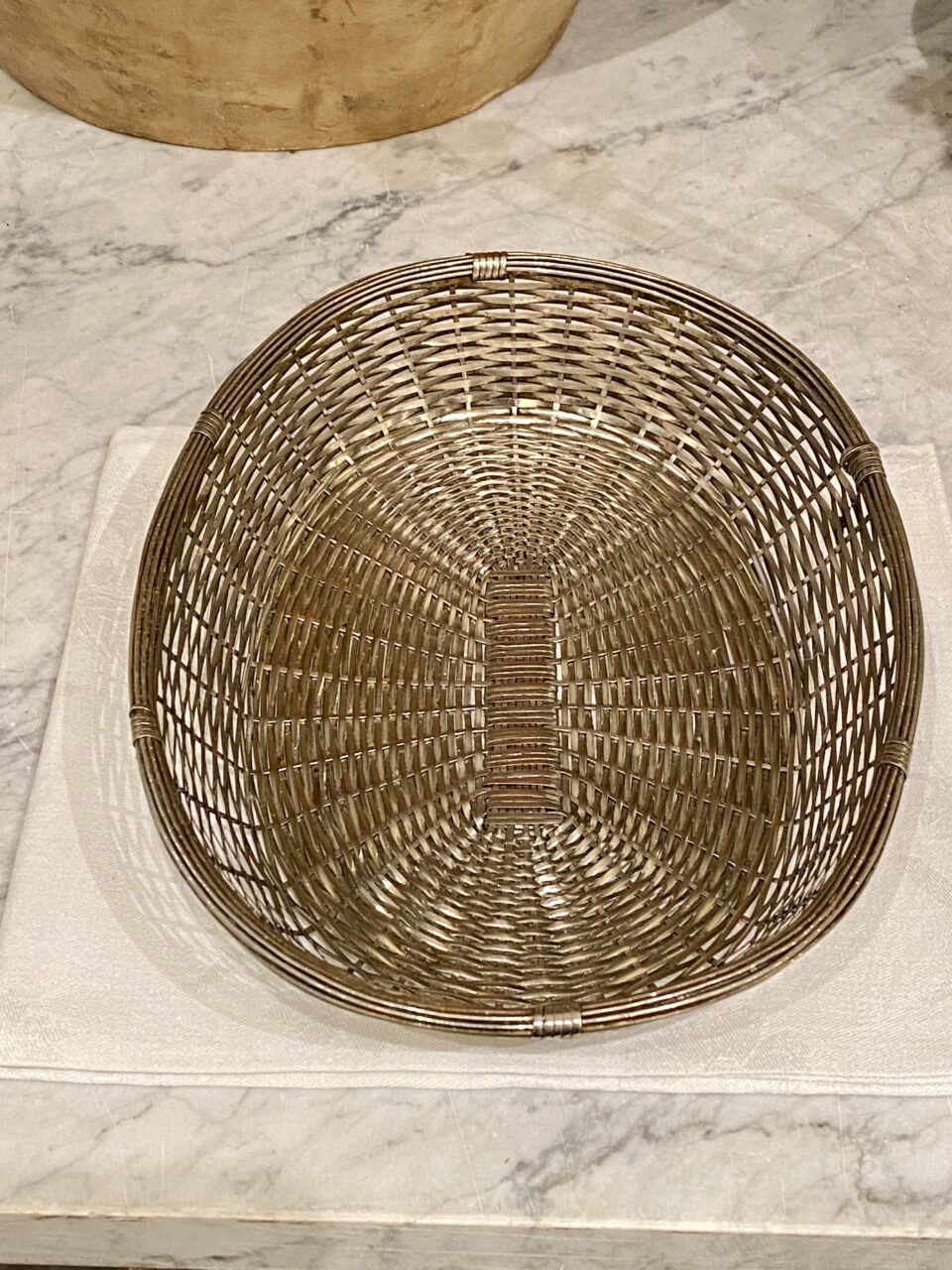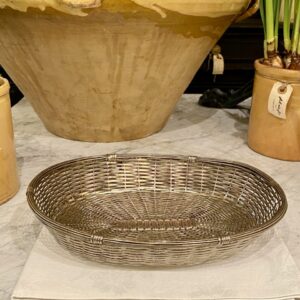 Beautiful oval bread basket.. Made of ‘wicker’ silver-plated metal, and is perfect for serving bread and flutes or for storing small fruits and vegetables in the kitchen.