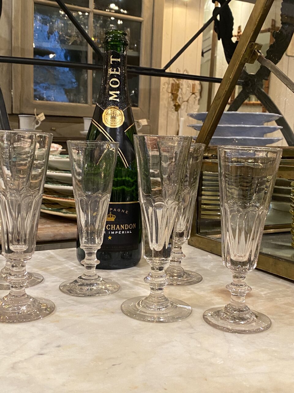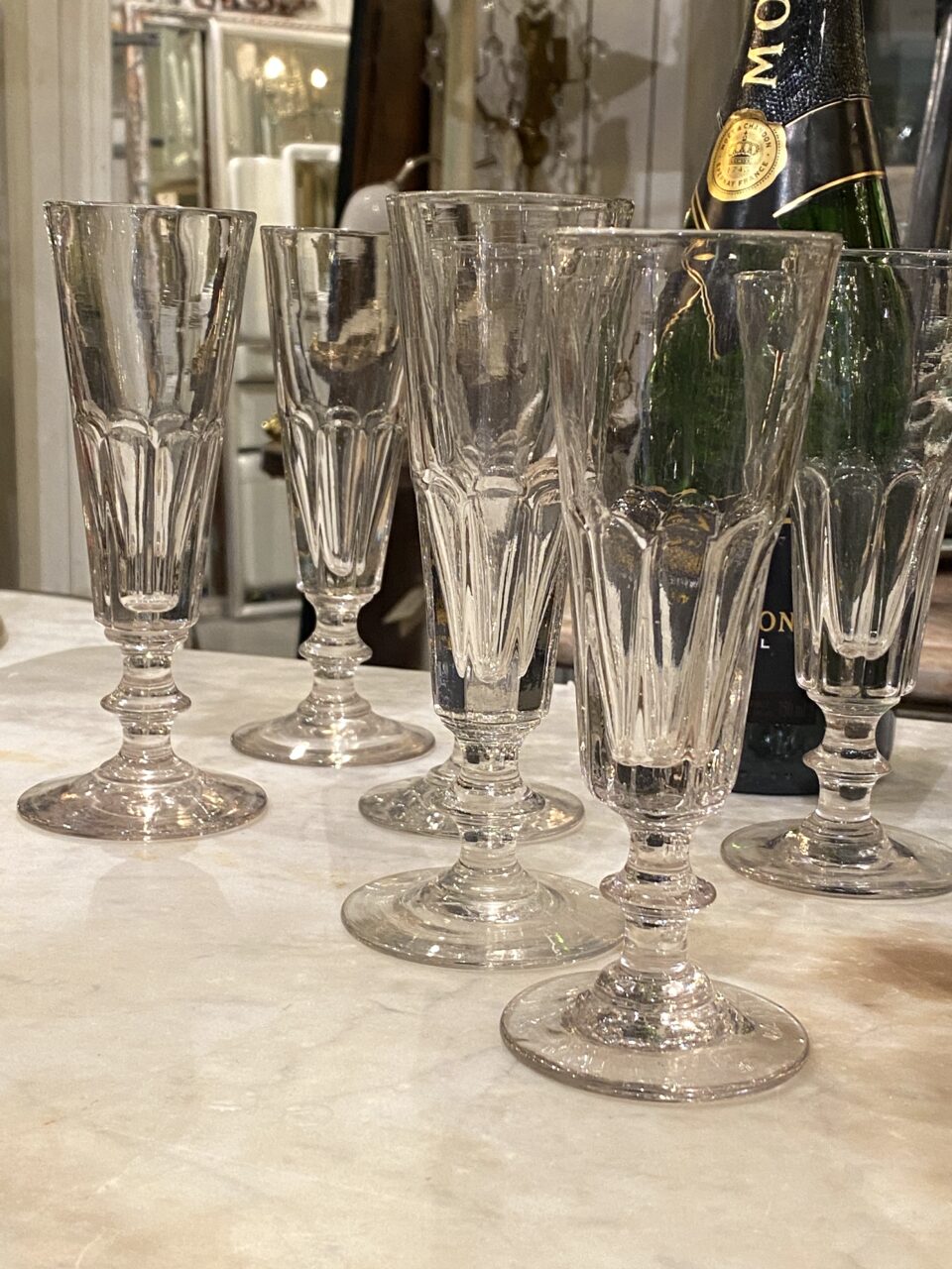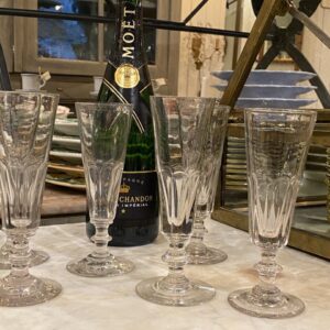 Stylish old French champagne glass/flute from around 1900. The glass has charming bevel work and a beautiful stem, an extremely elegant glass for the table setting or for a festive occasion.