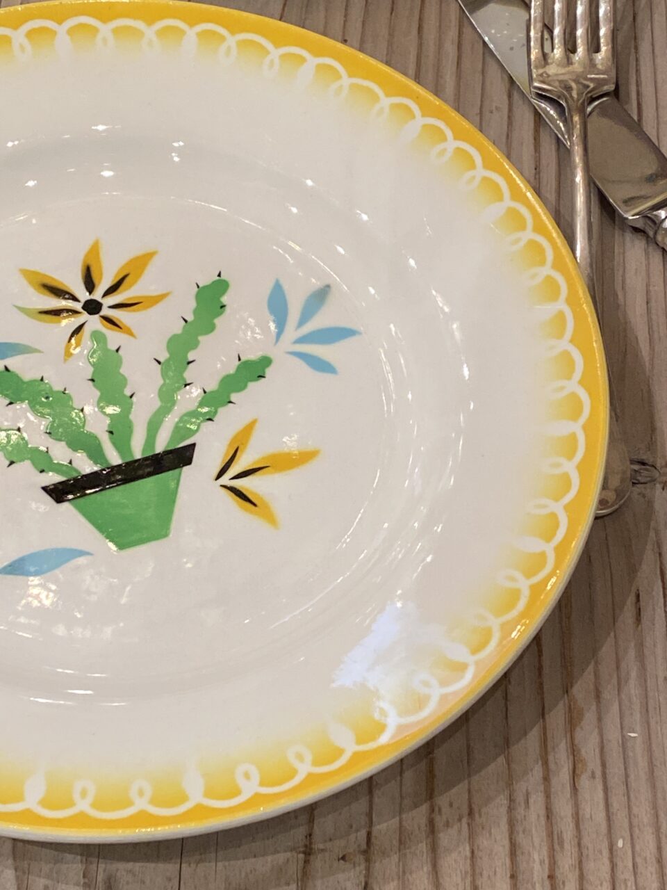 From 1950s France, and in ceramic, then decorated with a colourful floral motif in bright colours and with a lemon yellow border.