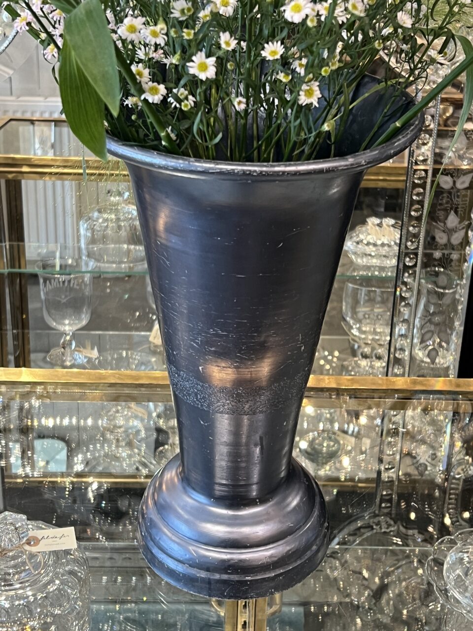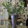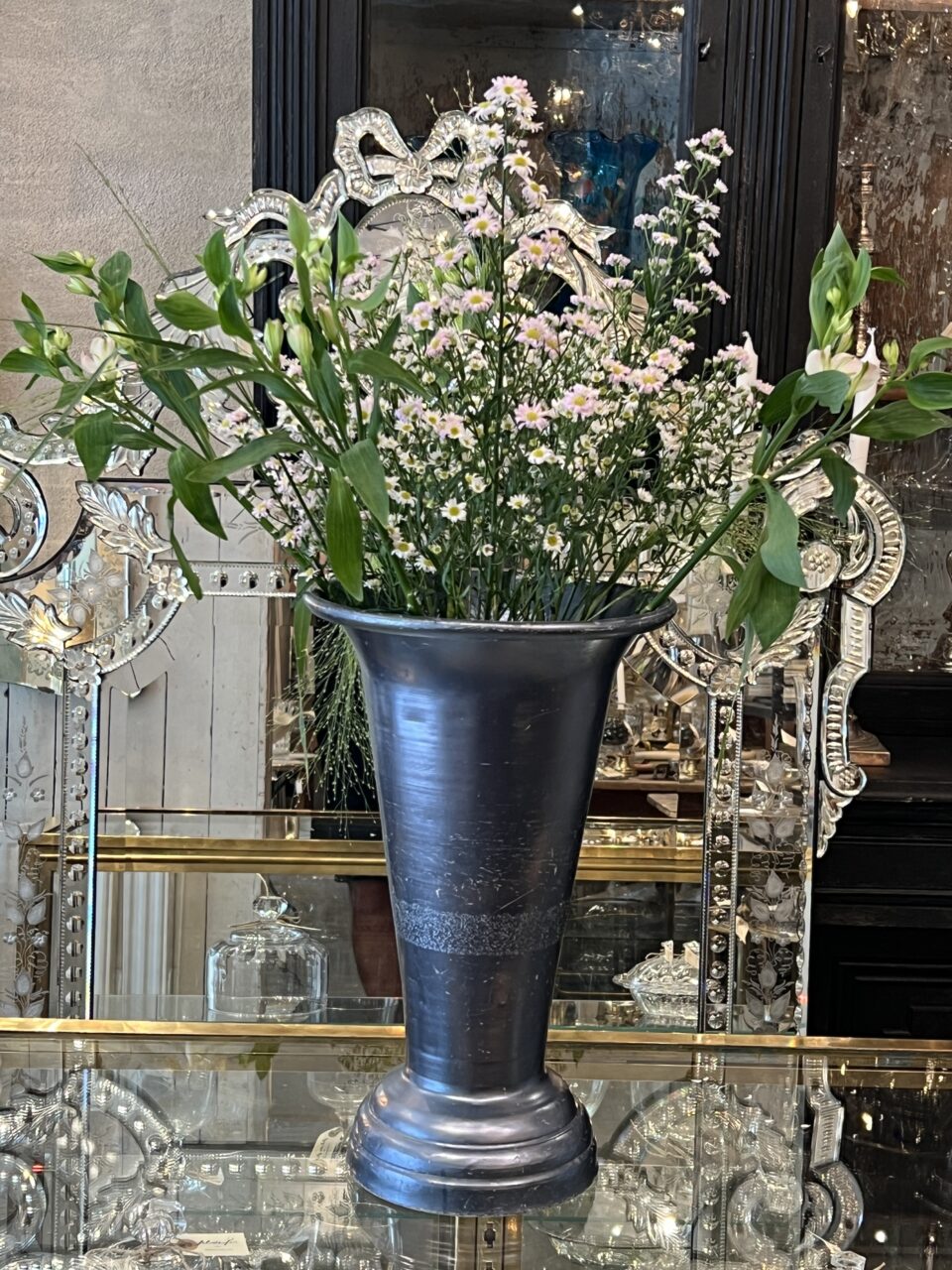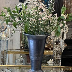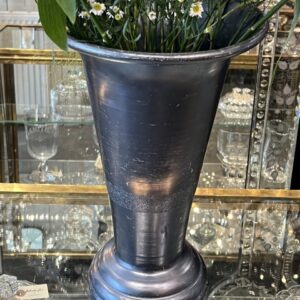 Handsome tall larger vintage French florist vase, from Lyon. Formed in aluminum with a lovely blue-black finish and lots of patina. The vase has an elegant form, and has a weighted base to avoid longer blooms or branches tipping over.