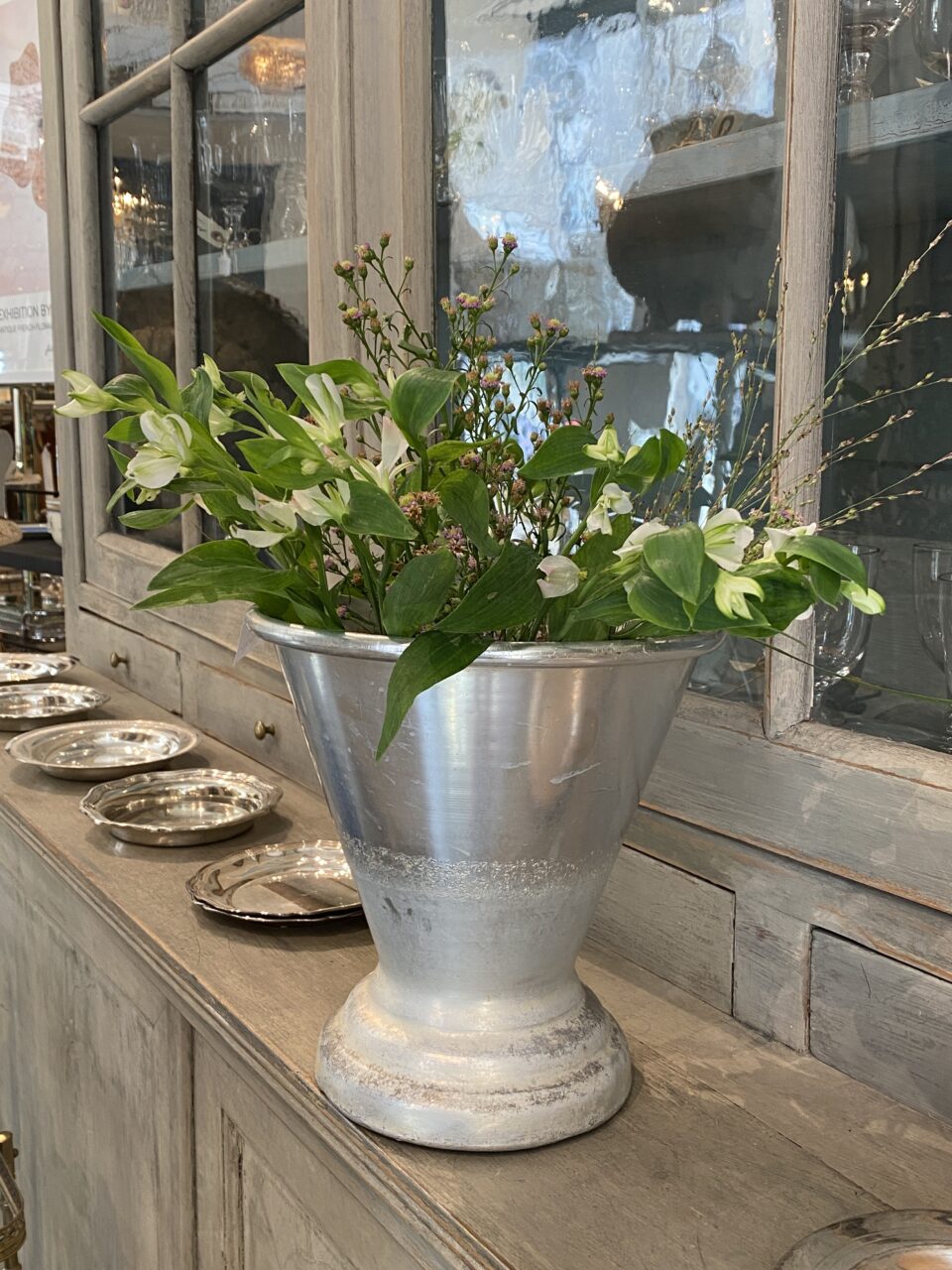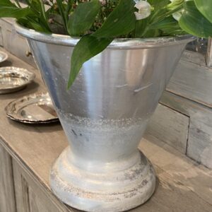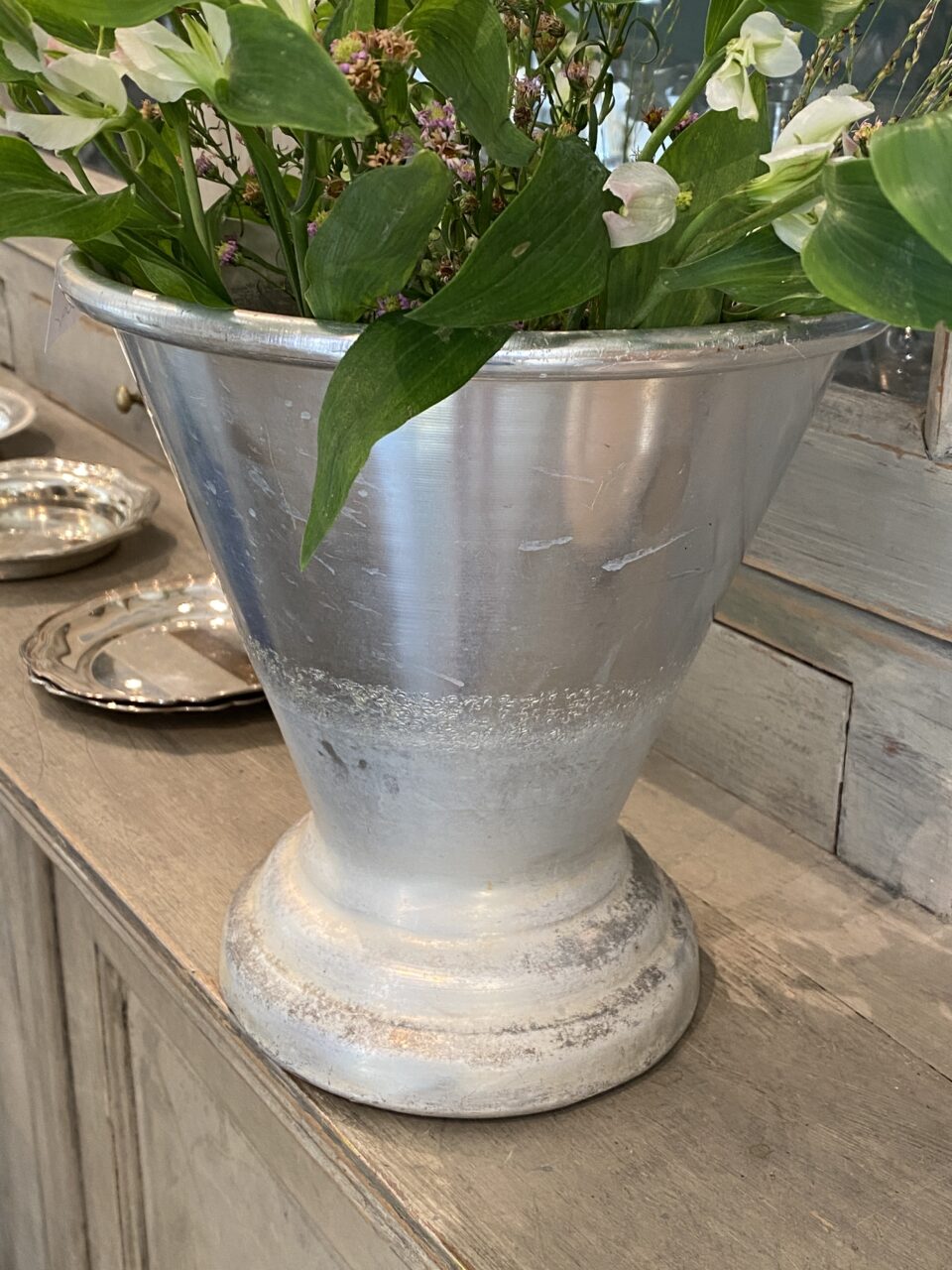 Charming wider and stubby vintage French florist vase, from Lyon. Formed in aluminum with a lovely silvery finish and lots of patina. The vase has an elegant form, and has a weighted base to avoid longer blooms or branches tipping over.