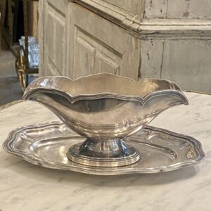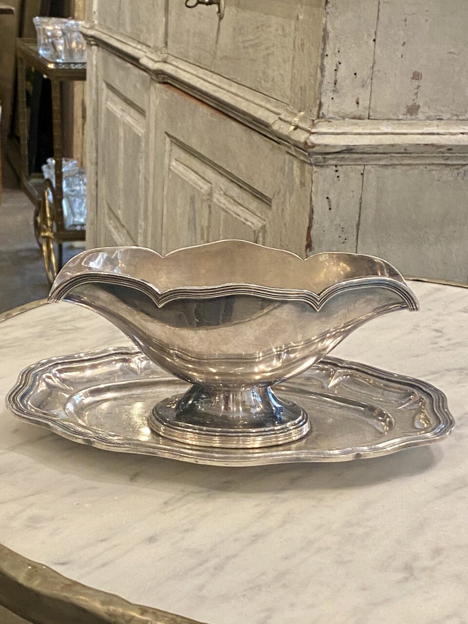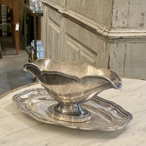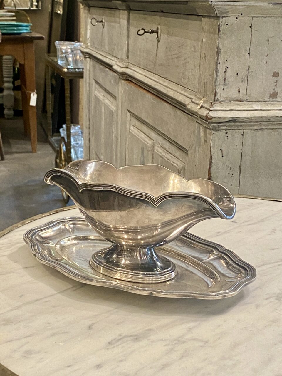 Elegant old oval French sauce bowl/gravy jug in silver-plated brass and raised on a foot. The sauce bowl stands firmly on the oval tray, prettily patterned along the edge.