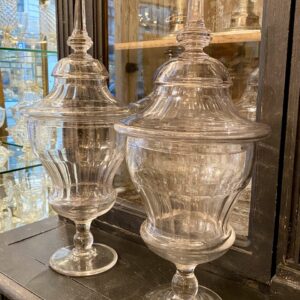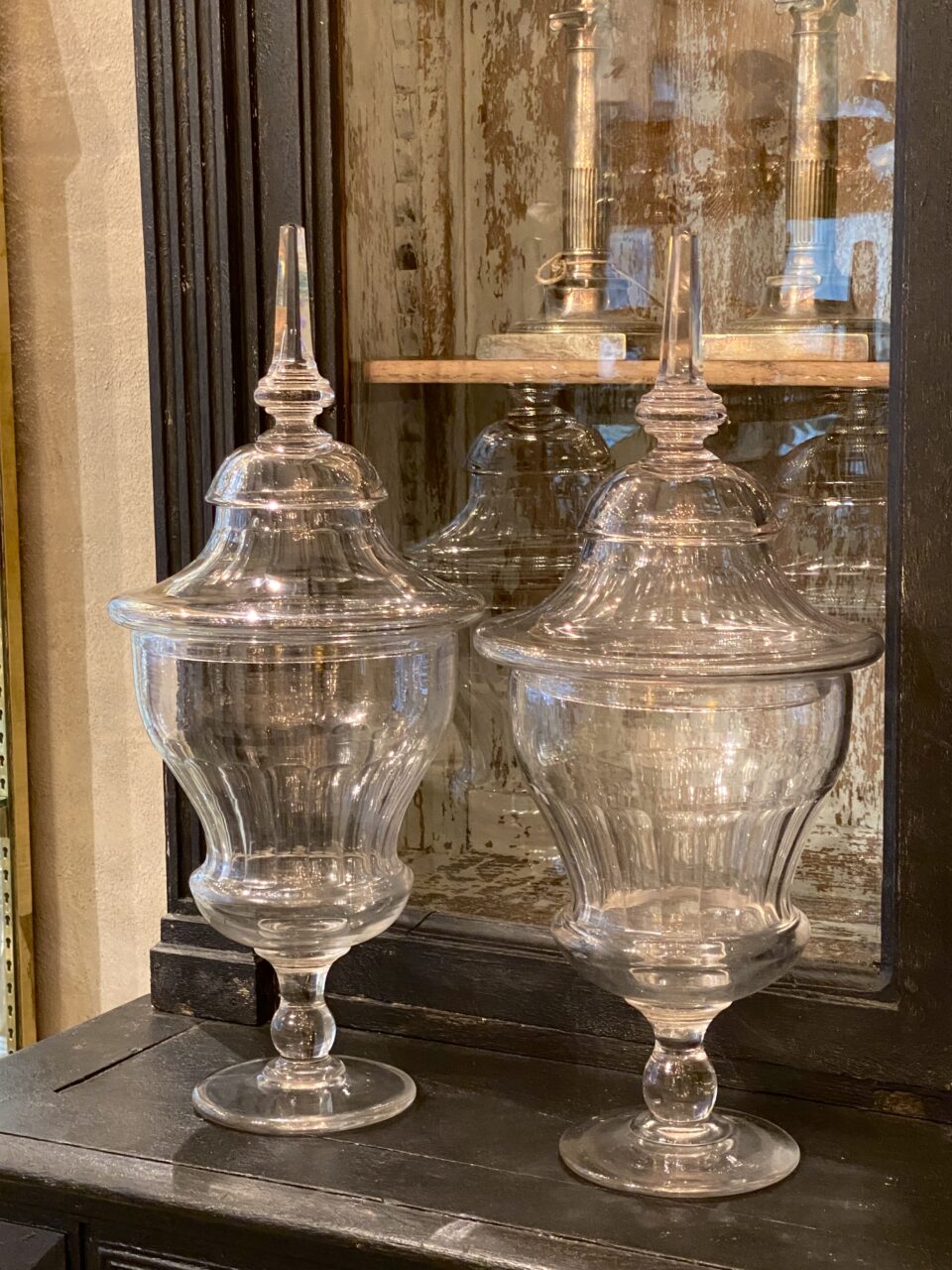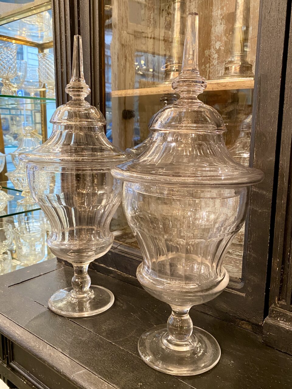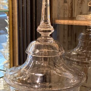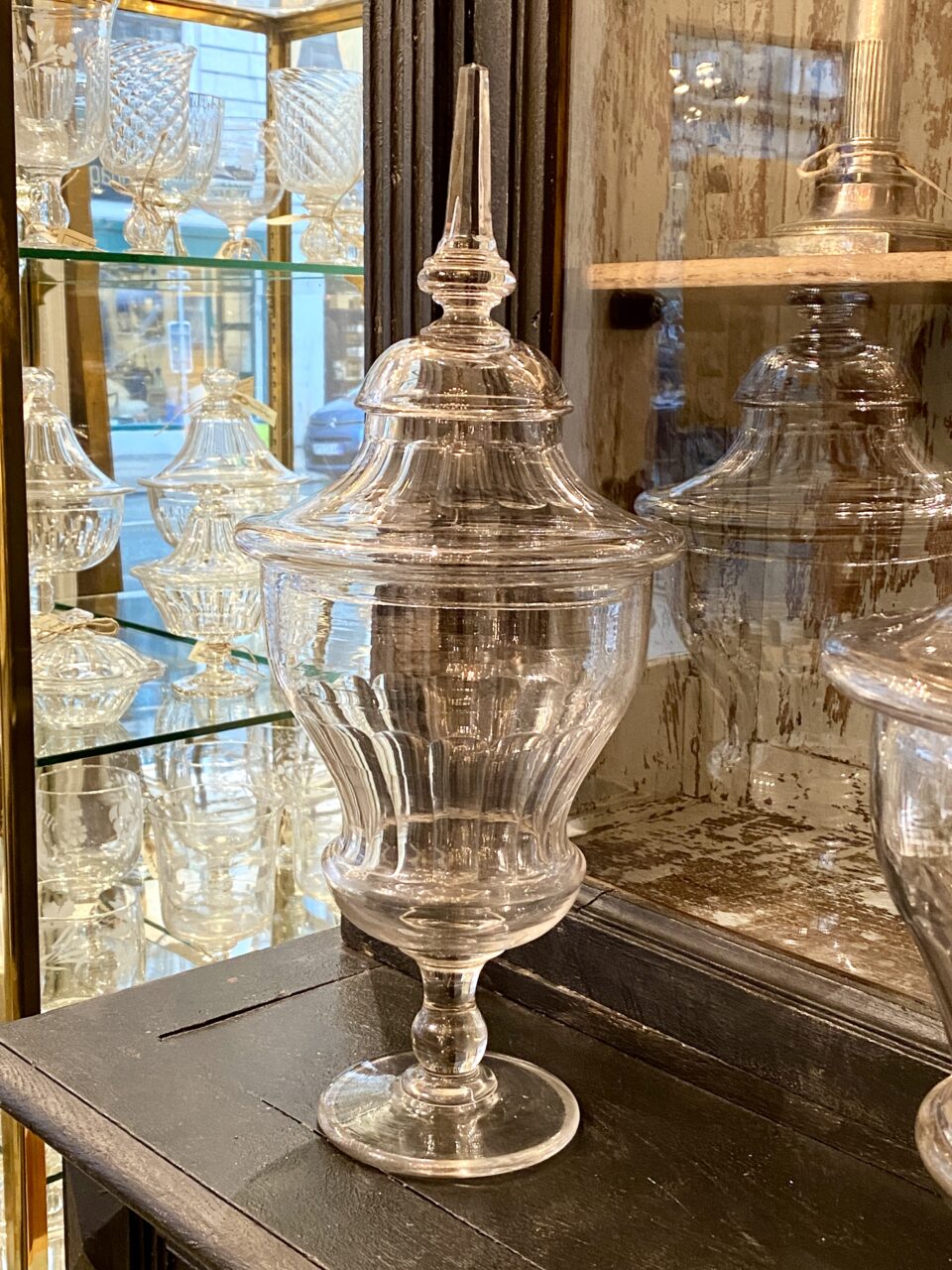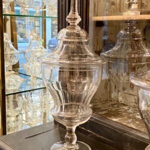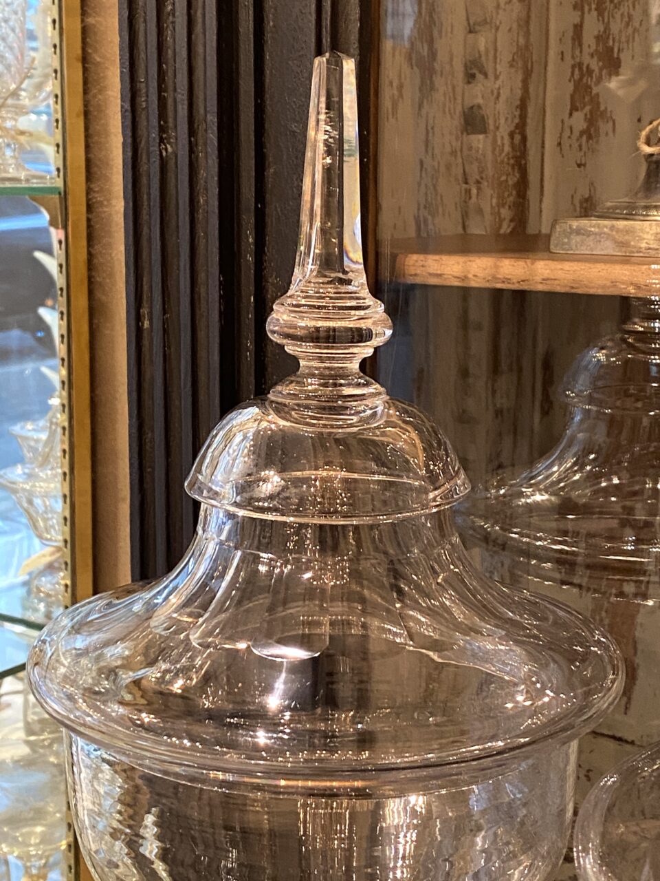 Stunning and eye catching antique French apothecary glass with lid made of quality solid crystal glass. The impressive pharmacy glass / drageoir is elegantly designed with many facet cuts, raised on a base, and with the most beautiful large spire on top.
