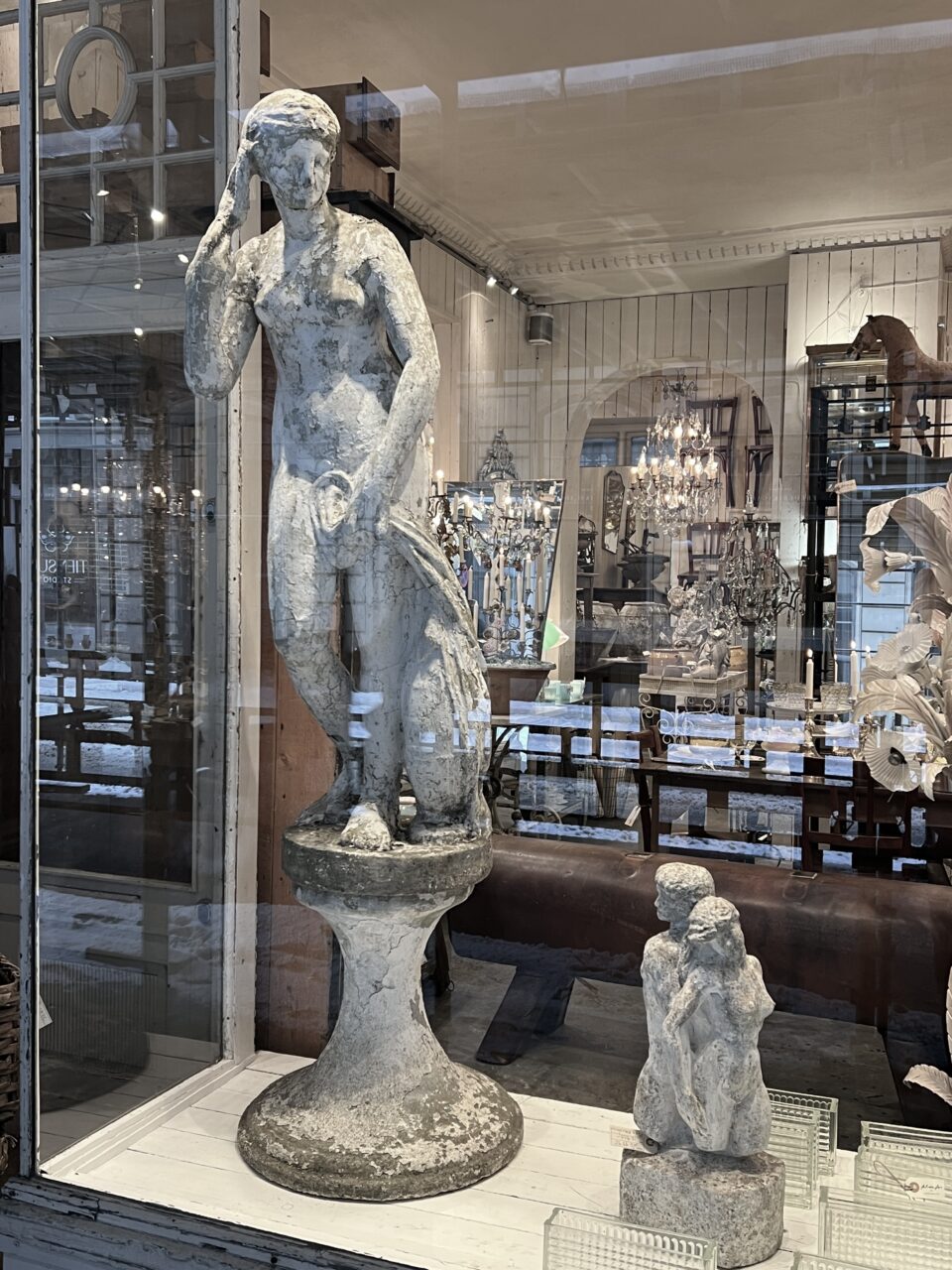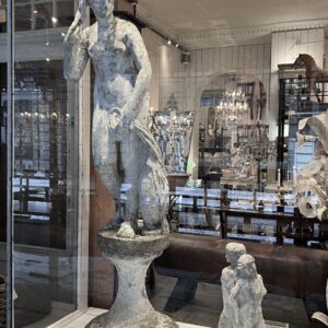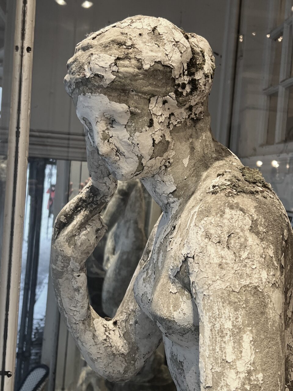 Statuen har en meget eftertænksom positur, hvor hånden rører hendes hår og en beskeden drapering til at vise både hendes krop og en stoflighed.