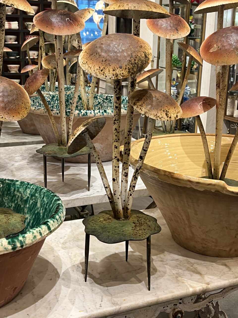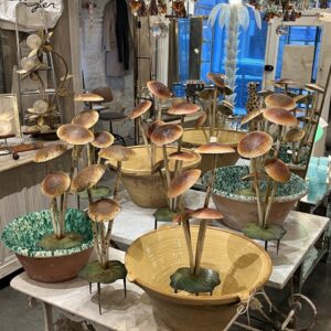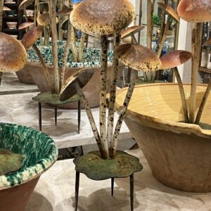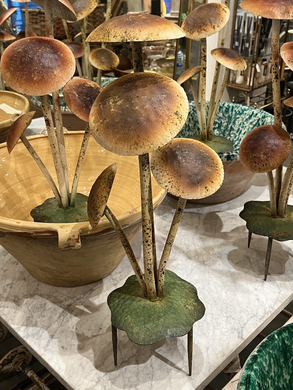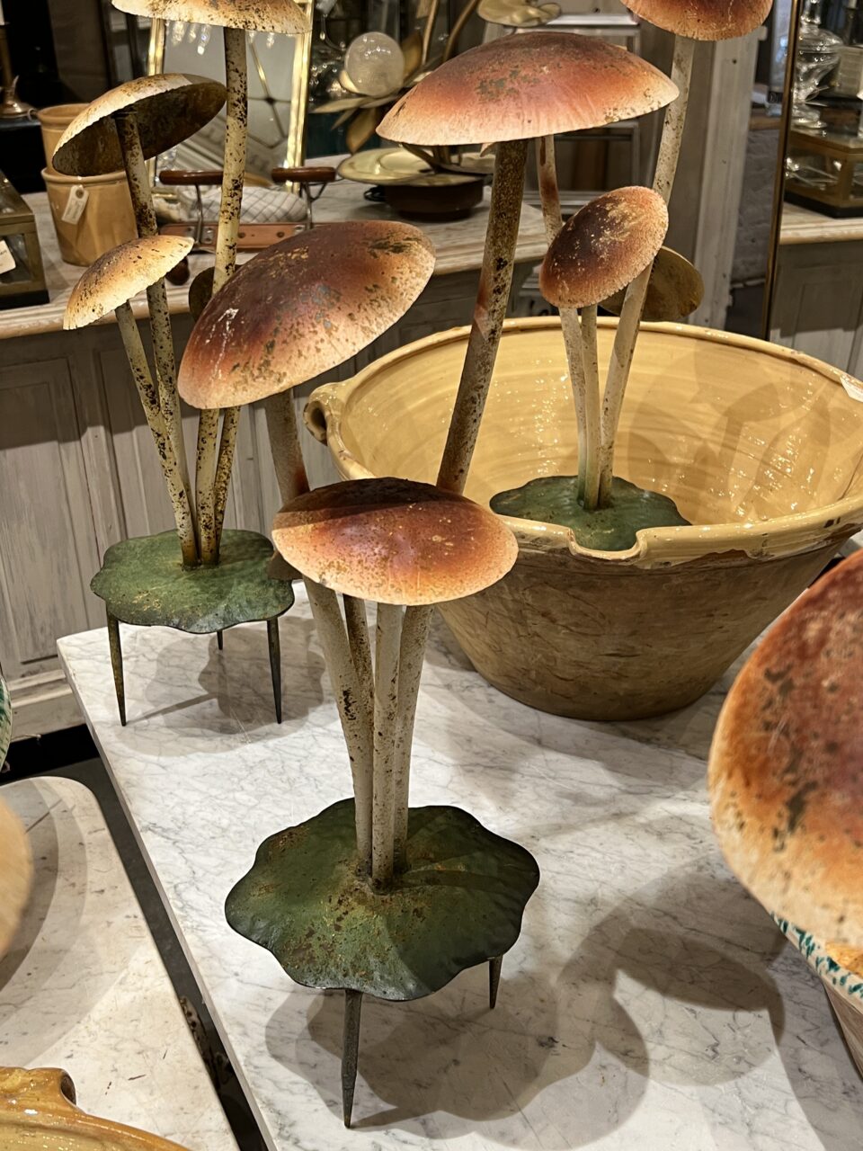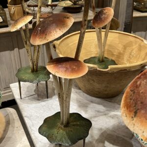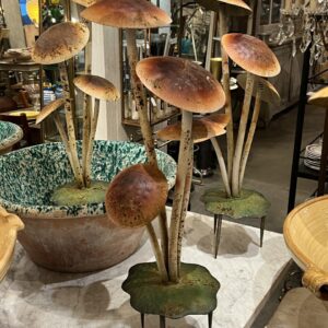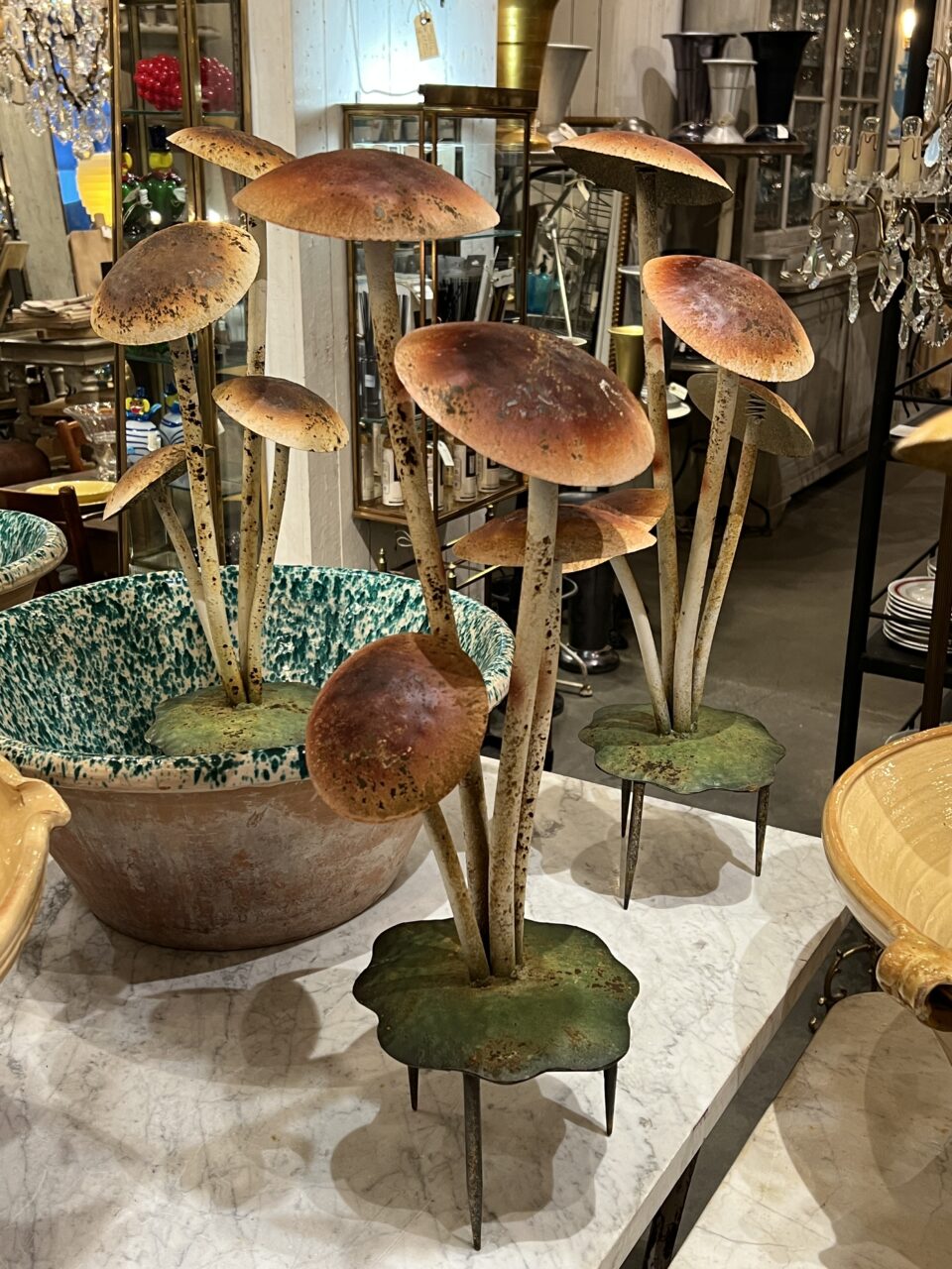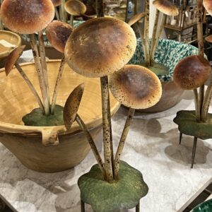 Dekorativ havesvamp i metal, med et rustikt udtryk.