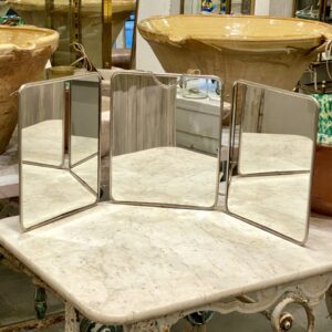 Spejlet kan hæges op og foldes helt ud eller stå en smule foldet. Et dekorativt og stemningsgivende spejl fra omkring 1930-40’erne.