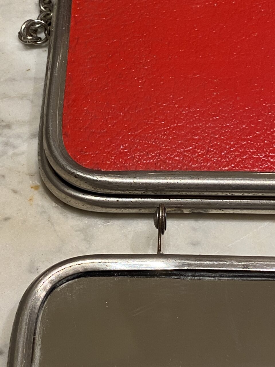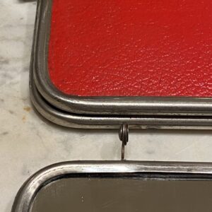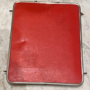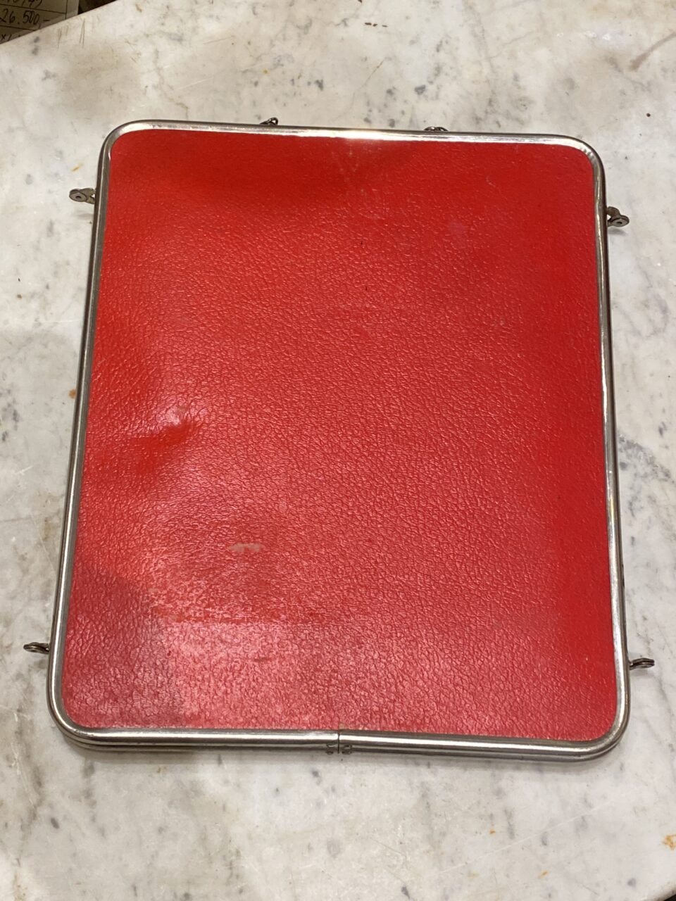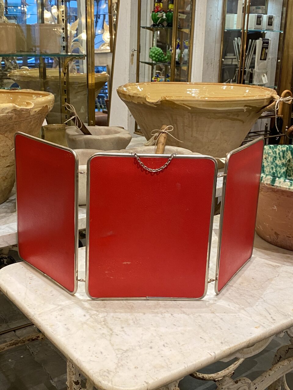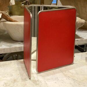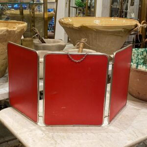 Charmerende stort gammelt fransk 3-fløjet bordspejl/rejsespejl, med patineret ramme i krom og originalt spejlglas. Fin bagbeklædning med præget mønster i en flot stærk rød farve.