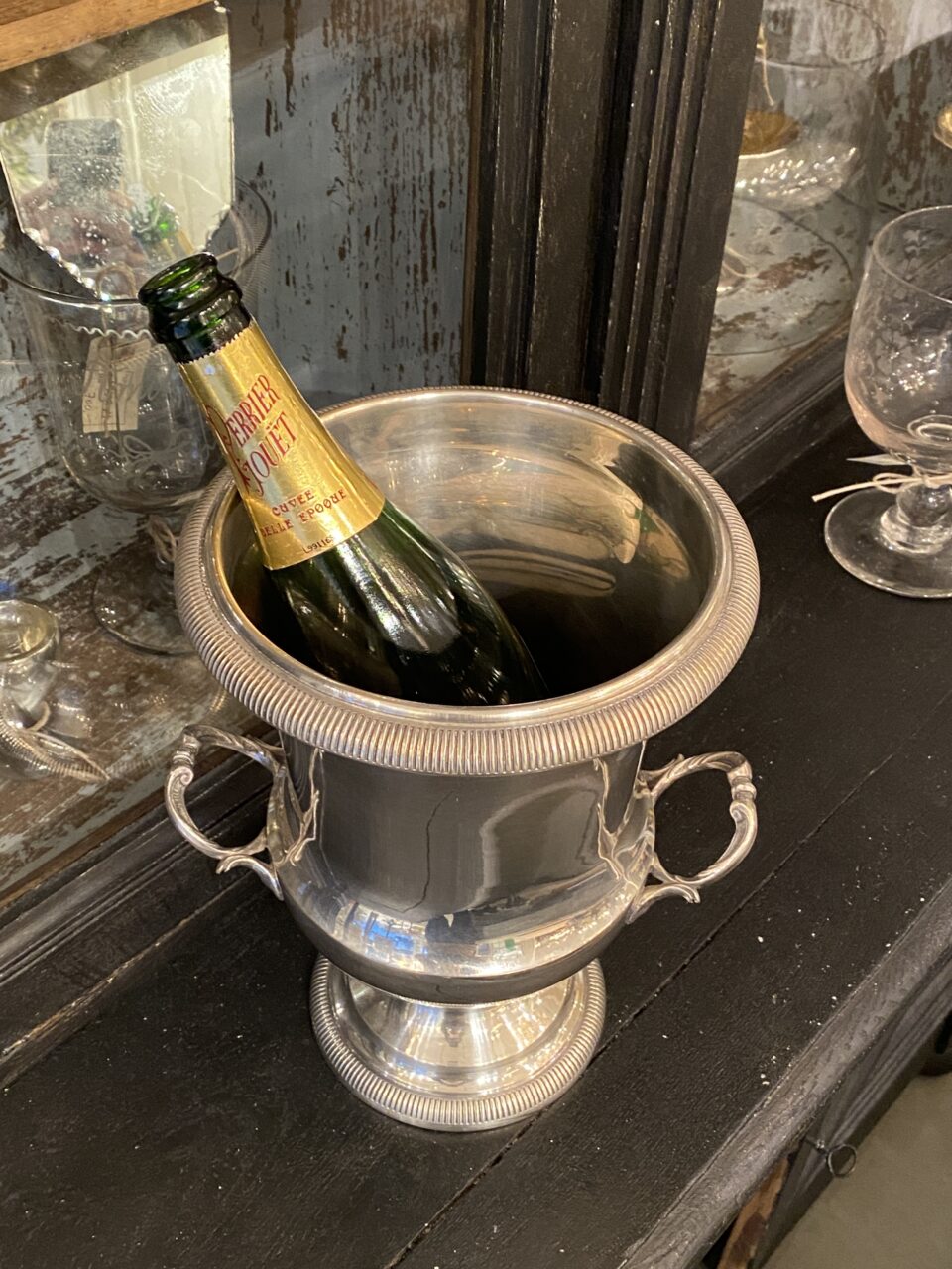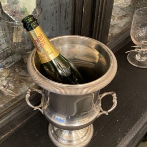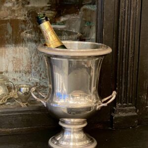 Elegant gammel fransk champagnekøler forsølvet messing hævet op på fod, med smuk riflet afslutning rundt på kanten i toppen, samt på kølerens fod.