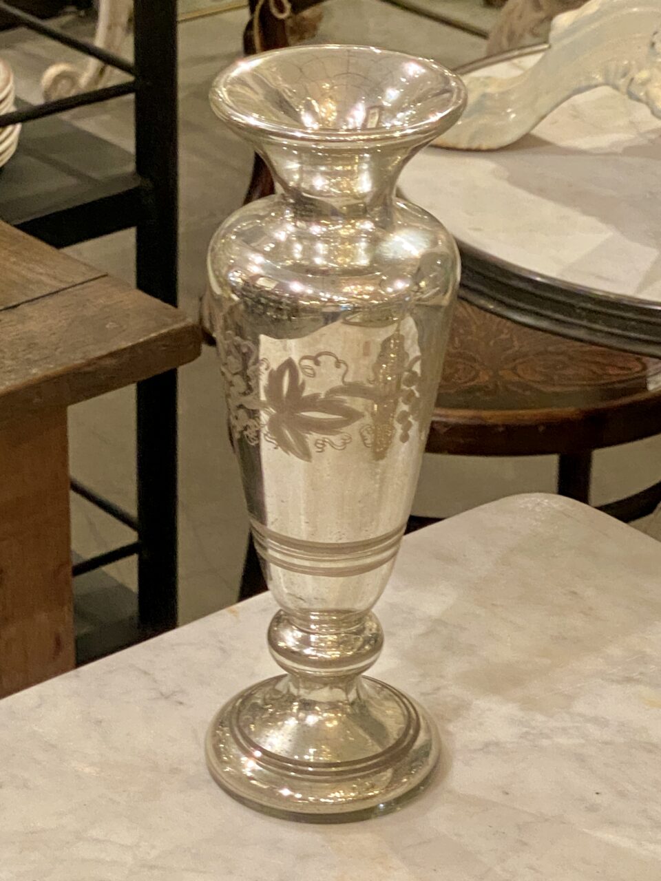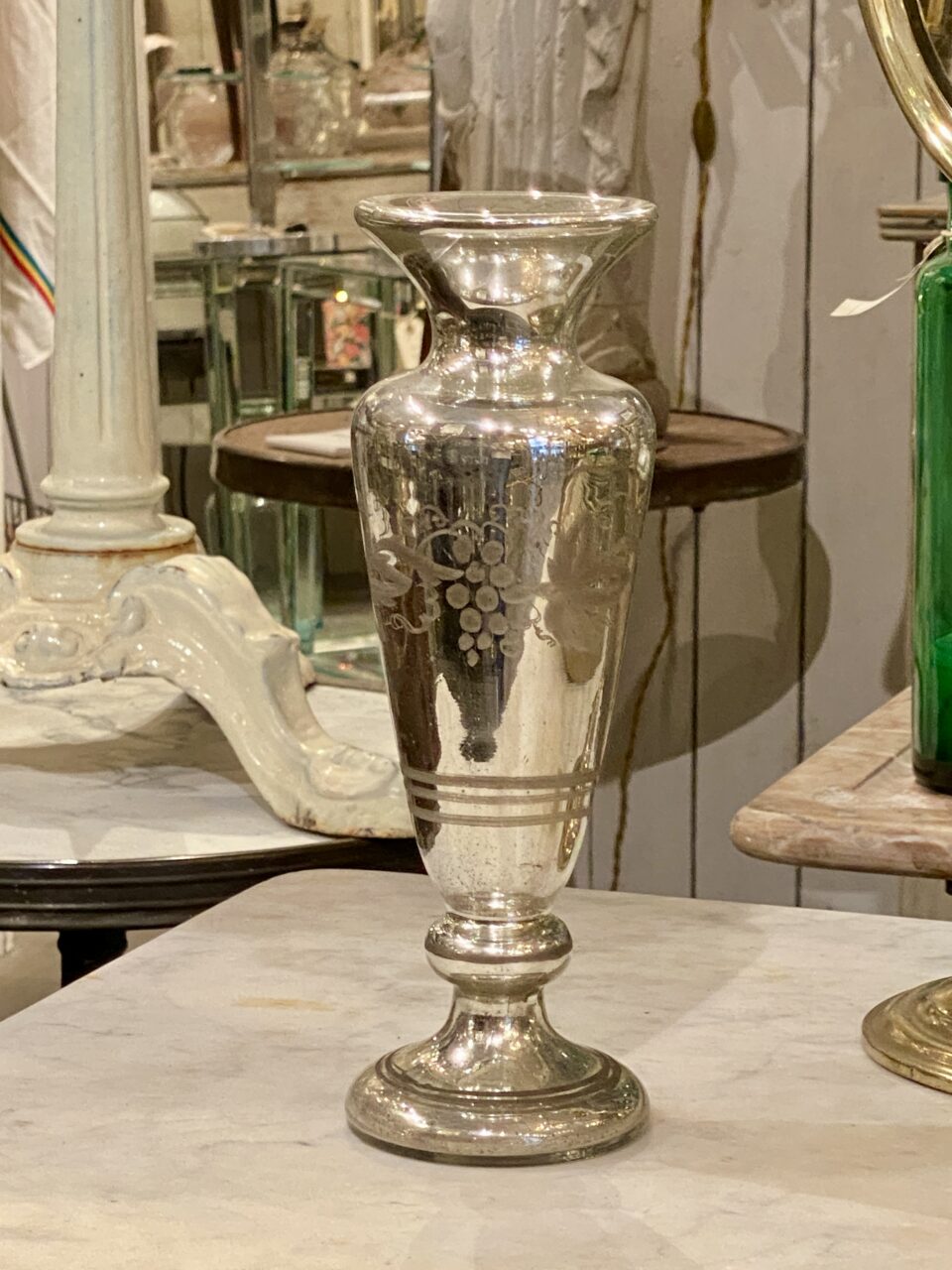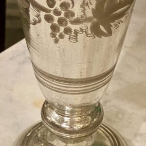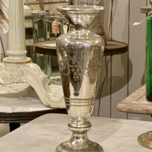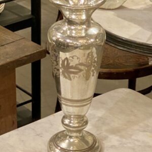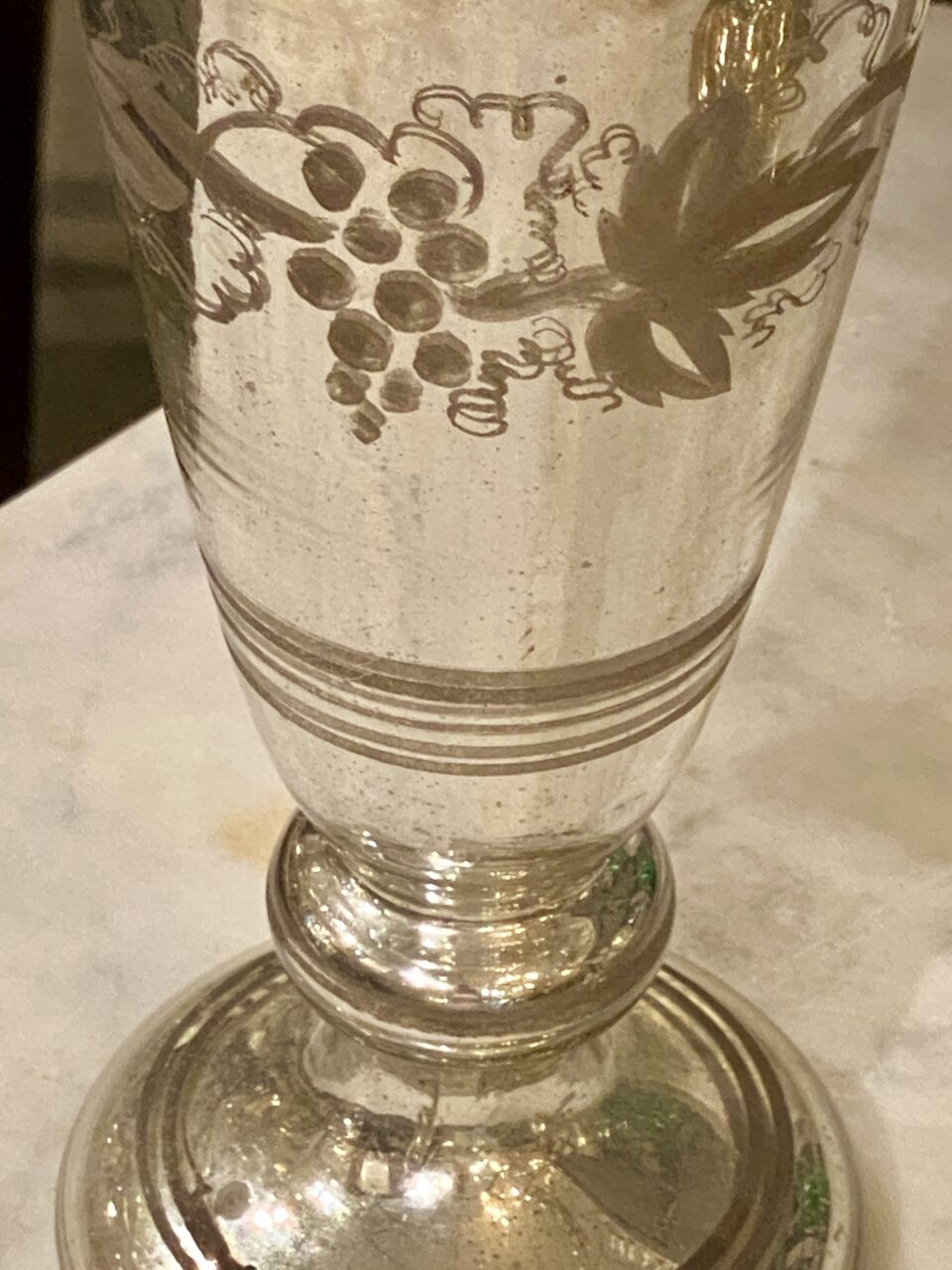 Flot stor antik fransk fattigmandsvase i mundblæst glas med flot kviksølvsbelægning indvendigt. Vasens yderside er smukt dekoreret med rester af hvide druer og blade.