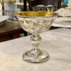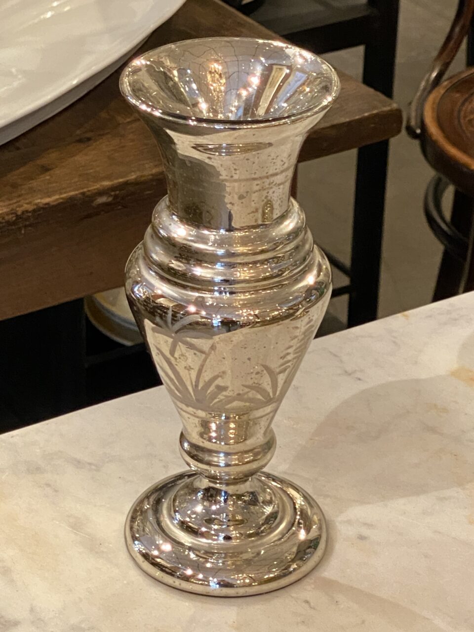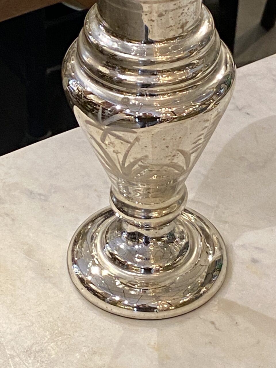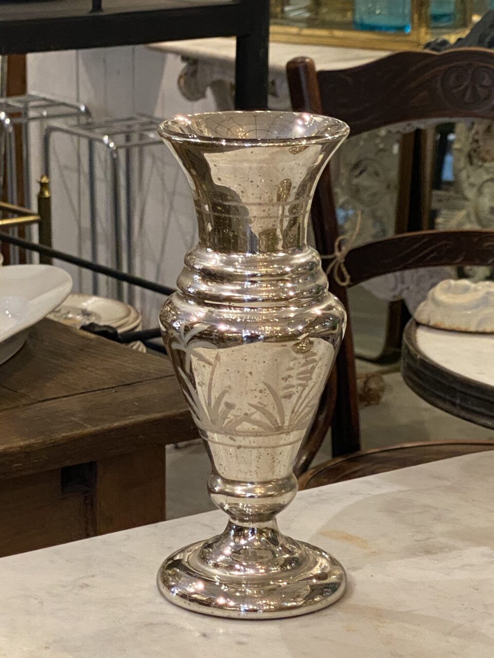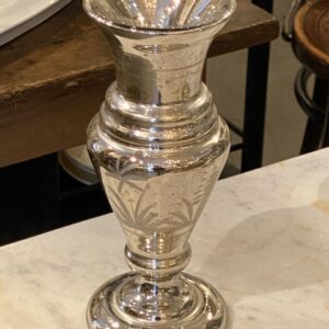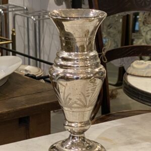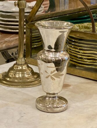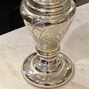 Flot stor antik fransk fattigmandsvase i mundblæst glas med flot kviksølvsbelægning indvendigt. Vasens yderside er smukt dekoreret med rester af hvide blomster.