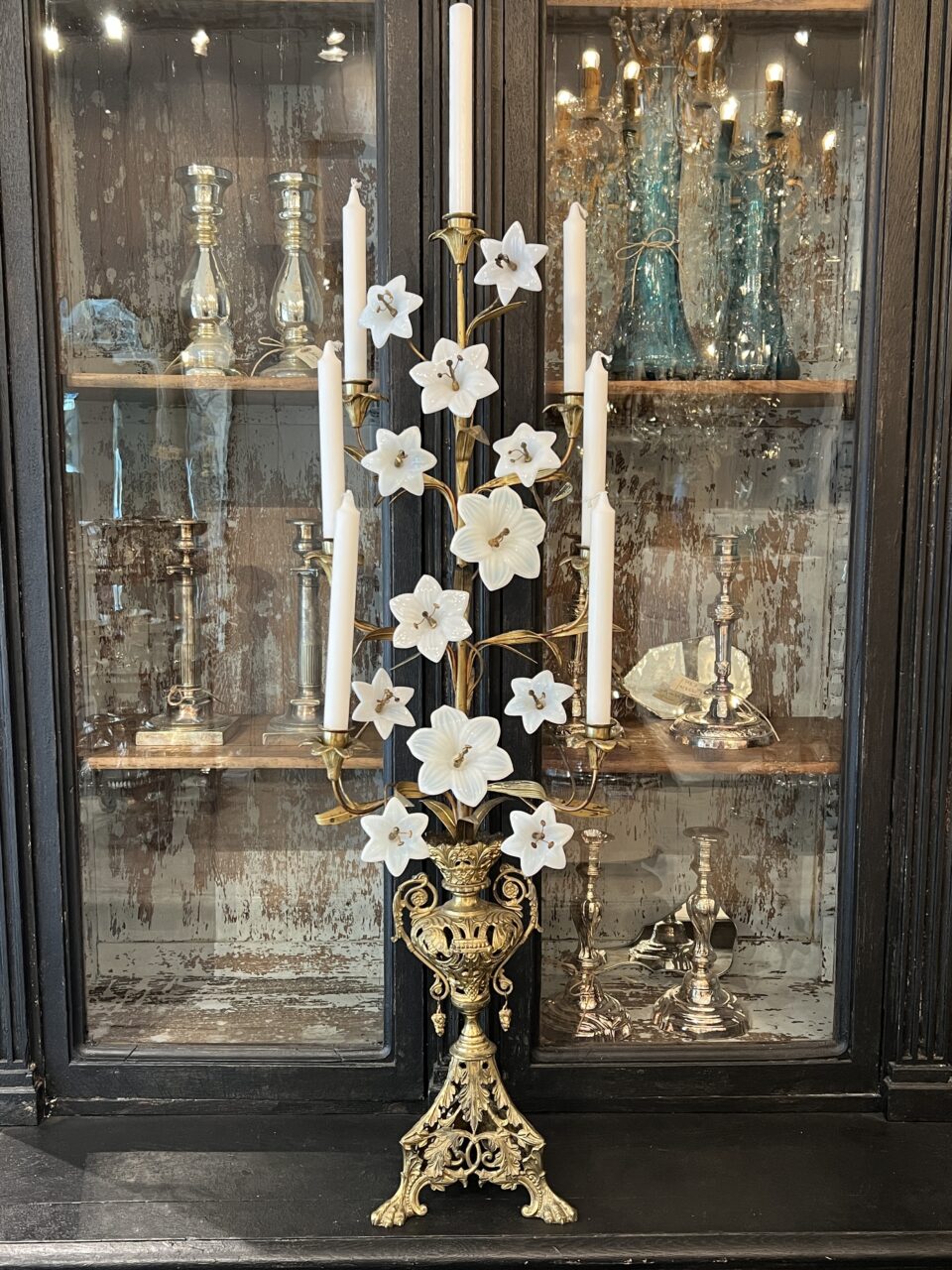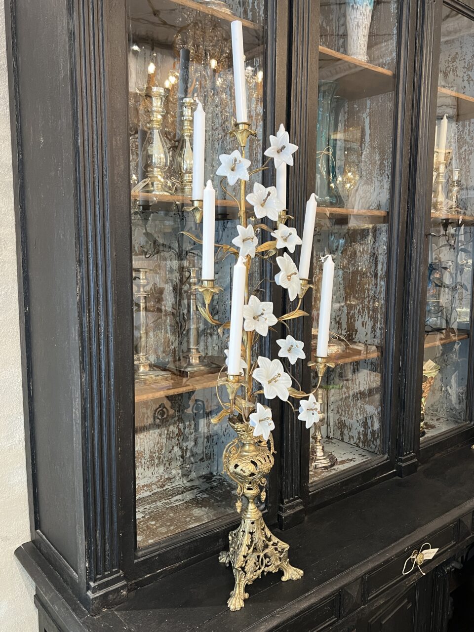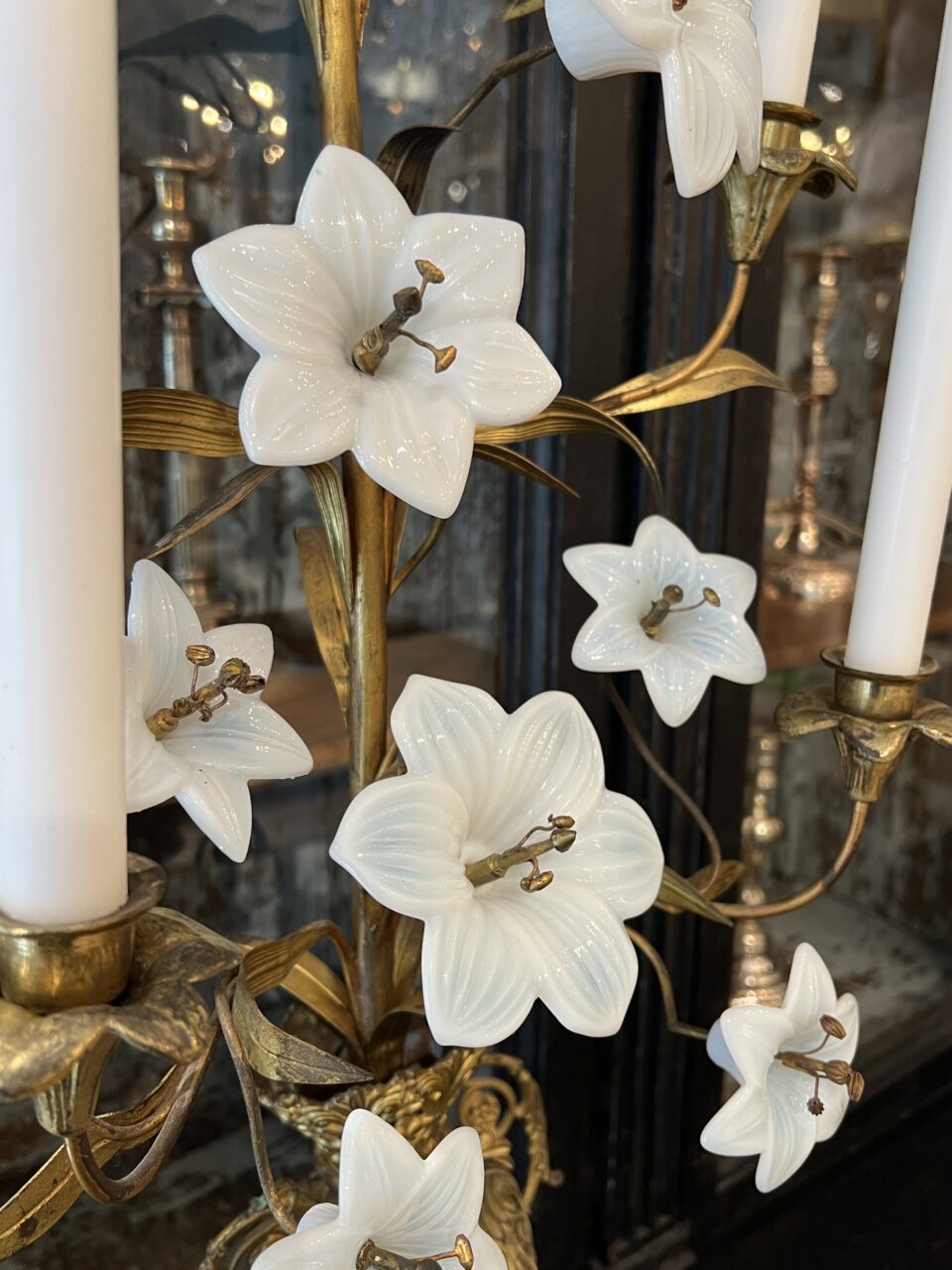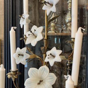 Stor Antik fransk kirkestage, smukt er dekoreret med hele 12 opalglas liljeblomster i forskellige størrelser