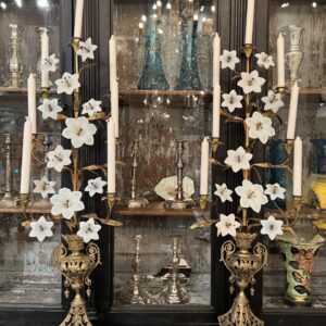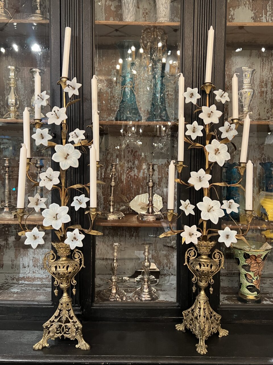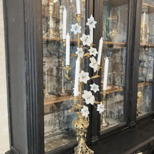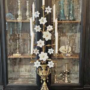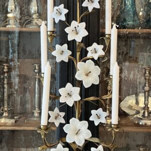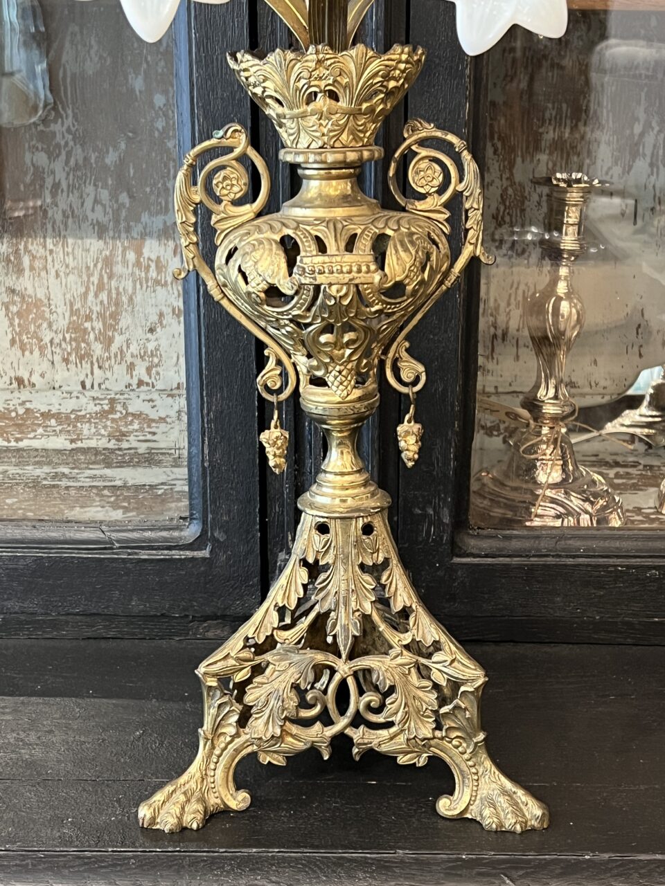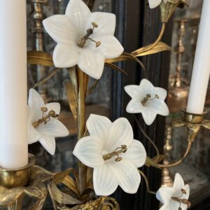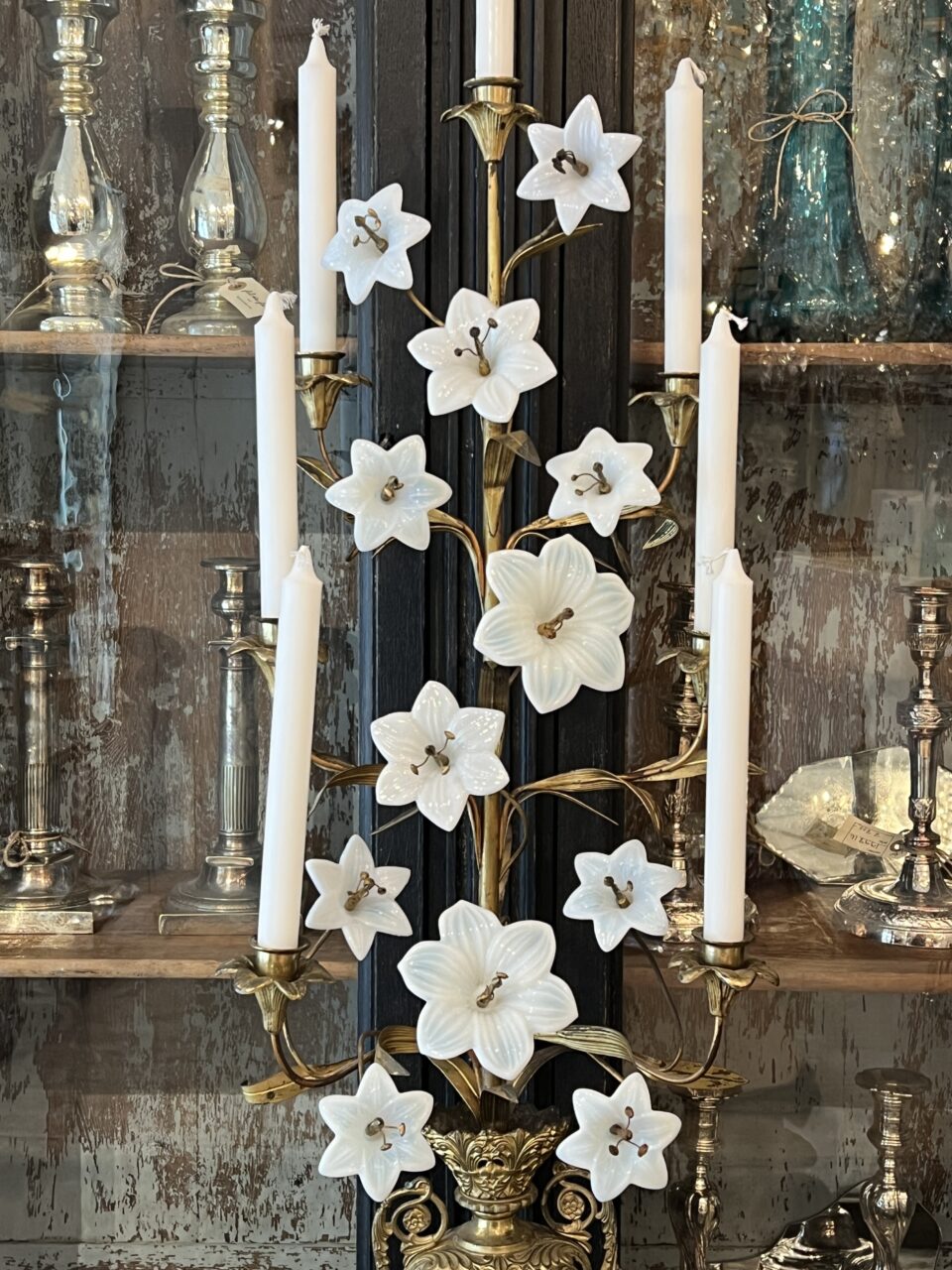 Stor Antik fransk kirkestage, smukt er dekoreret med hele 12 opalglas liljeblomster i forskellige størrelser