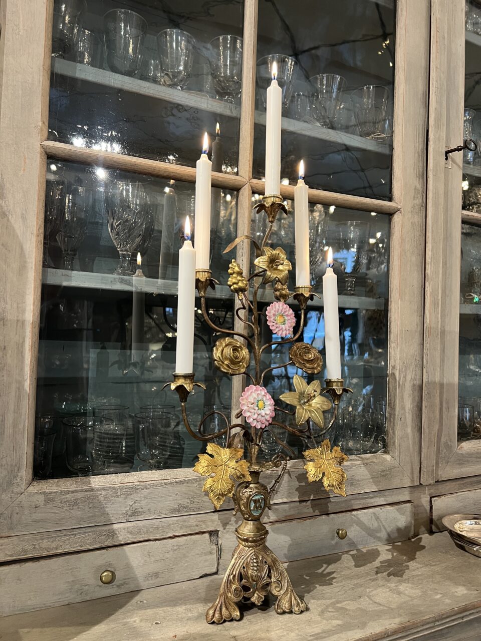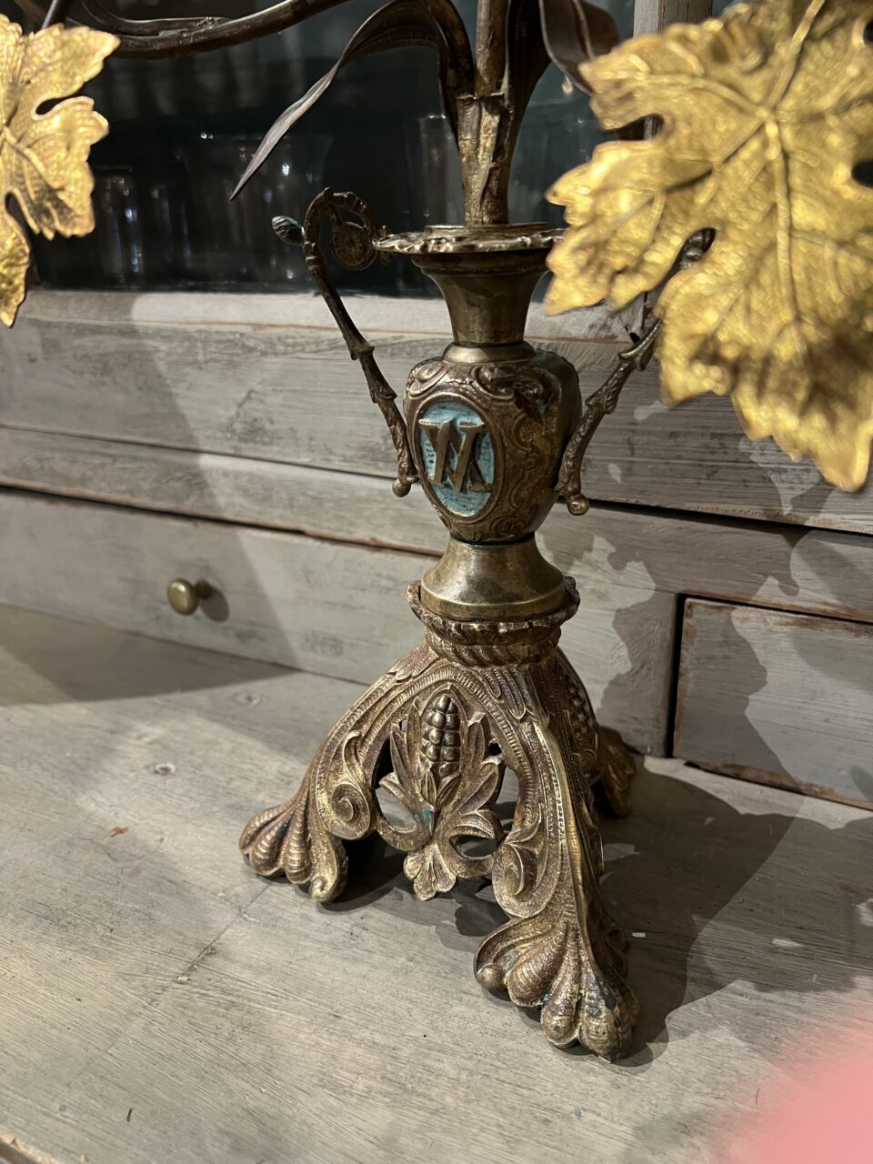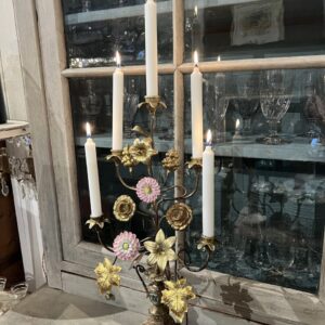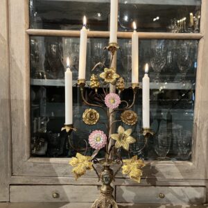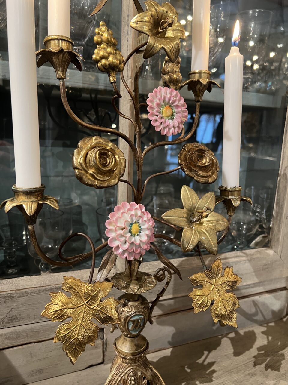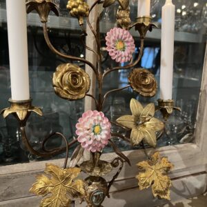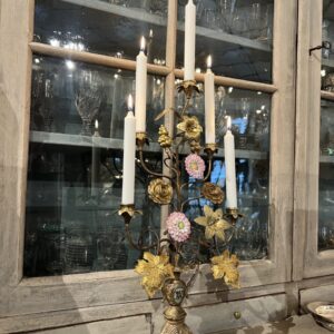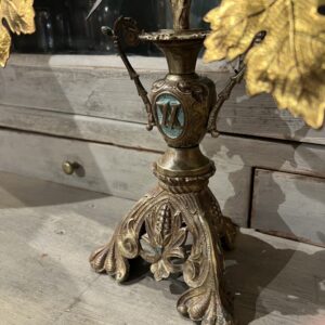 Gammel fransk kirkestage ,i smukt forgyldt bronze, fint dekoreret med 2 fine porcelænsblomster, franske liljer, drueklaser og vinblade.