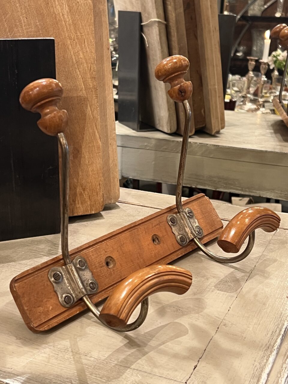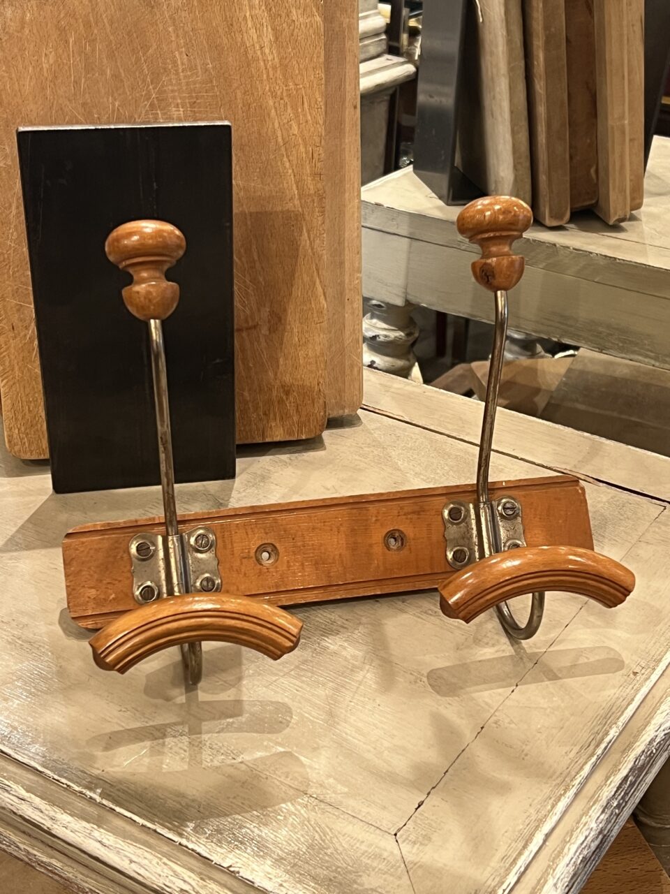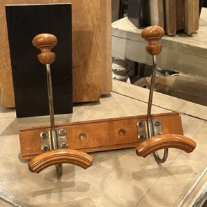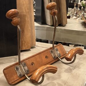 Skøn gammel fransk knagerække med to hatteknager i jern og træ.